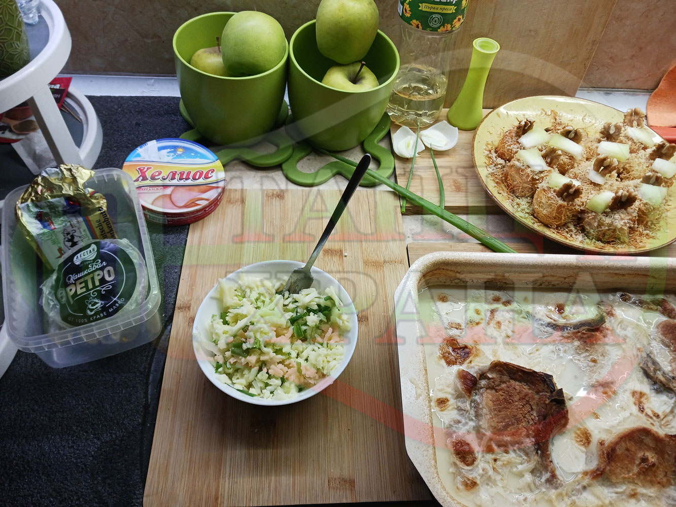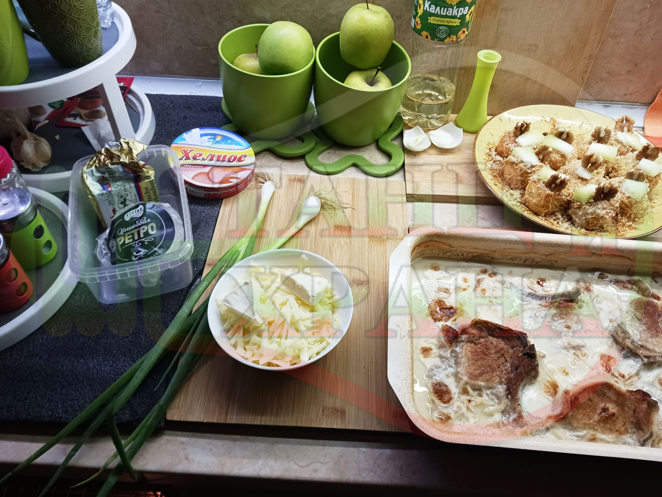 В "Свързани продукти" вижте рецептите на други видове пържоли приготвени на фурна, ястия с лук, прясно мляко, различни салати и яхнии със свинско месо и техни"ТЕ" производни.
