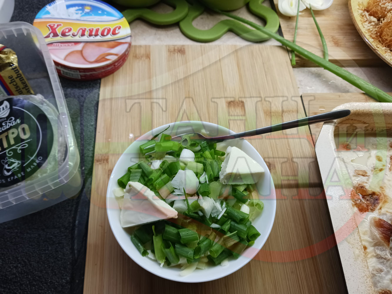 Настържете кашкавала на едро в купа и добавете топеното сирене и измития, почистен и нарязан на едро пресен лук (заделете част от перцата на лука за украса). Разбъркайте и намачкайте с вилица за да се овкусят продуктите до образуване на средно гъста кашкавалено топеносиренова, хомогенизирана смес.
