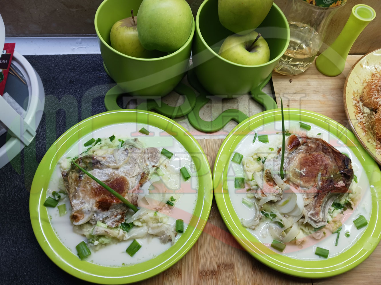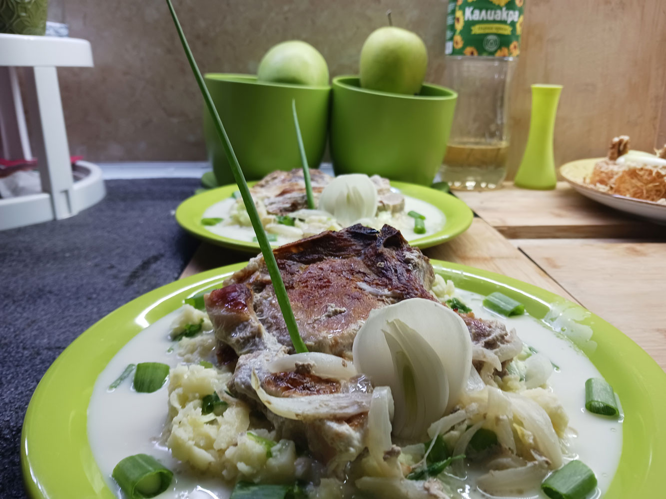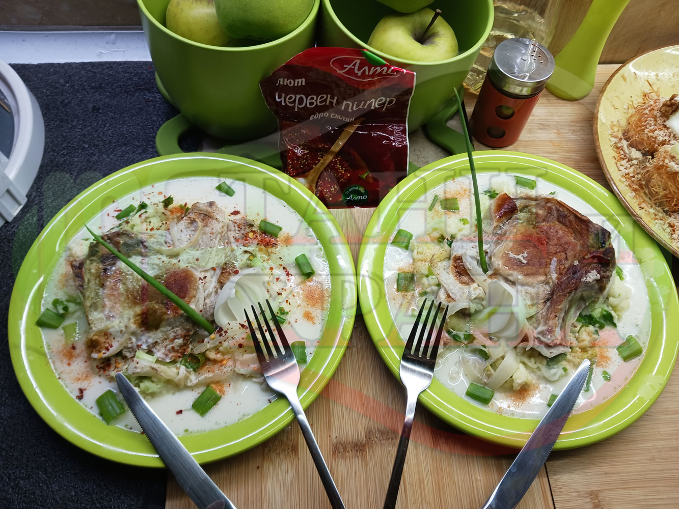 Толкова крехки, толкова млечни, толкова сочни и толкова вкусни пържоли, запечени на фурна с кромид лук и прясно мляко. Гарнирах пържолите в кладенче от пресен лук, топено сирене и млечен кашкавал, което леко се разтопява от горещото прясно мляко и дообогатява вкуса на пържолите с различни свежи вкусове и текстури в комбинация с прясното мляко се получи голяма вкусно, вкусна, вкусотия (вкуснотия)...![]()