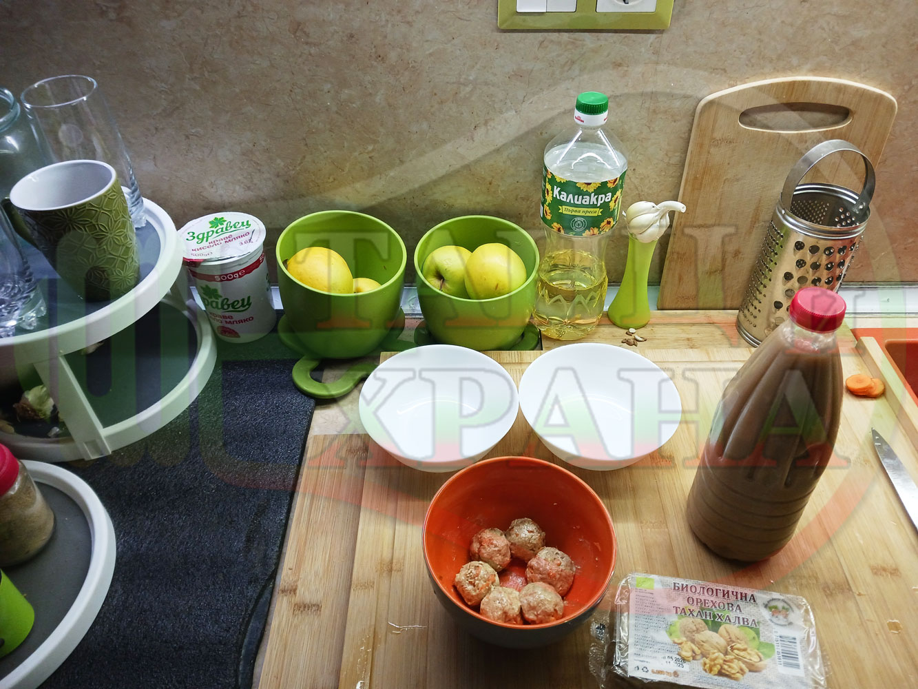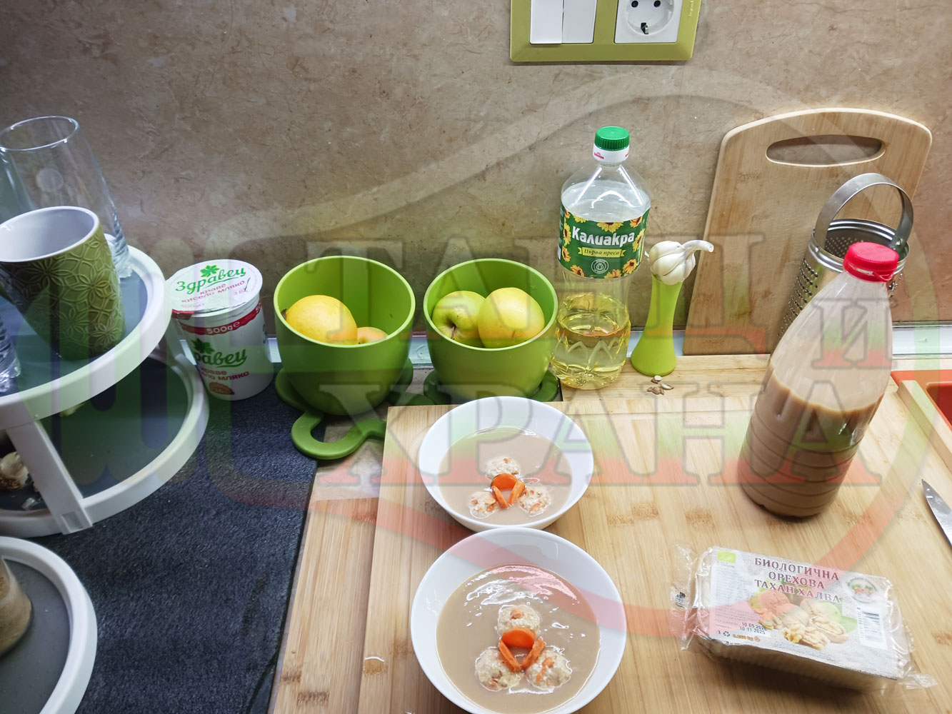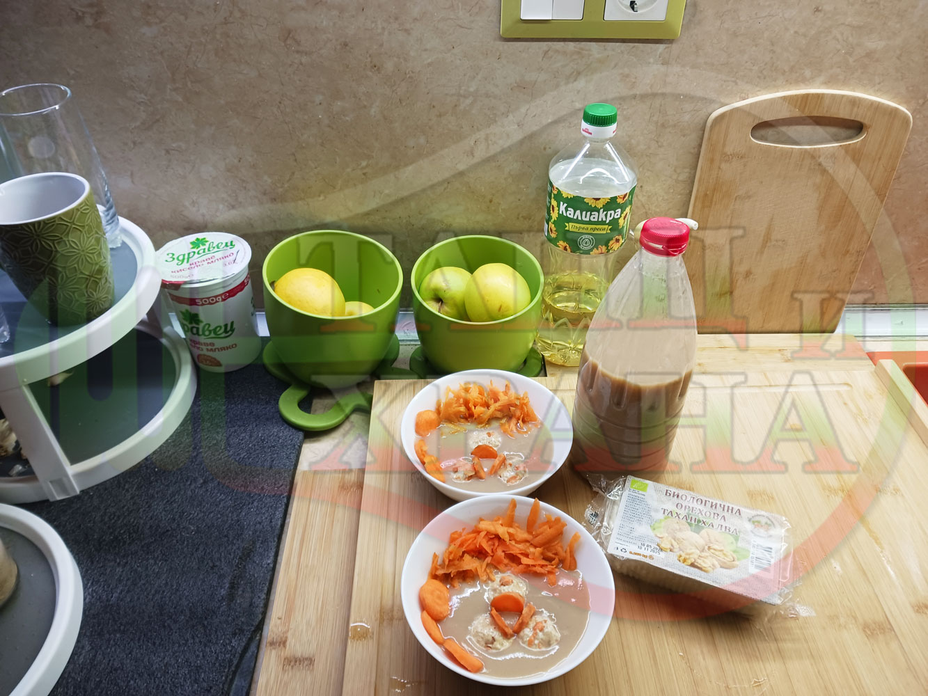 ПРОДУКТИ: Приблизителни количества за българска бозова сурова сладка супа "Бозаджийноморковена халвяноорехова" приготвена от боза гарнирана с топчета от халвяно морковен крем с пресни моркови и тахан халва с орехи подходяща за постещи хора - двукомпонентна