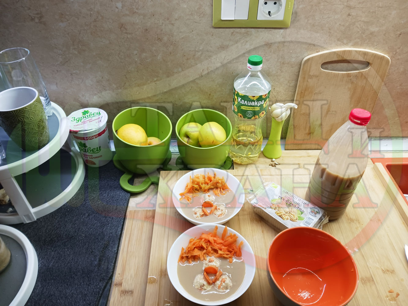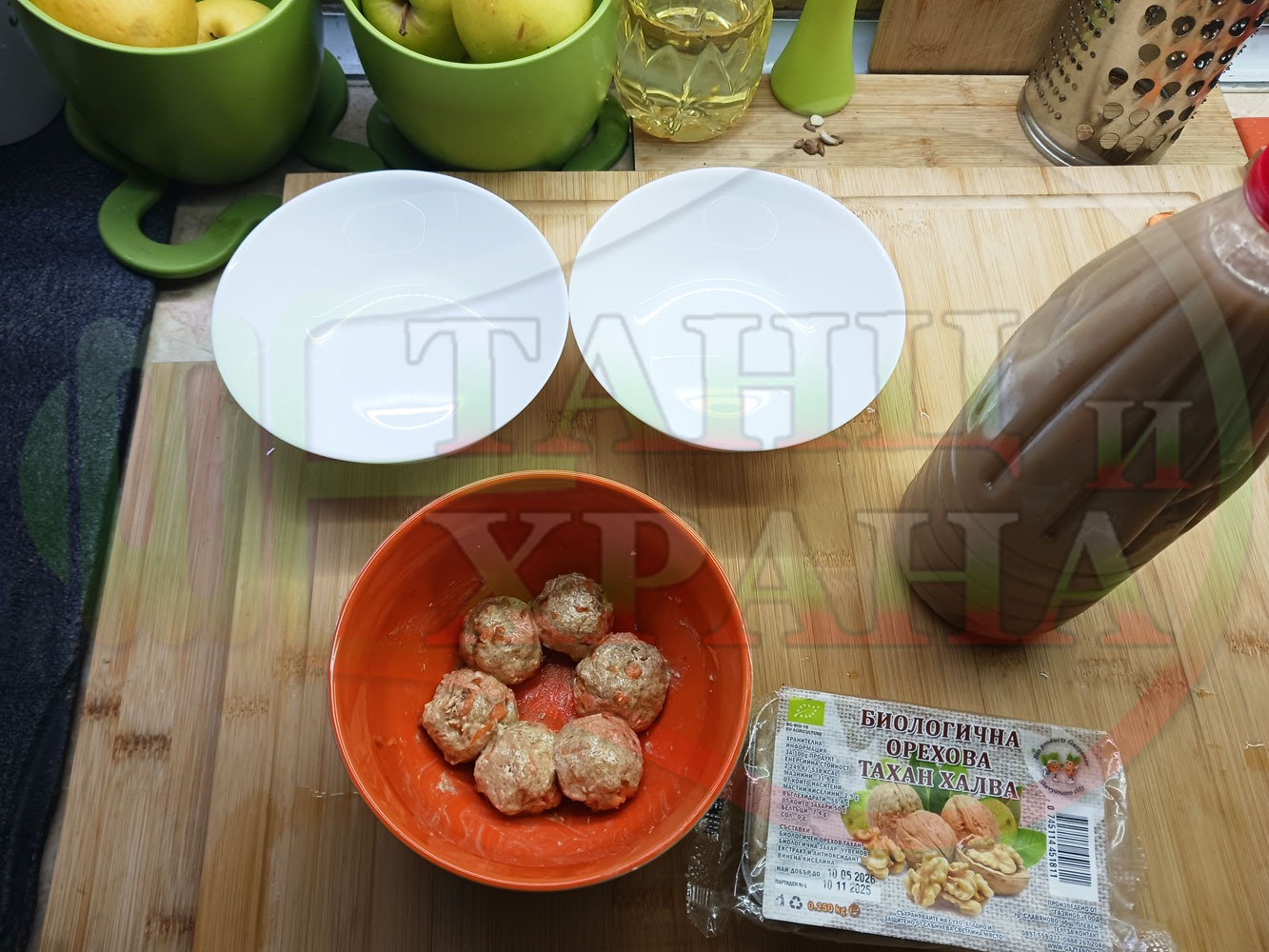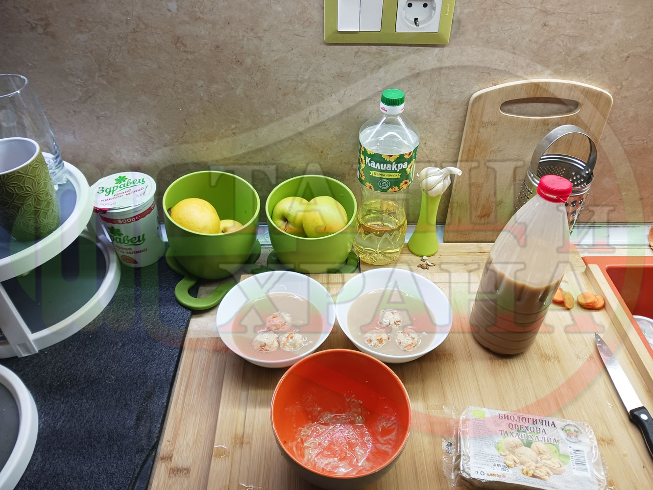 ПРОДУКТИ: Приблизителни количества за българска бозова сурова сладка супа "Бозаджийноморковена халвяноорехова" приготвена от боза гарнирана с топчета от халвяно морковен крем с пресни моркови и тахан халва с орехи подходяща за постещи хора - двукомпонентна