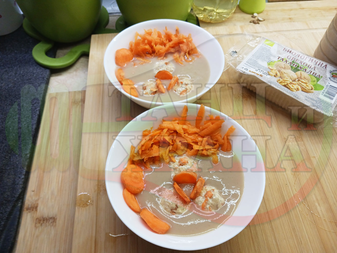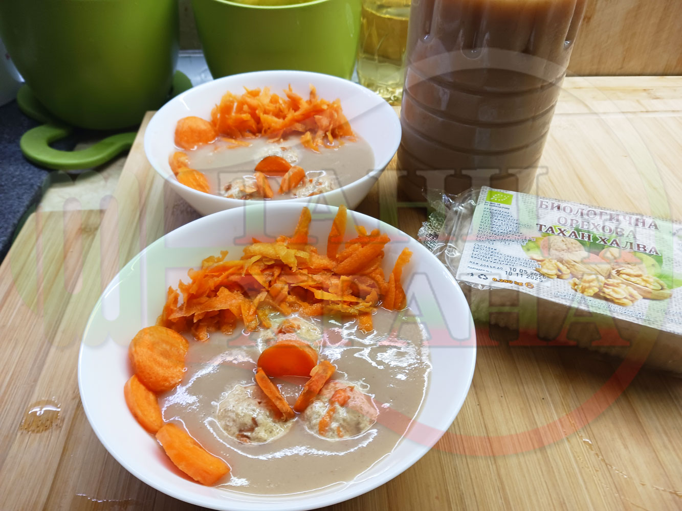 Българска бозова сурова сладка супа "Бозаджийноморковена халвяноорехова" приготвена от боза гарнирана с топчета от халвяно морковен крем с пресни моркови и тахан халва с орехи подходяща за постещи хора - двукомпонентна