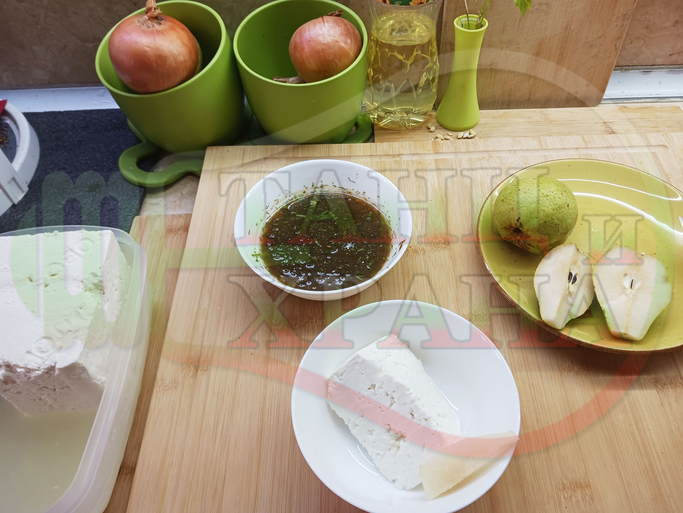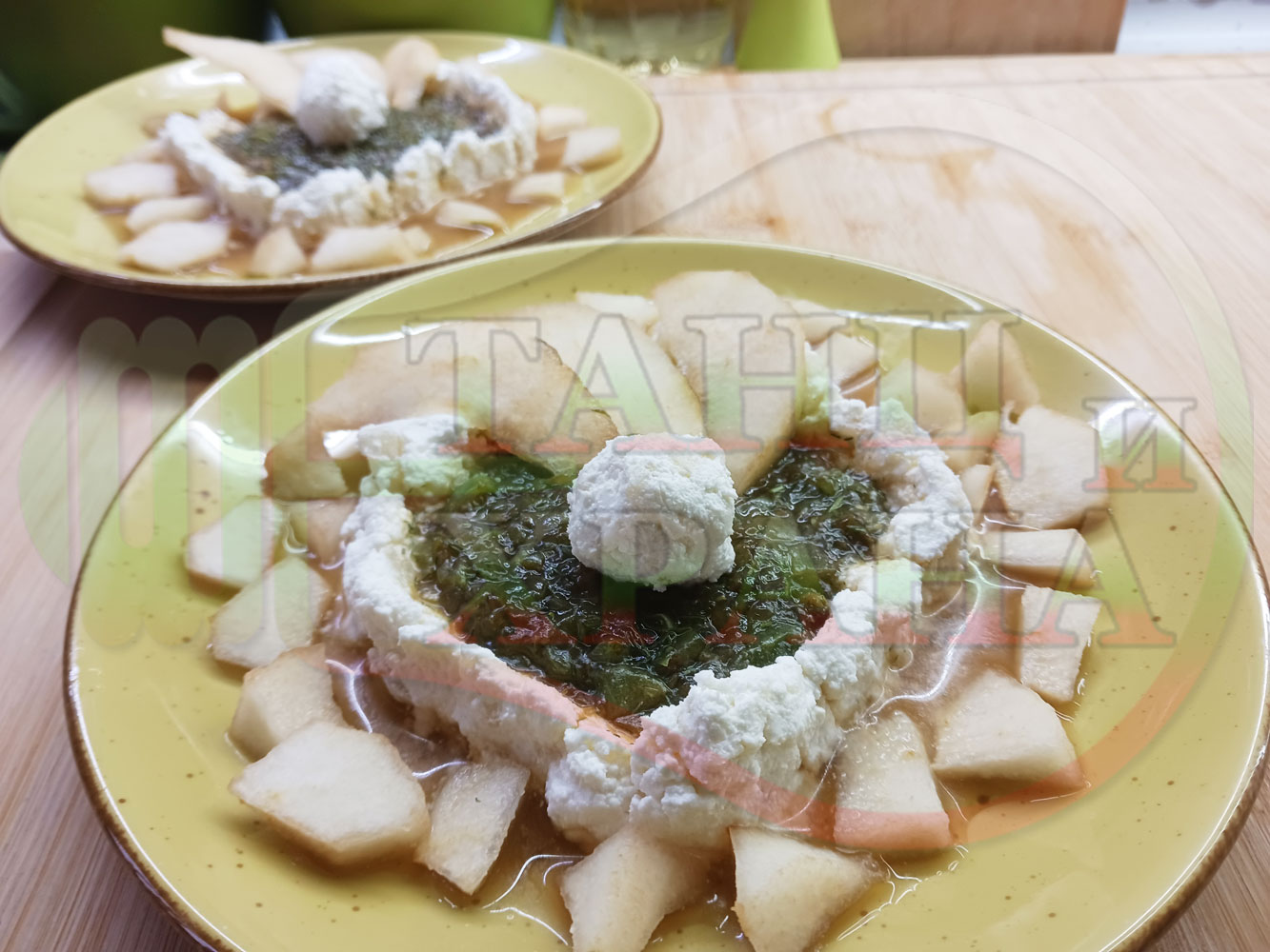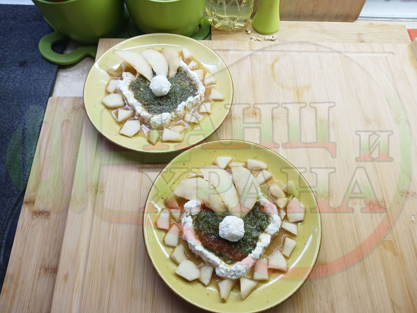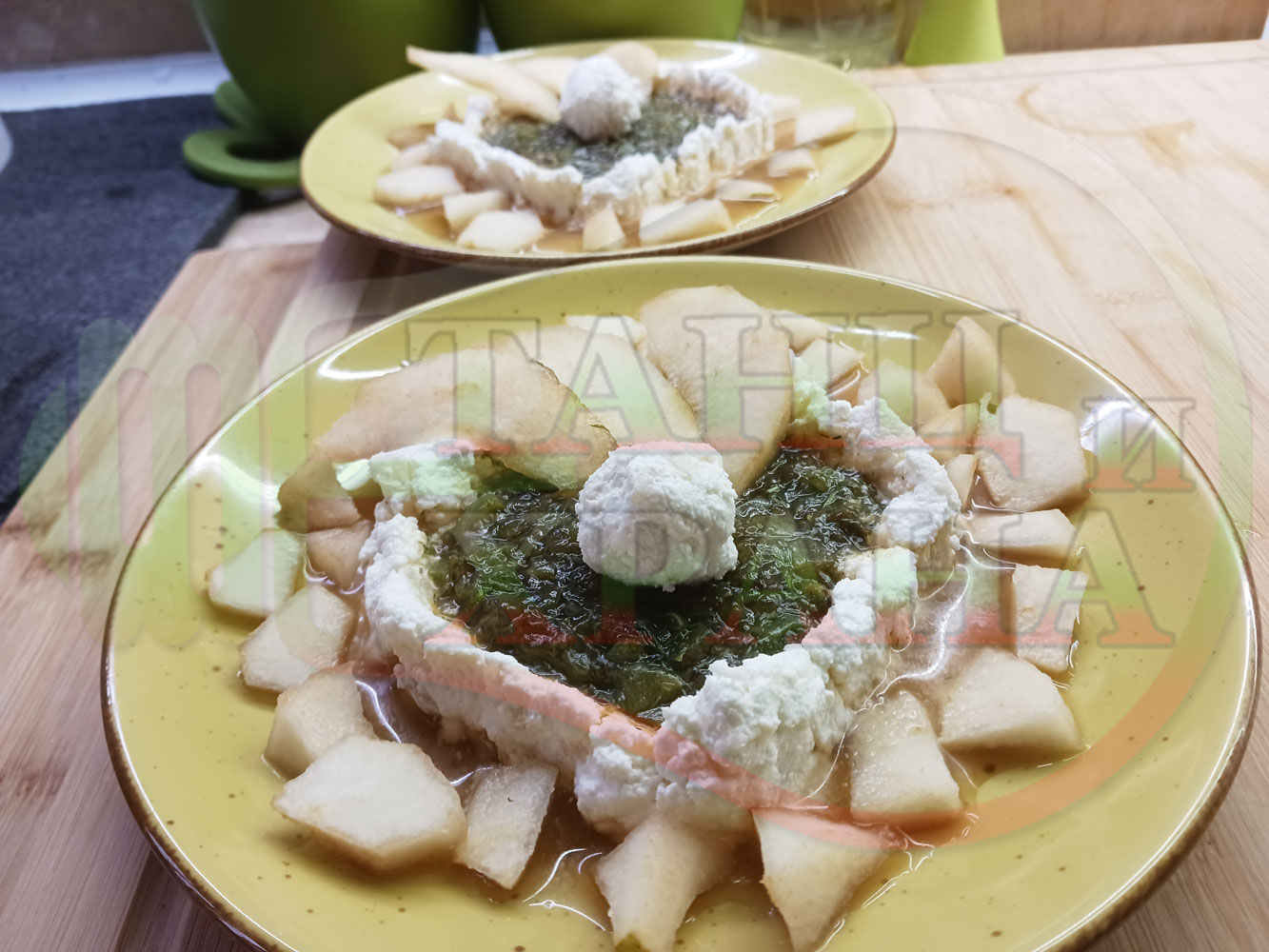 Българска студена сурова сладко солена супа "Гроздовокопърова сиреновокрушова с БГсирене" приготвена с прясно грозде и свеж копър напълнена в кладенчета от сиреново крушов крем с круши и краве бяло сирене (българско, саламурено) - производна