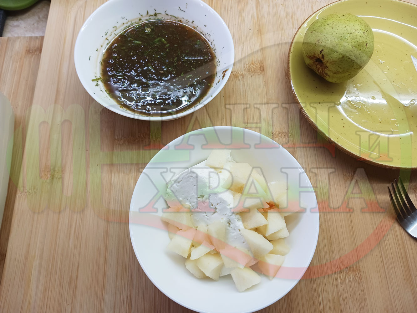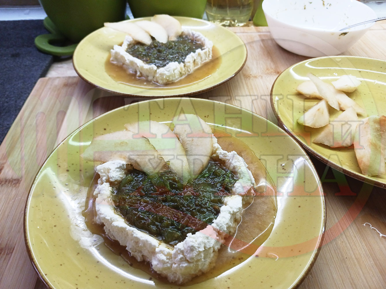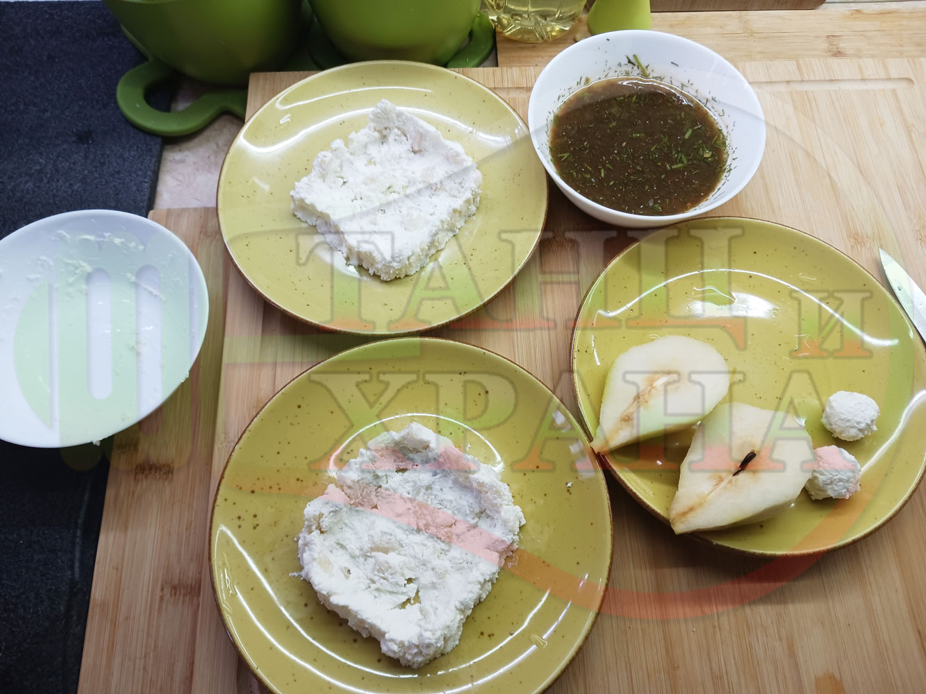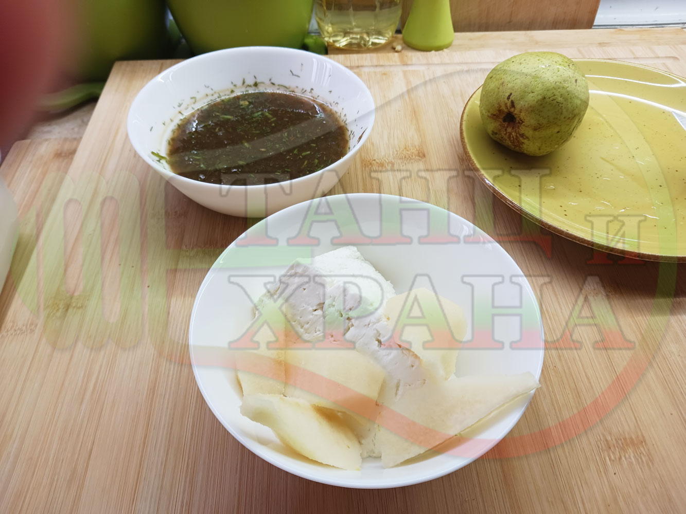 Българска студена сурова сладко солена супа "Гроздовокопърова сиреновокрушова с БГсирене" приготвена с прясно грозде и свеж копър напълнена в кладенчета от сиреново крушов крем с круши и краве бяло сирене (българско, саламурено) - производна
