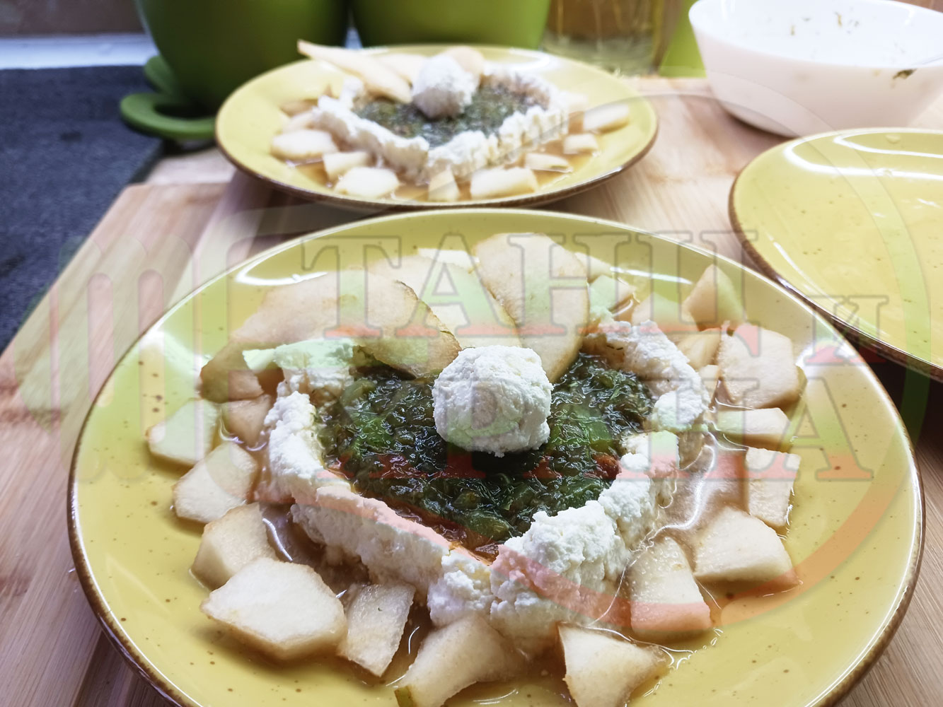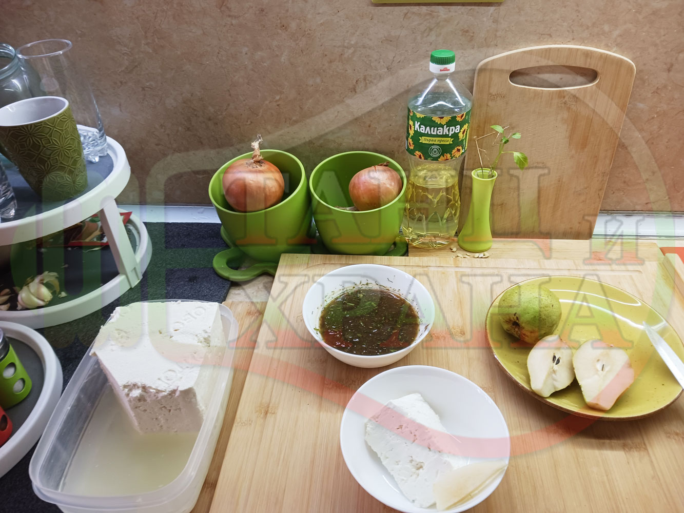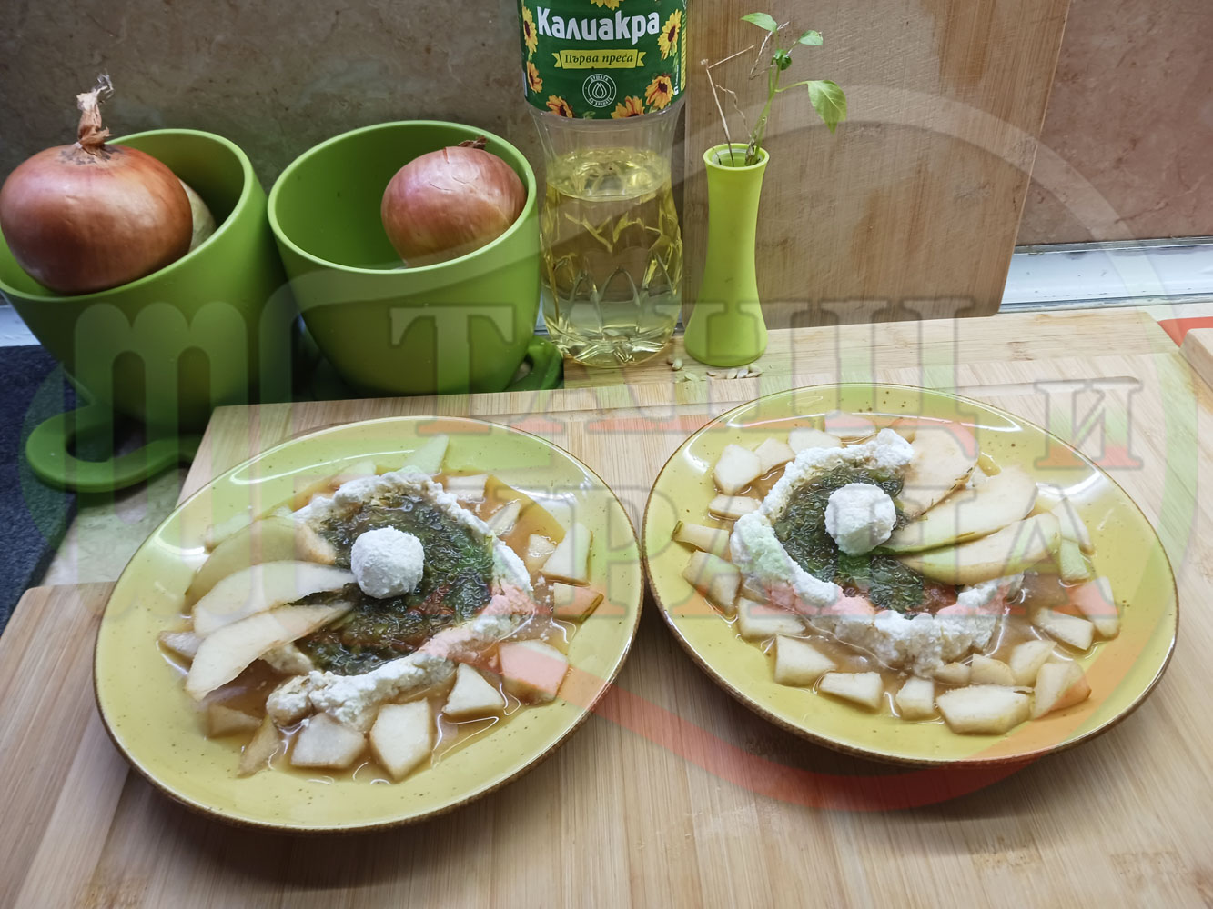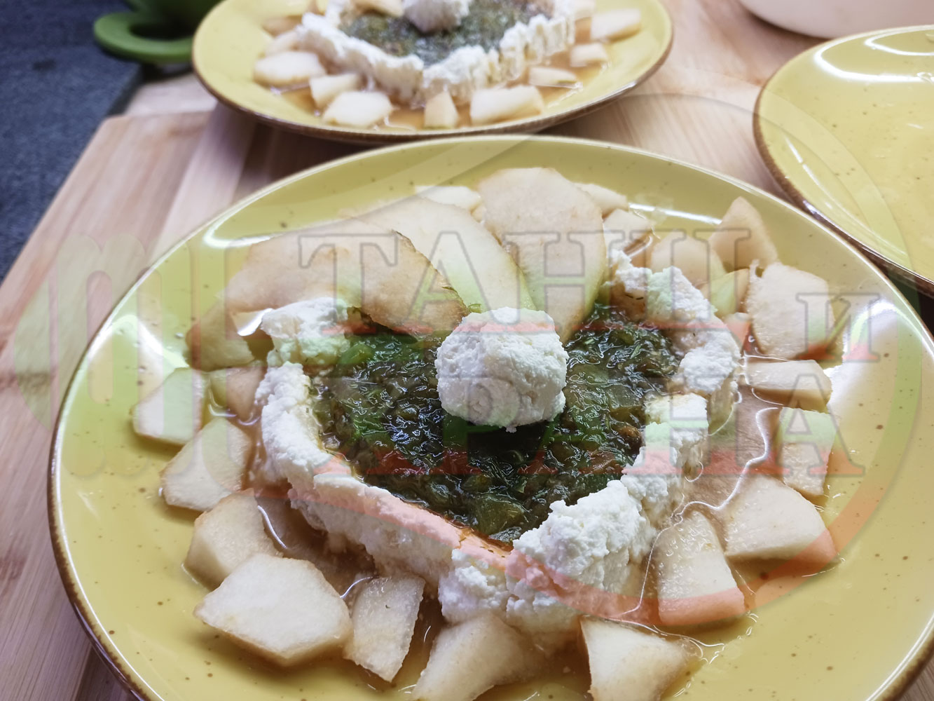 Българска студена сурова сладко солена супа "Гроздовокопърова сиреновокрушова с БГсирене" приготвена с прясно грозде и свеж копър напълнена в кладенчета от сиреново крушов крем с круши и краве бяло сирене (българско, саламурено) - производна