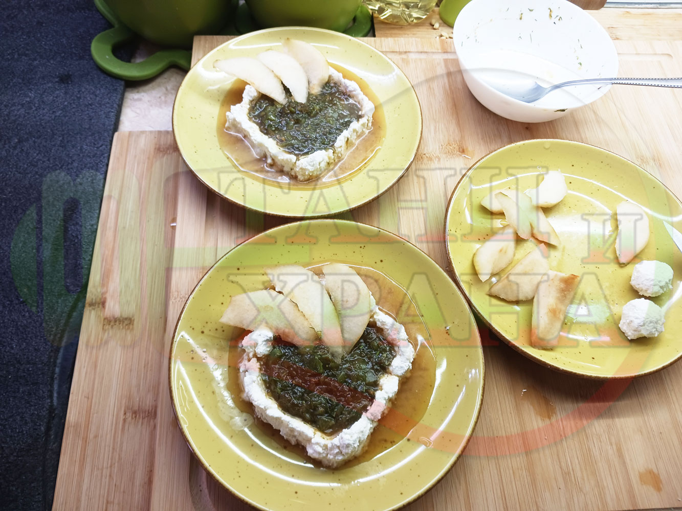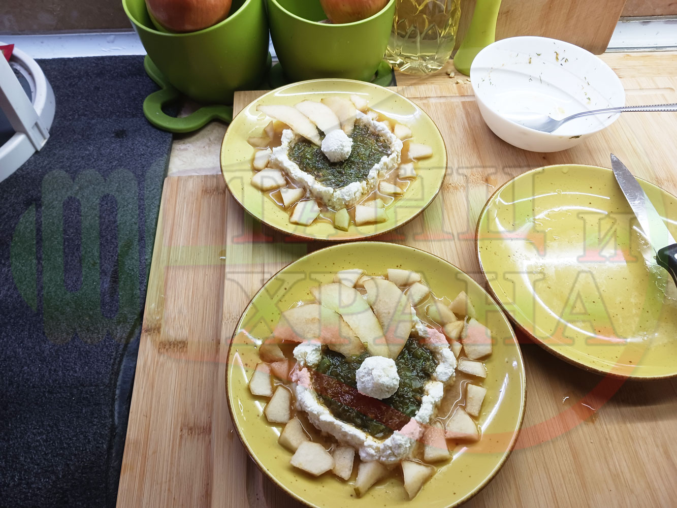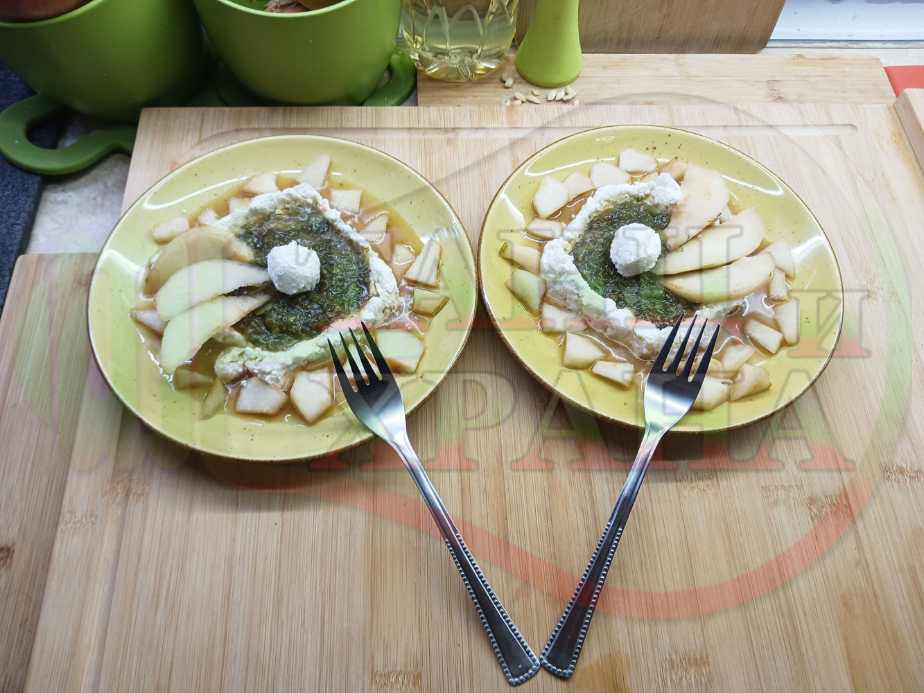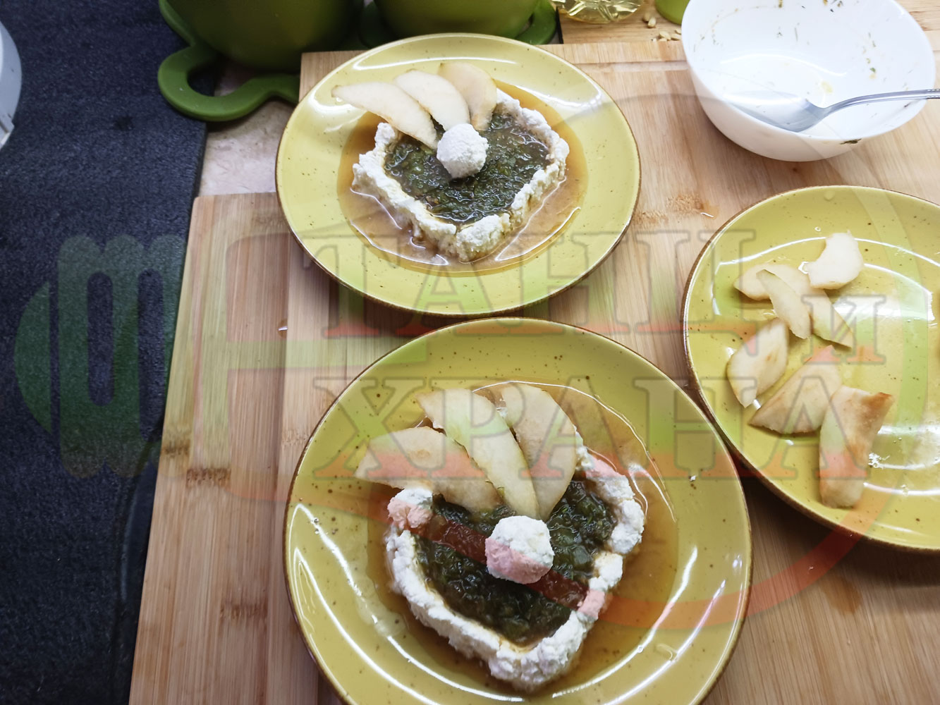 Спретнах производна сладко солена сурова супа от заделената основно приготвена "Гроздовокопърова сиреновоморковена с БГсирене". Реших да разпределя останалото количество от гроздовокопъровата супа и да я напълня в кладенчета от сиреново крушов крем (снимките от приготвянето на супата с чопъра са към основно приготвената гроздовокопърова супа). Гарнирах производната супа с топчета от сиреновия крем и с пресни круши (имайте предвид, че крушите се окисляват бързо и е необходимо да гарнирате непосредствено преди хапване). Червеният лют пипер внася пикантна нотка към супата и определено препоръчвам да поръсите порциите с лютивичко, в случай че обичате да си хапвате леко пикантни ястия. Отново се получи полезна, невероятно вкусно, вкусна, вкусотия (вкуснотия)... ![]()