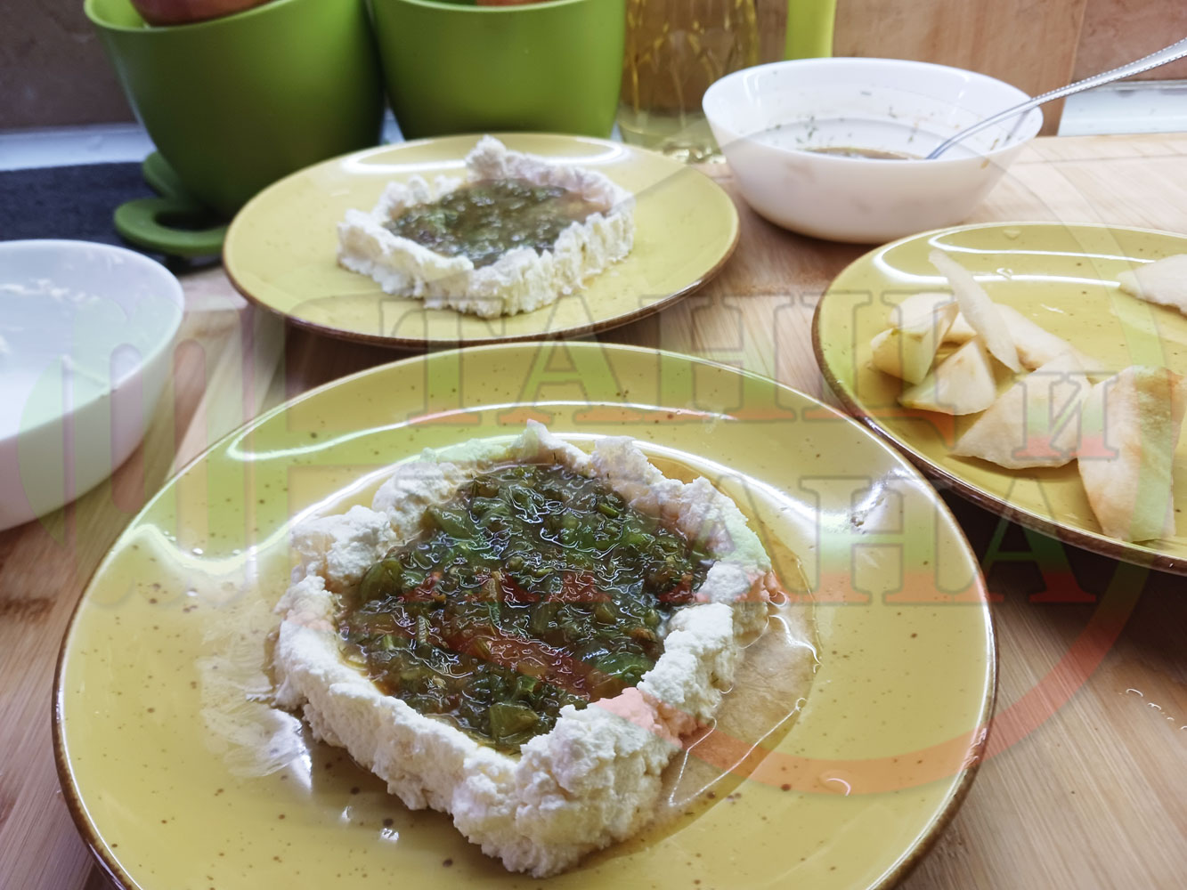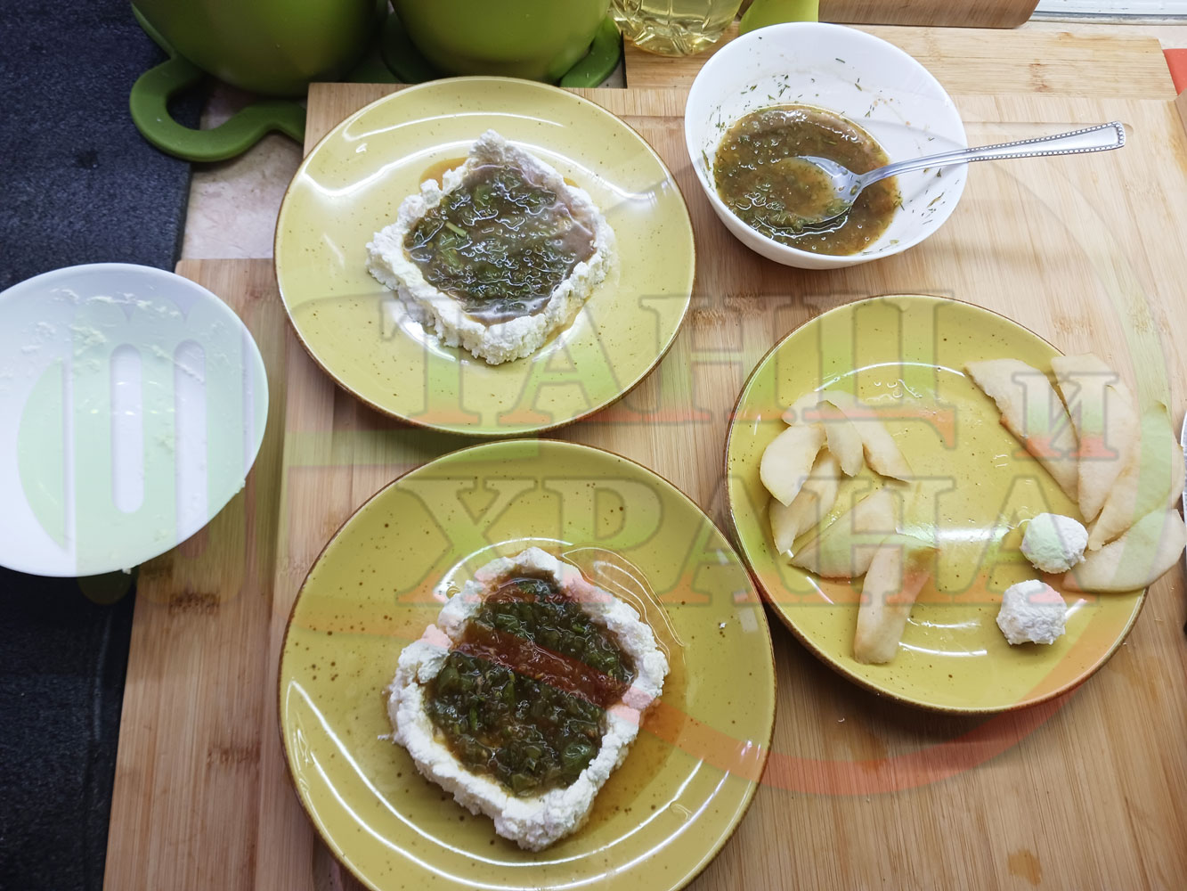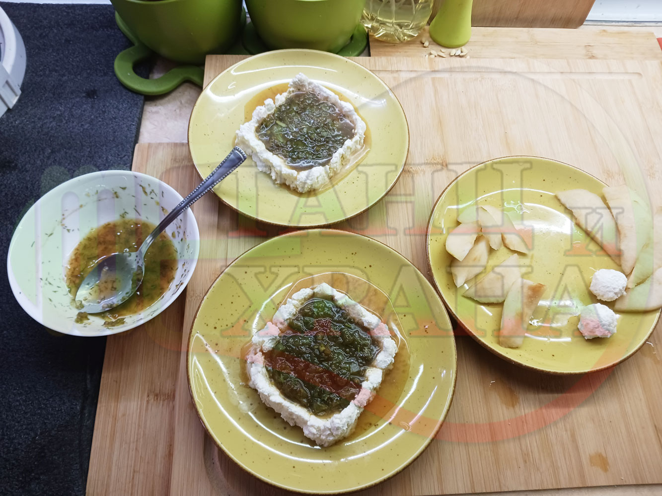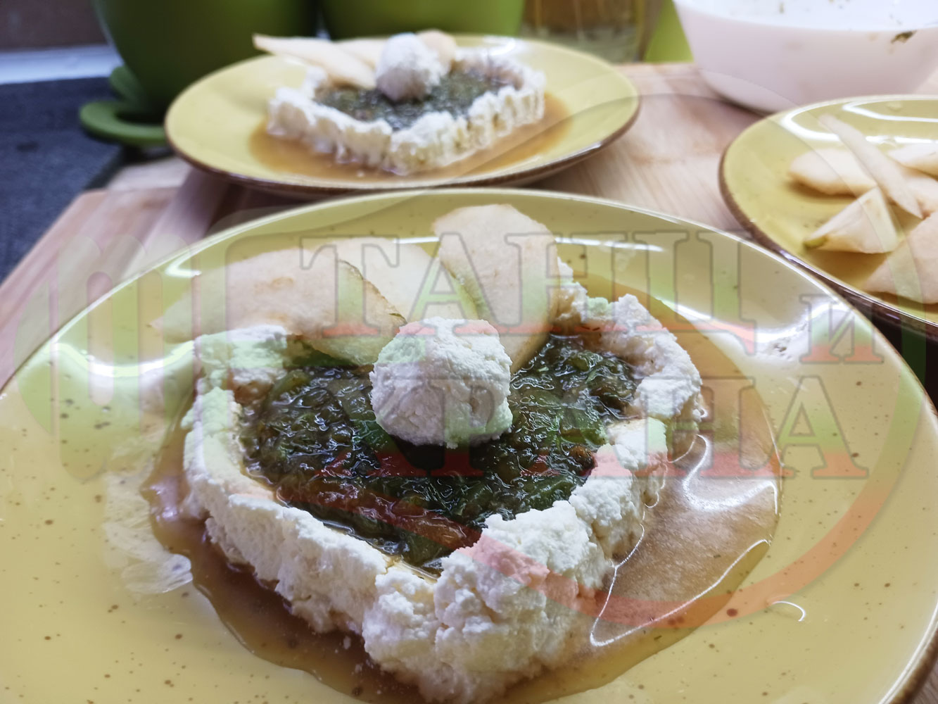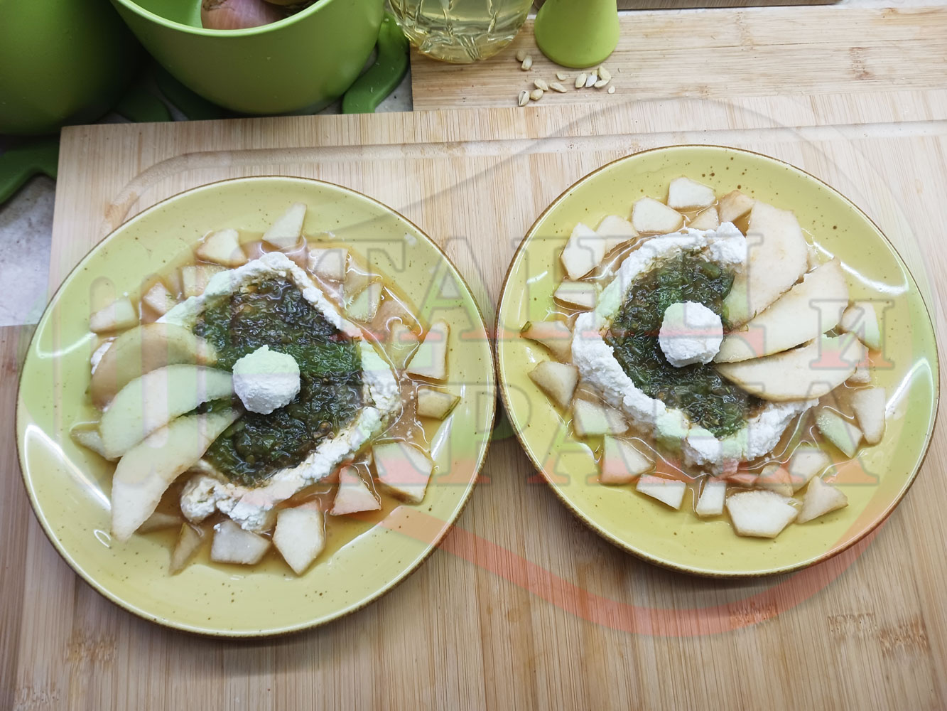 Спретнах производна сладко солена сурова супа от заделената основно приготвена "Гроздовокопърова сиреновоморковена с БГсирене". Реших да разпределя останалото количество от гроздовокопъровата супа и да я напълня в кладенчета от сиреново крушов крем (снимките от приготвянето на супата с чопъра са към основно приготвената гроздовокопърова супа). Гарнирах производната супа с топчета от сиреновия крем и с пресни круши (имайте предвид, че крушите се окисляват бързо и е необходимо да гарнирате непосредствено преди хапване). Червеният лют пипер внася пикантна нотка към супата и определено препоръчвам да поръсите порциите с лютивичко, в случай че обичате да си хапвате леко пикантни ястия. Отново се получи полезна, невероятно вкусно, вкусна, вкусотия (вкуснотия)... ![]()