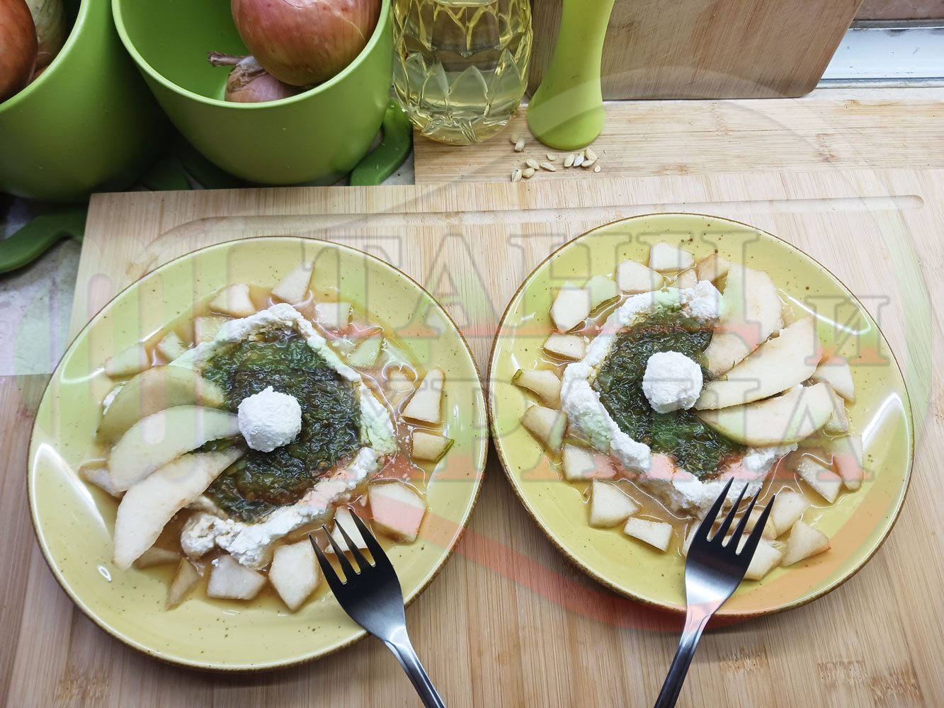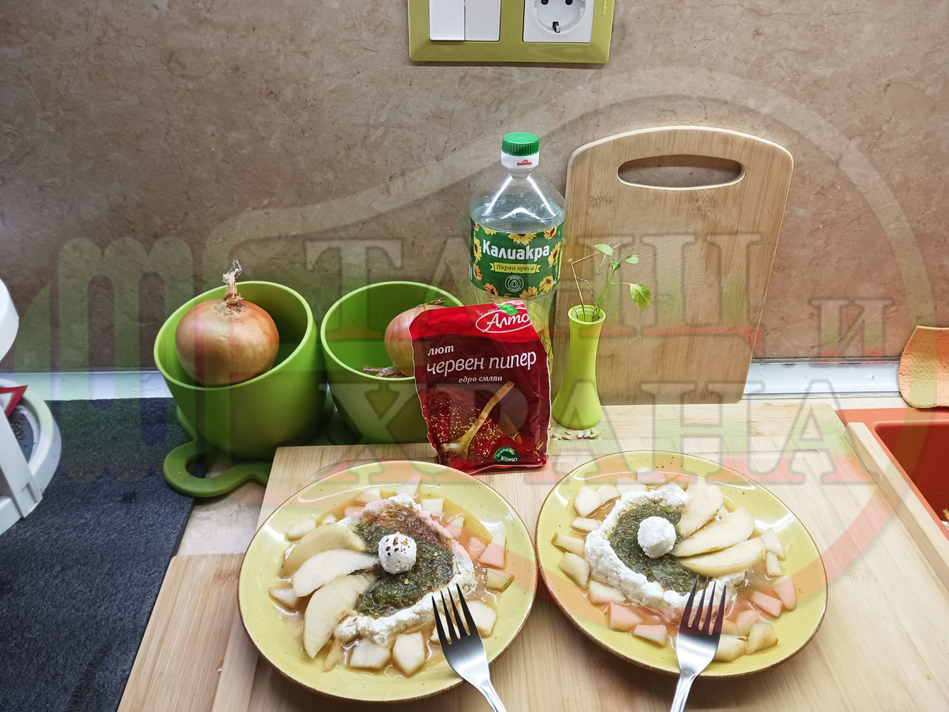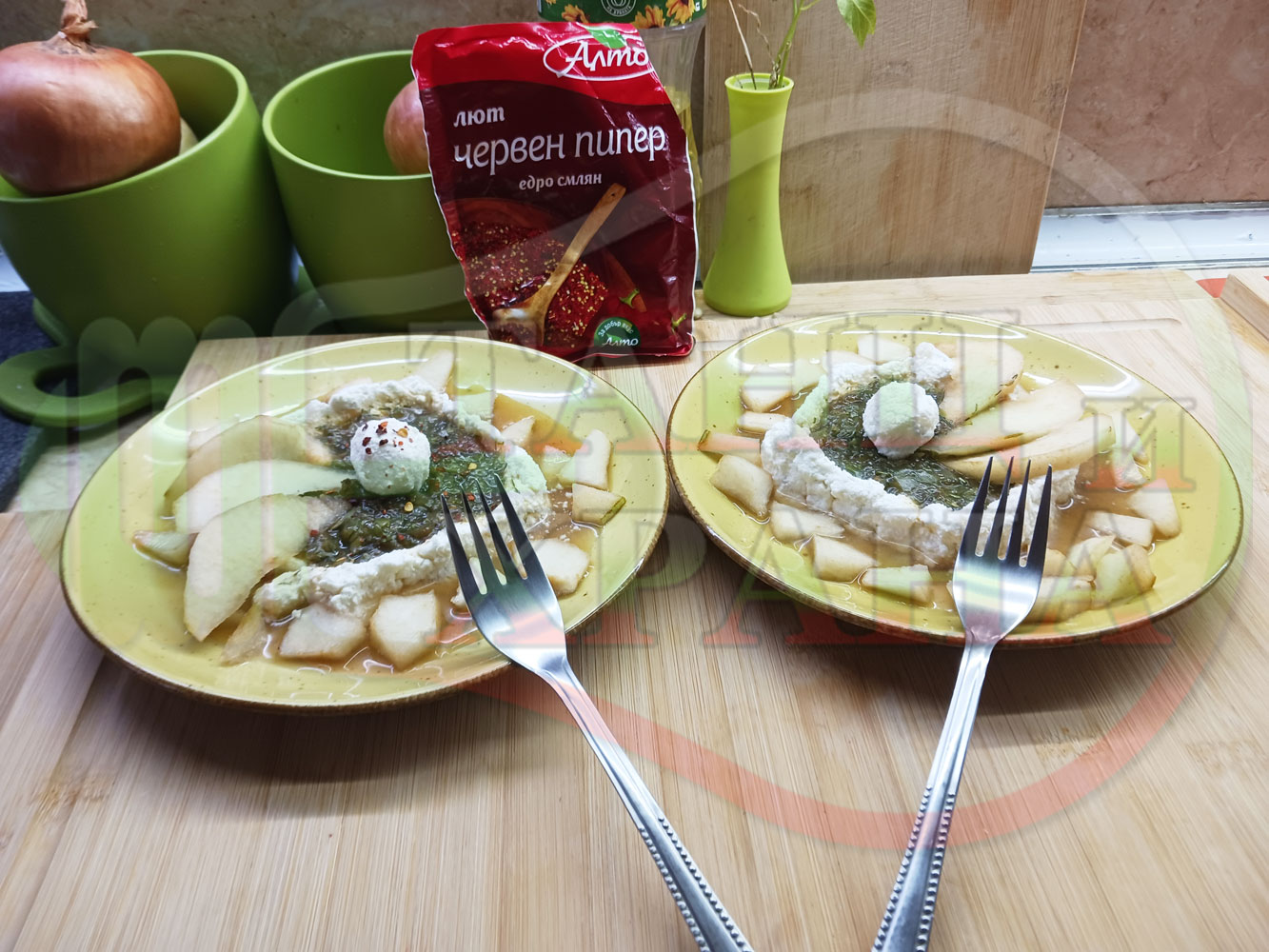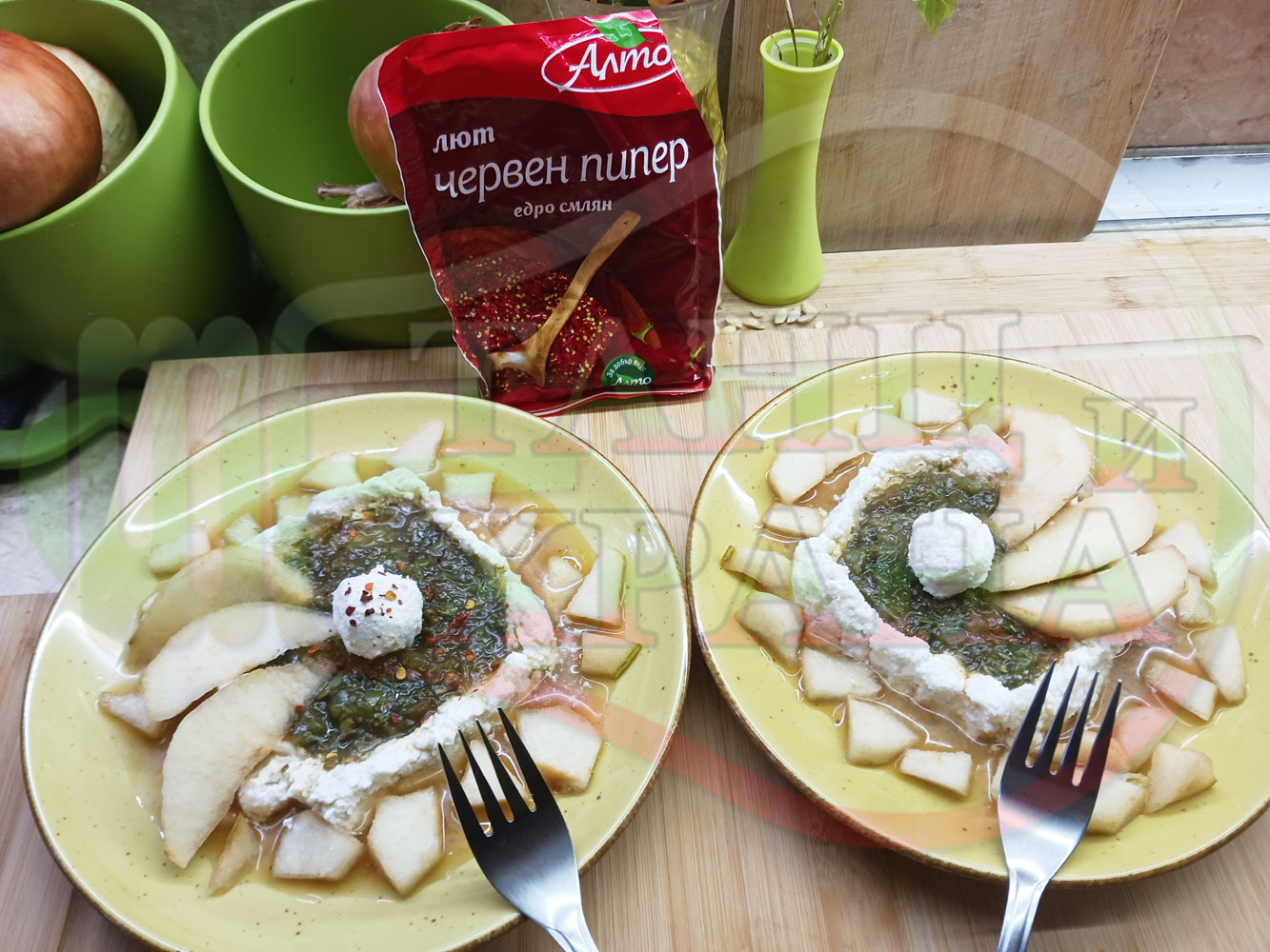 Добавете червен лют и/или сладък пипер при приготвянето на сиреново крушовия крем и/или поръсете готовите порции на вкус.