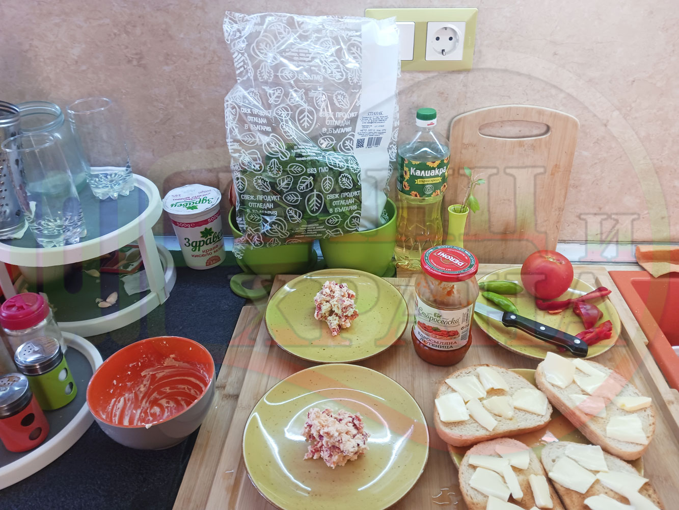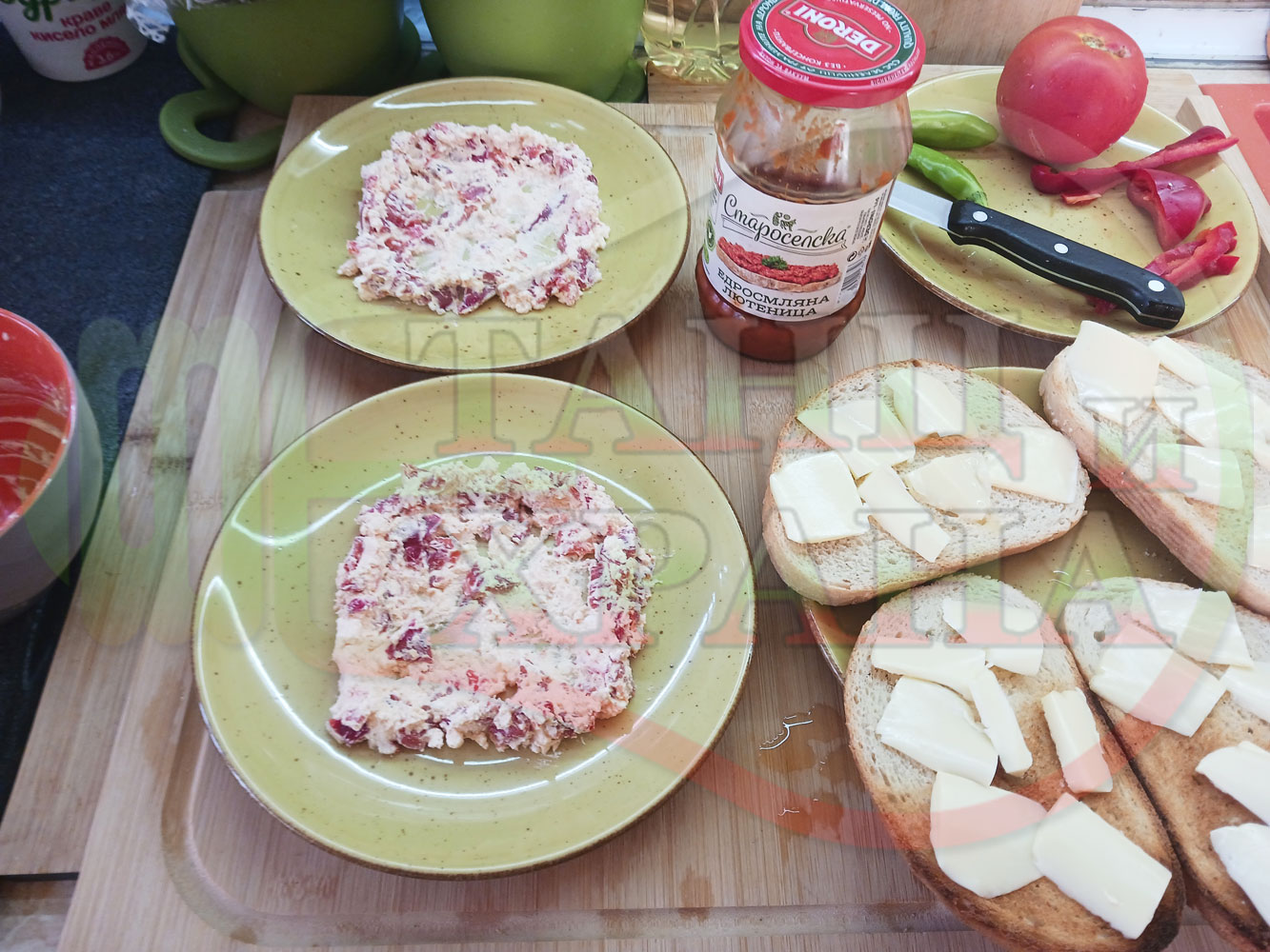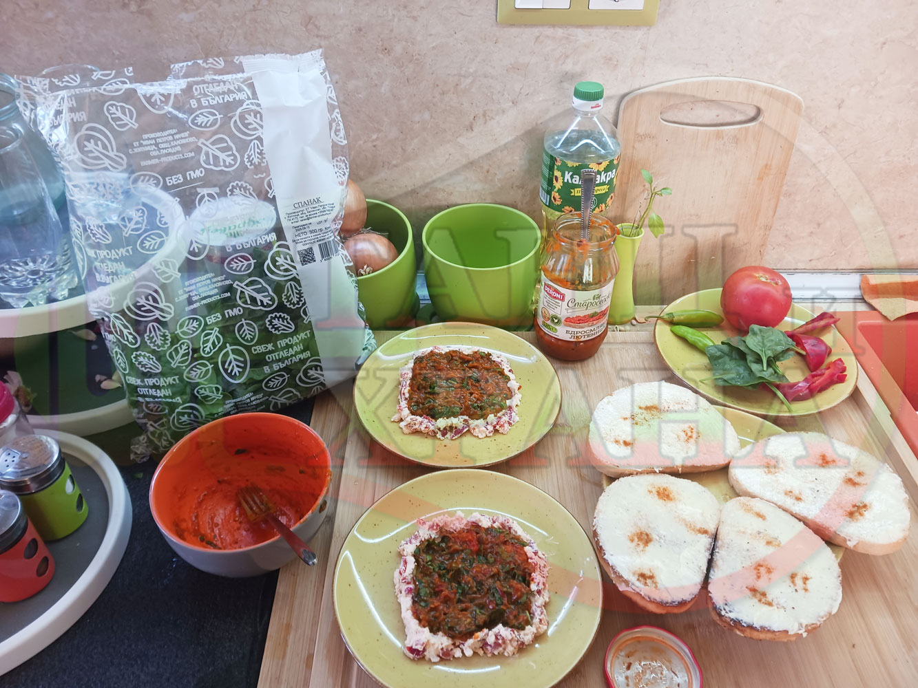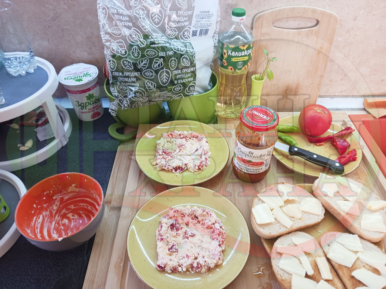 В случай, че сиреновият крем се получи прекалено гъст и солен, добавете нарязана на малки парченца червена чушка за да го разредите или сгъстете прекалено редкия крем с краве бяло сирене (винаги имайте под ръка някакво малко парченце (количество) от дадения продукт за доовкусяване и прецезиране на гъстотата). Разбърквайте и намачквайте с вилица след добавянето на съответния продукт (за сгъстяване или разреждане) за да прецените гъстотата и вкуса на крема (зависи от големината и водното съдържание на чушката/ите и солеността на сиренето). Съобразявайте и според вида на продукта за гарниране и неговото водно съдържание и особености (в случая са лютеницата със свежия спанак).