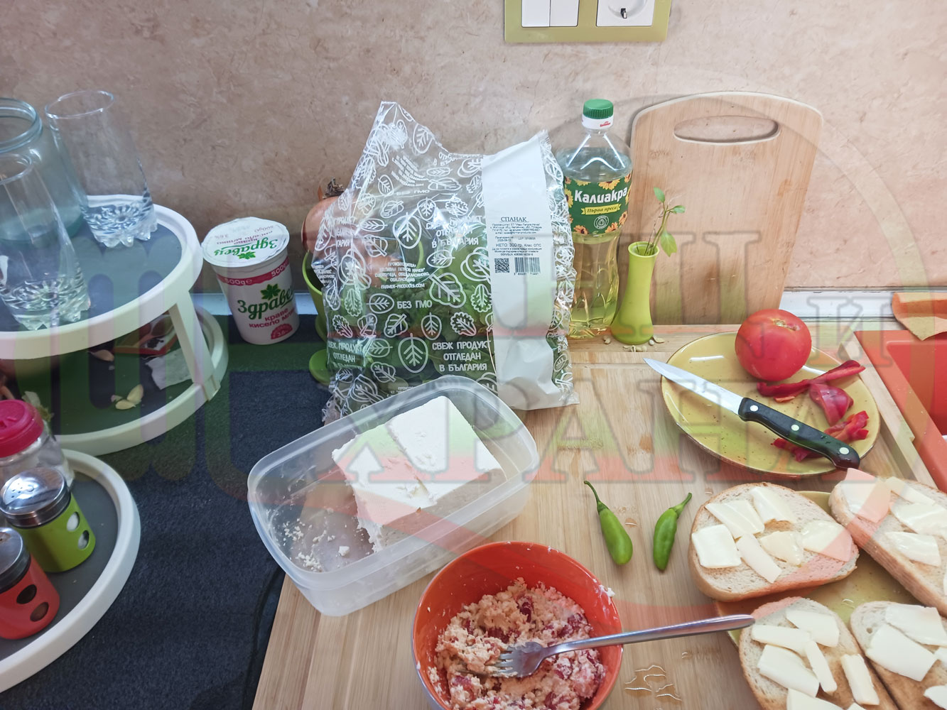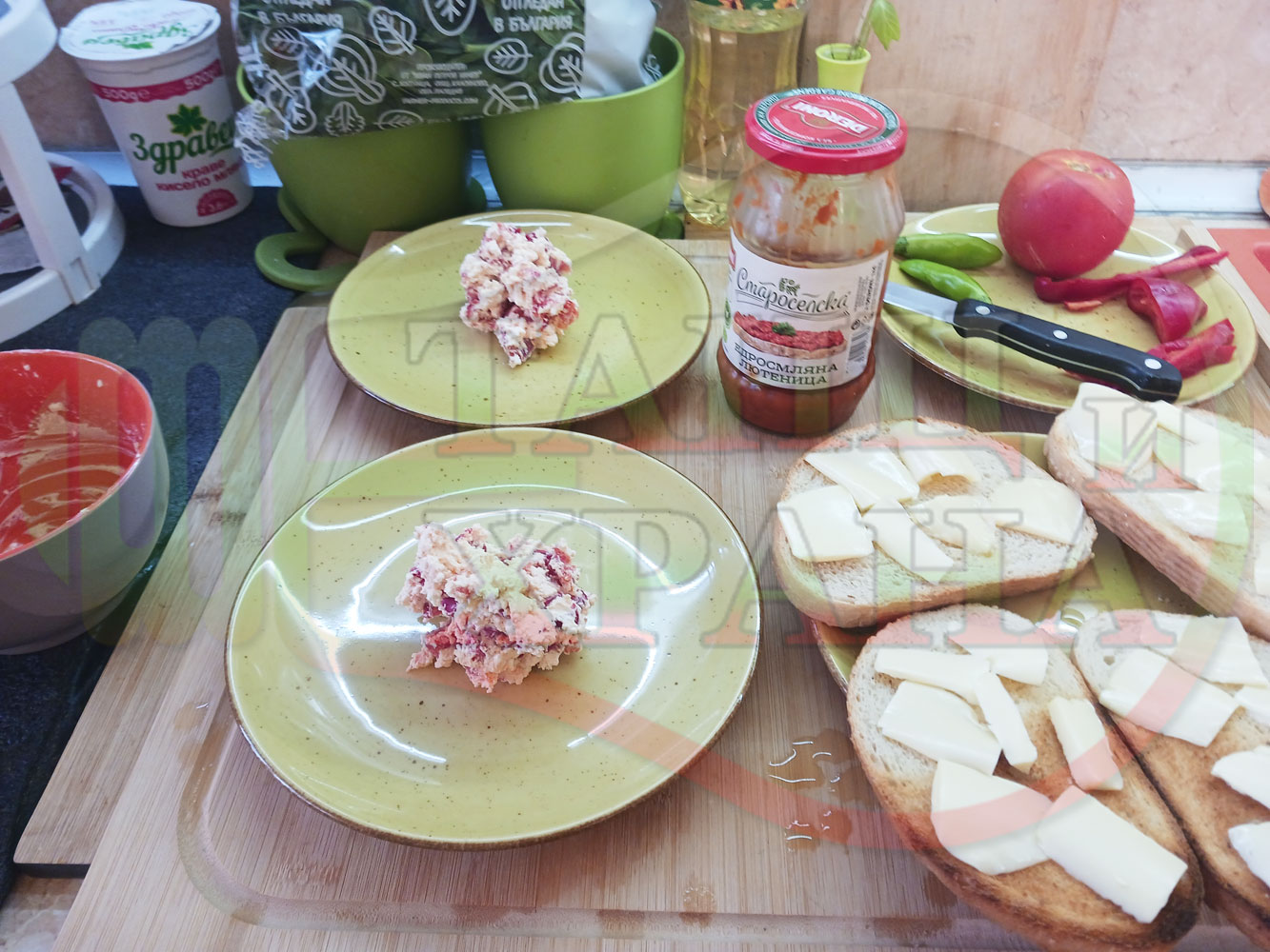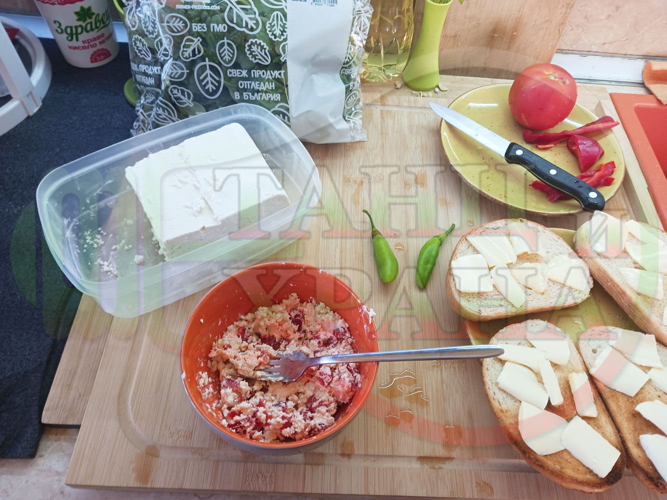 В случай, че сиреновият крем се получи прекалено гъст и солен, добавете нарязана на малки парченца червена чушка за да го разредите или сгъстете прекалено редкия крем с краве бяло сирене (винаги имайте под ръка някакво малко парченце (количество) от дадения продукт за доовкусяване и прецезиране на гъстотата). Разбърквайте и намачквайте с вилица след добавянето на съответния продукт (за сгъстяване или разреждане) за да прецените гъстотата и вкуса на крема (зависи от големината и водното съдържание на чушката/ите и солеността на сиренето). Съобразявайте и според вида на продукта за гарниране и неговото водно съдържание и особености (в случая са лютеницата със свежия спанак).