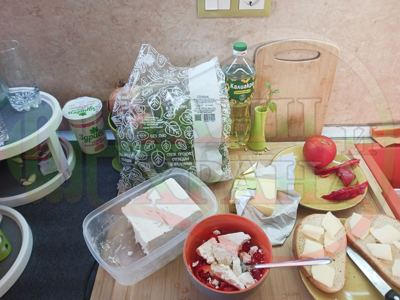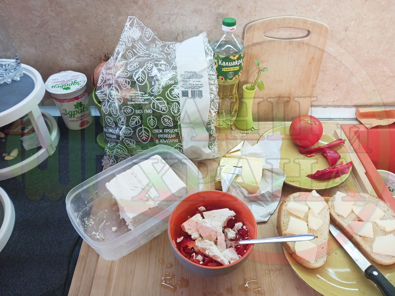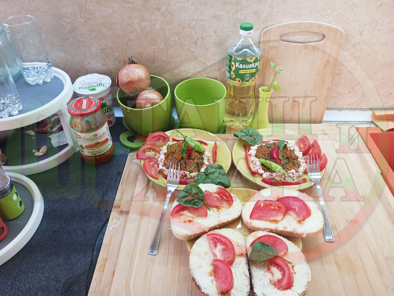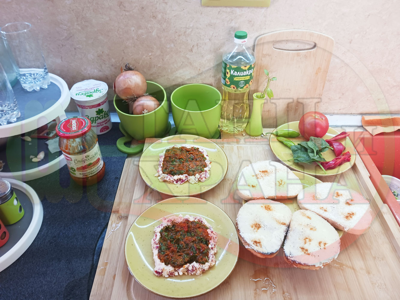 В случай, че сиреновият крем се получи прекалено гъст и солен, добавете нарязана на малки парченца червена чушка за да го разредите или сгъстете прекалено редкия крем с краве бяло сирене (винаги имайте под ръка някакво малко парченце (количество) от дадения продукт за доовкусяване и прецезиране на гъстотата). Разбърквайте и намачквайте с вилица след добавянето на съответния продукт (за сгъстяване или разреждане) за да прецените гъстотата и вкуса на крема (зависи от големината и водното съдържание на чушката/ите и солеността на сиренето). Съобразявайте и според вида на продукта за гарниране и неговото водно съдържание и особености (в случая са лютеницата със свежия спанак).