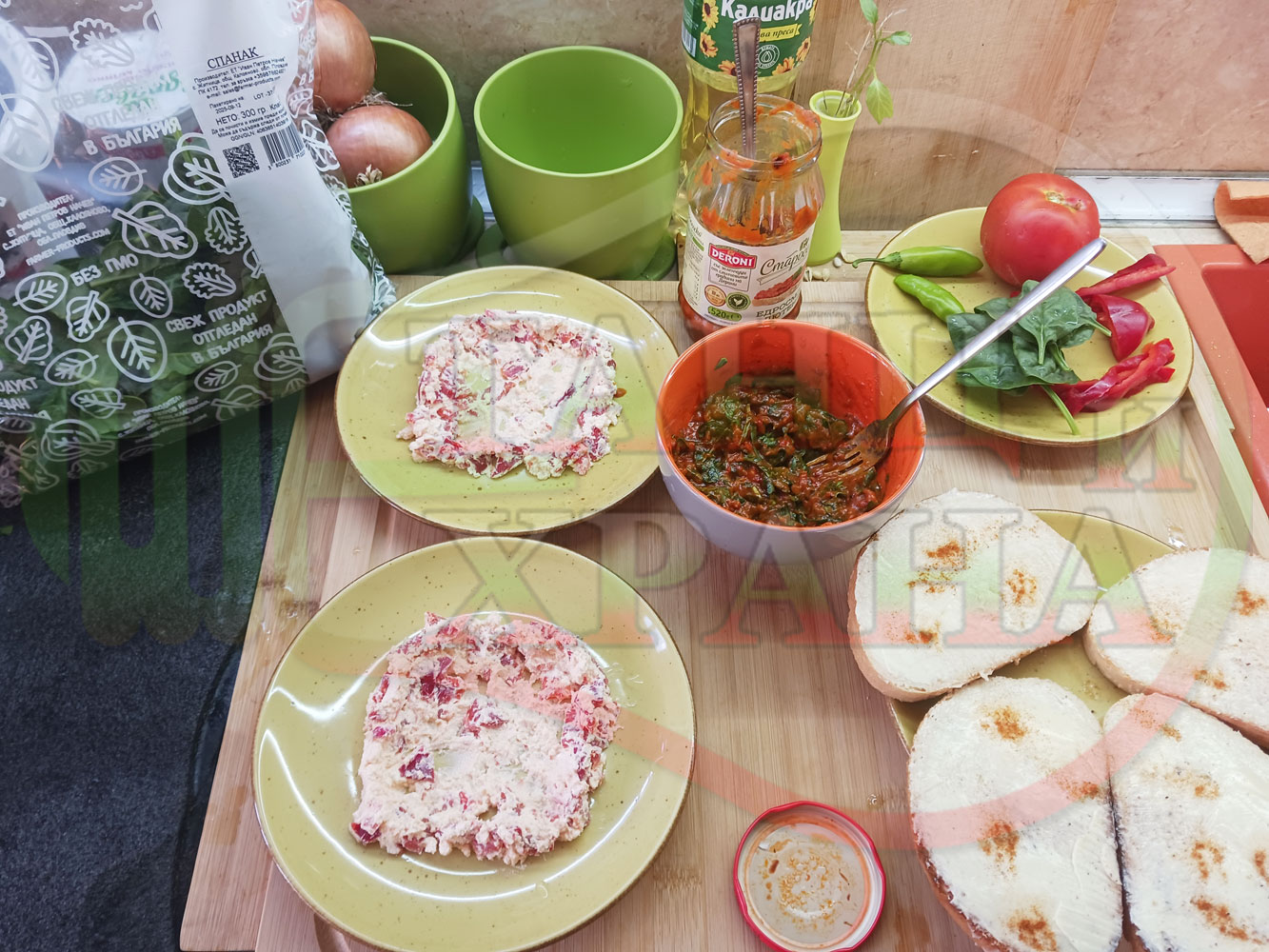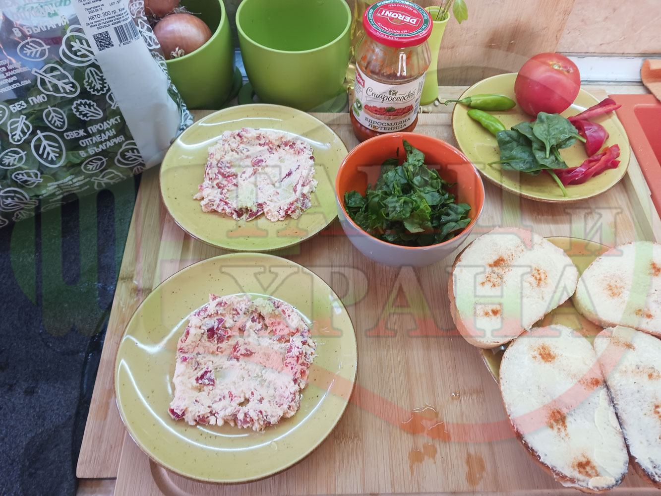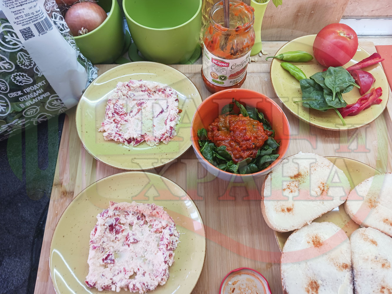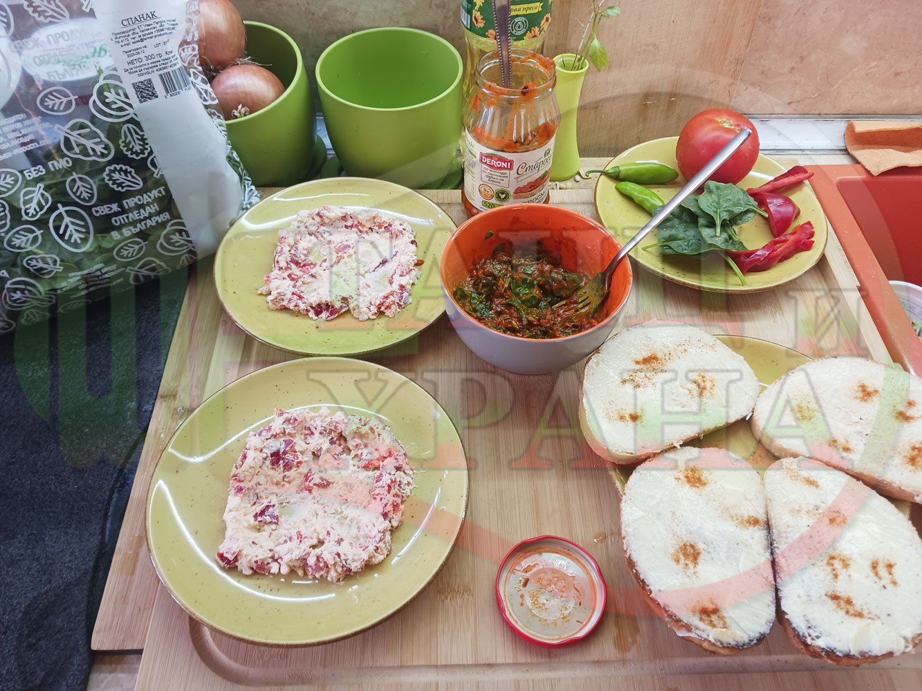 ПРОДУКТИ: Приблизителни количества за българска лютенична сурова гъста супа "Спаначена червеночушкова с БГсирене" приготвена от едросмляна лютеница и свеж спанак напълнена в кладенчета от сиренов крем с червени пресни чушки и краве бяло сирене гарнирана с люти чушлета - двукомпонентна