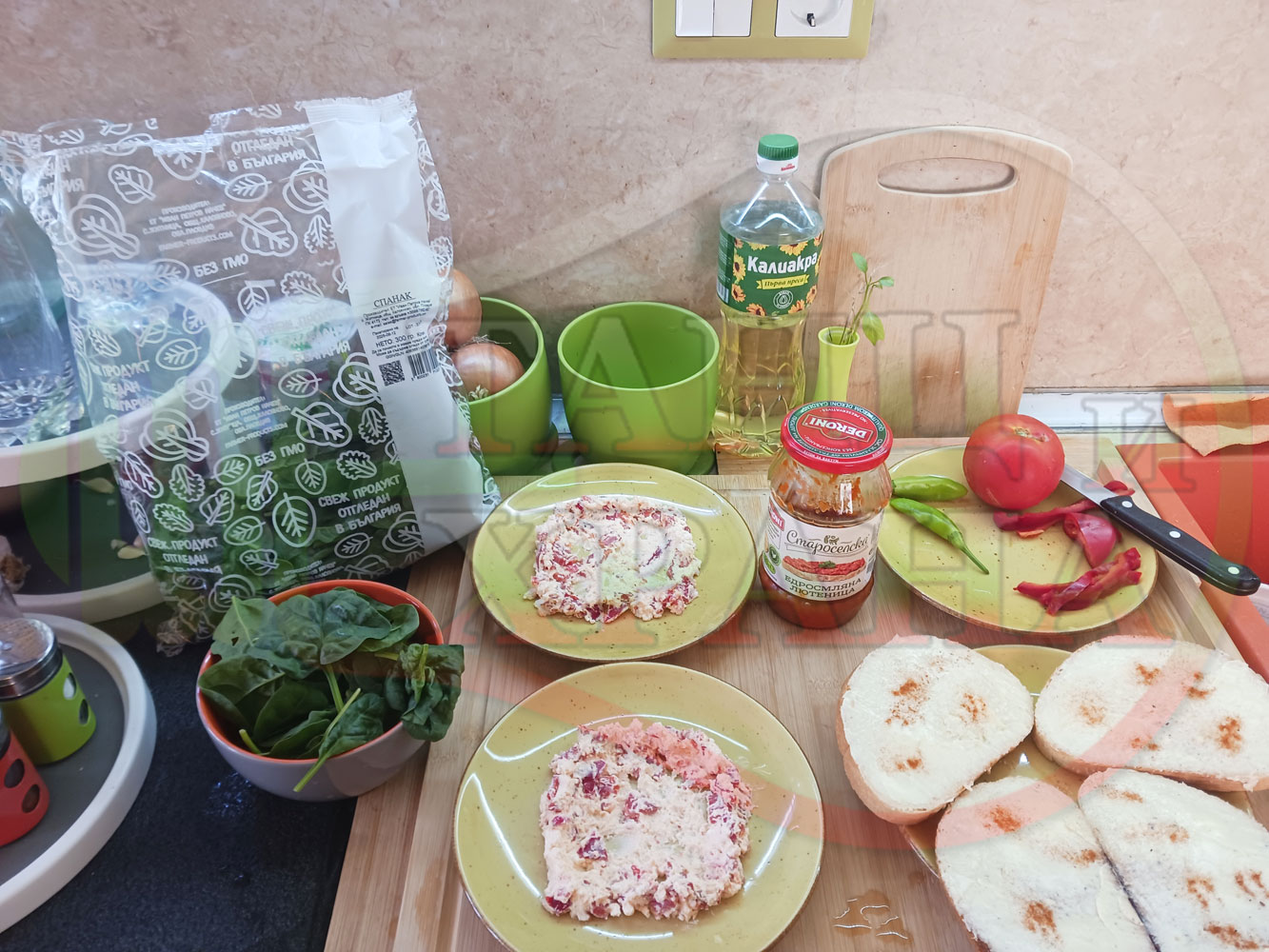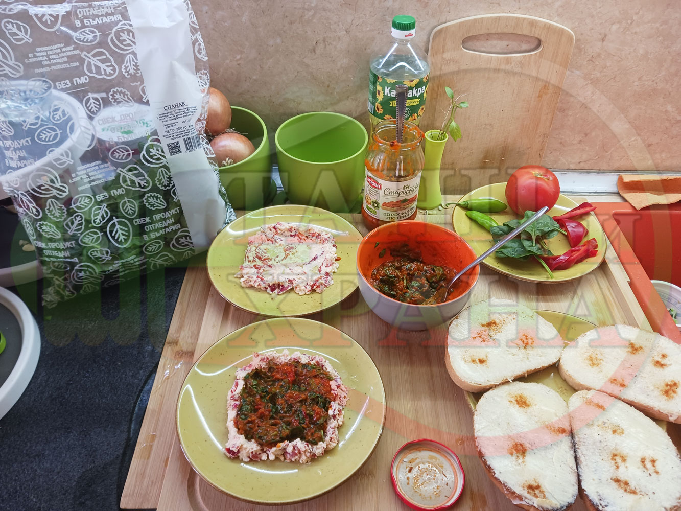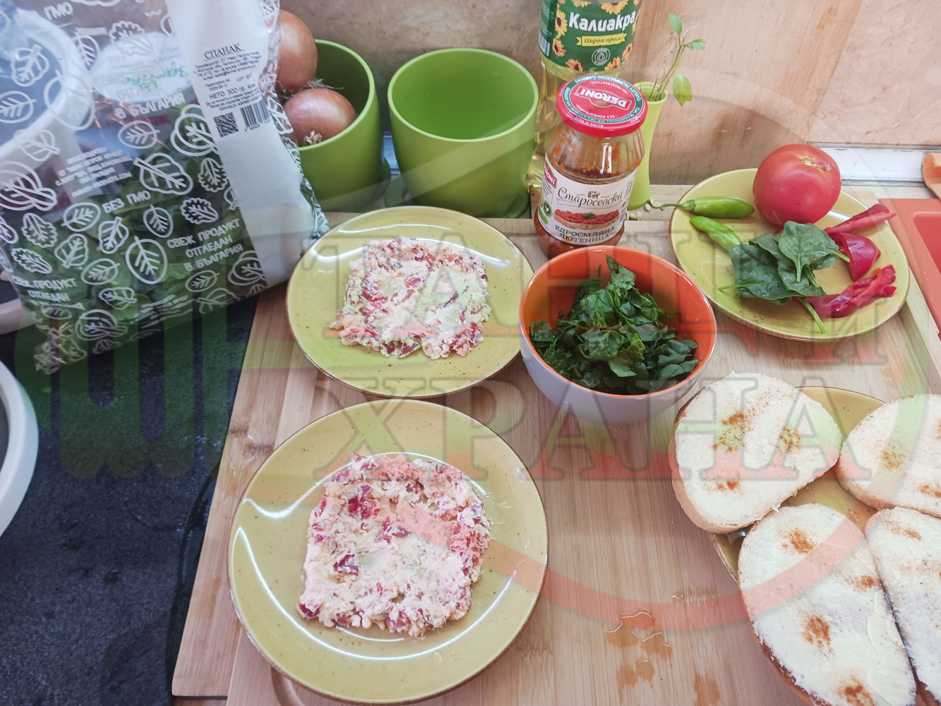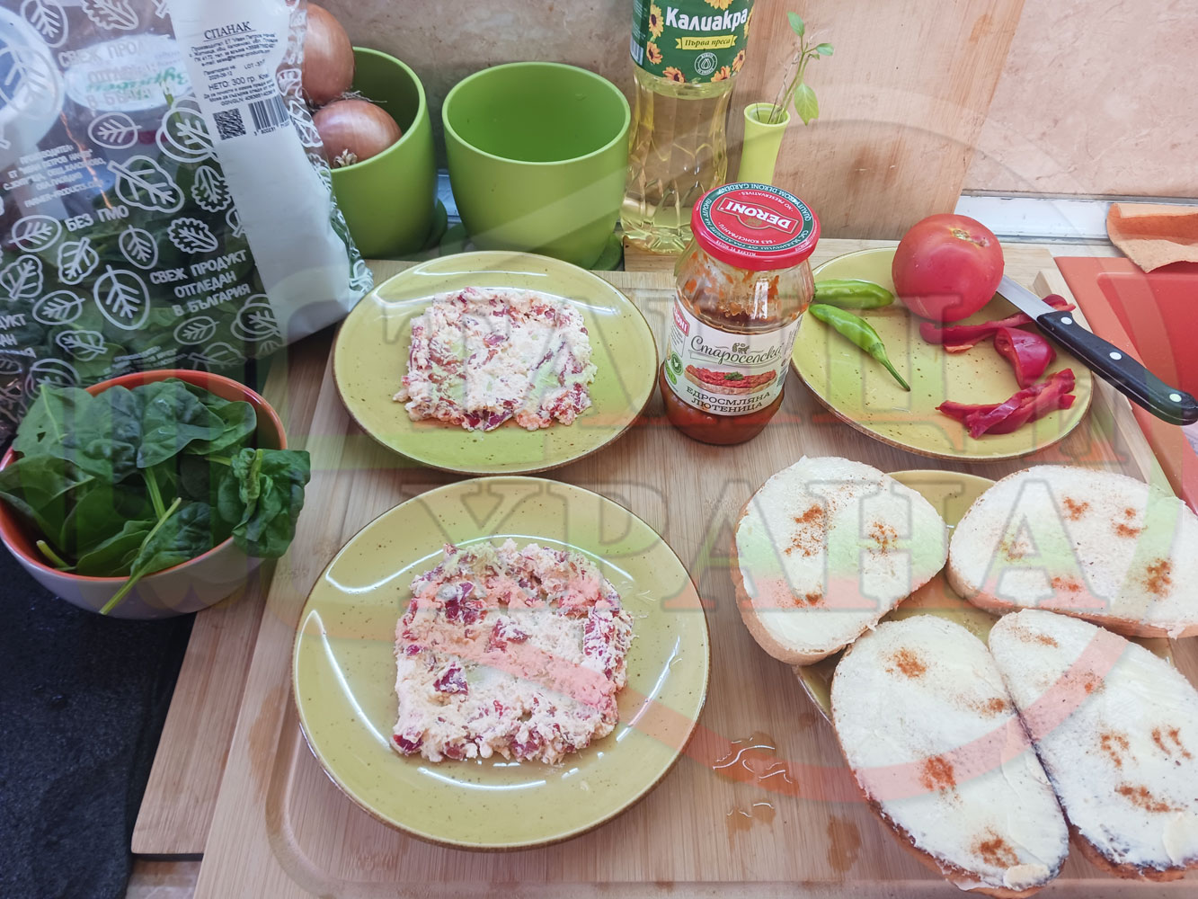 ПРОДУКТИ: Приблизителни количества за българска лютенична сурова гъста супа "Спаначена червеночушкова с БГсирене" приготвена от едросмляна лютеница и свеж спанак напълнена в кладенчета от сиренов крем с червени пресни чушки и краве бяло сирене гарнирана с люти чушлета - двукомпонентна