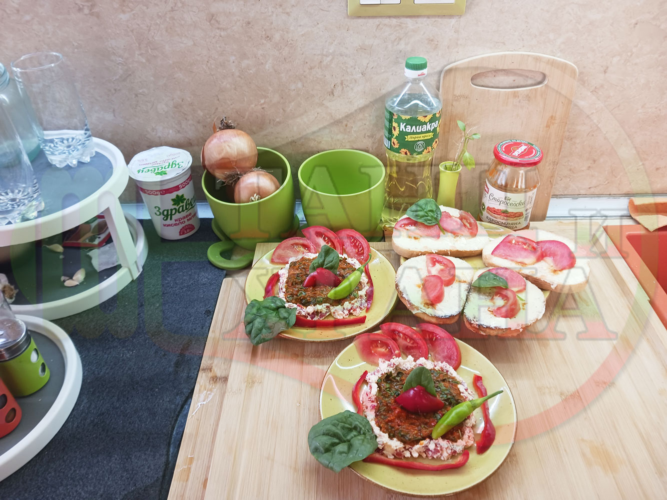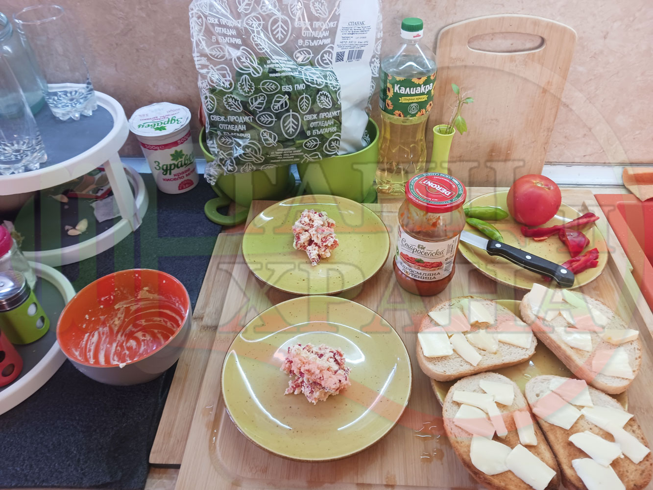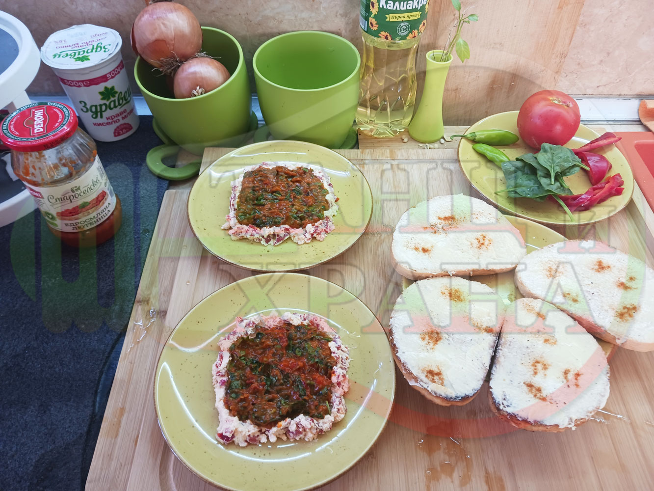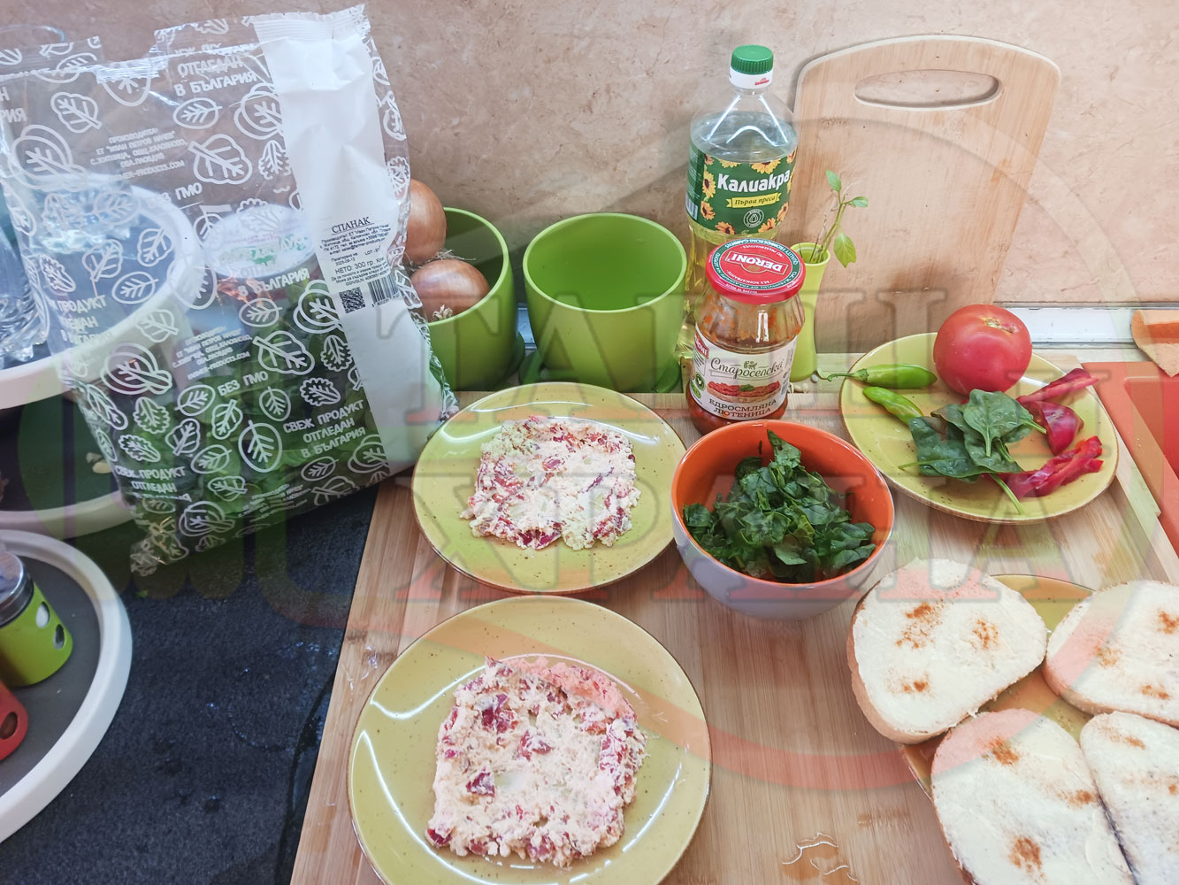 ПРОДУКТИ: Приблизителни количества за българска лютенична сурова гъста супа "Спаначена червеночушкова с БГсирене" приготвена от едросмляна лютеница и свеж спанак напълнена в кладенчета от сиренов крем с червени пресни чушки и краве бяло сирене гарнирана с люти чушлета - двукомпонентна