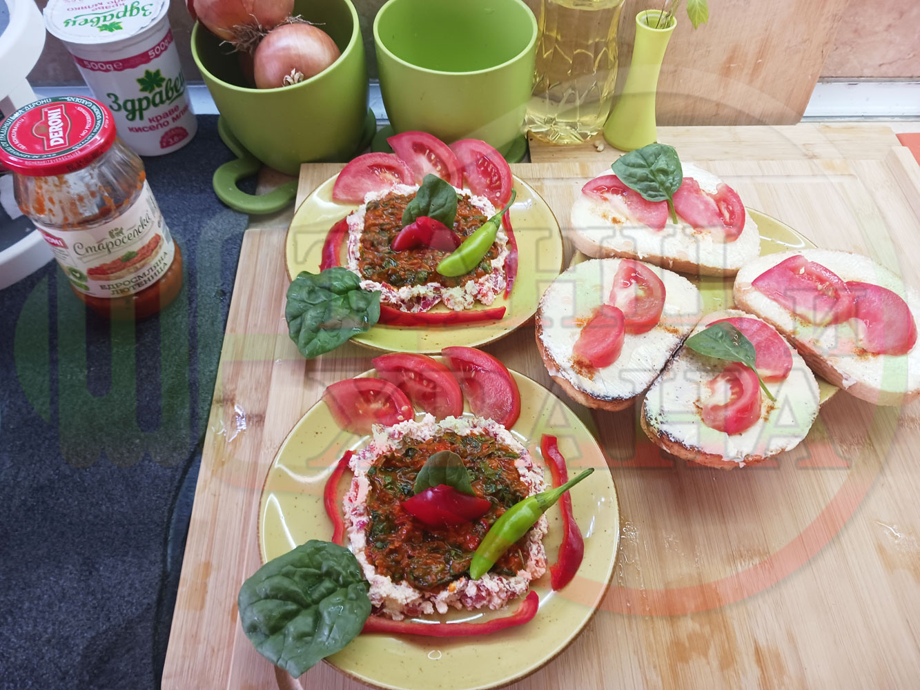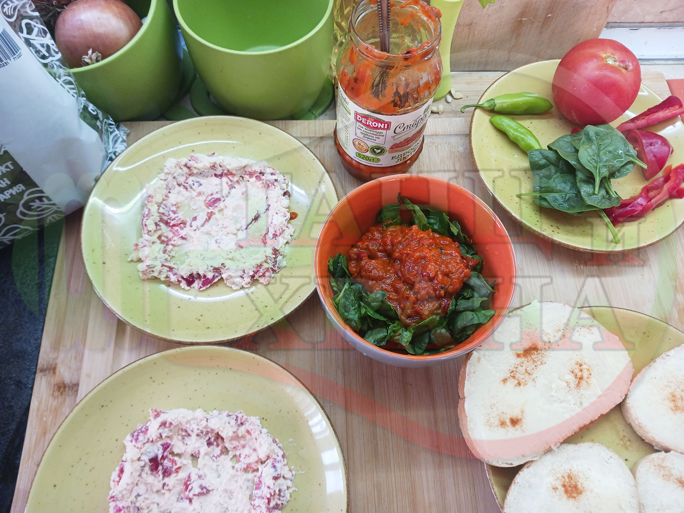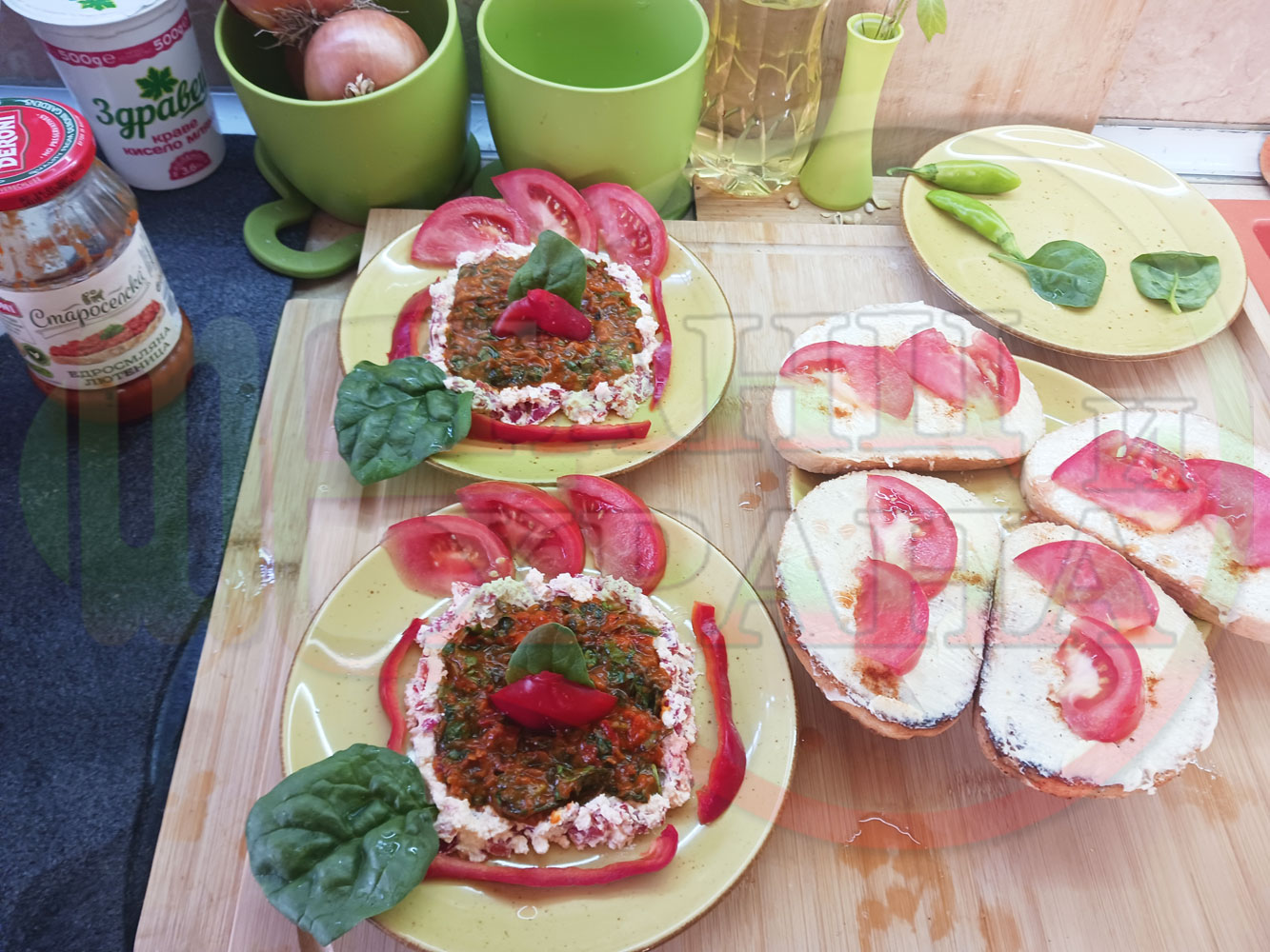 От известно време приготвям различни лютенични супи и салати с така обичаната още от детските ни години българска лютеница. Реших и този път да спретна за закуска полезна лютенична, сурова, гъста супа (да, сътворените от мен лютенични сурови супи ги измислих като вид полезна и засищаща закуска). Кой българин не е хапвал като дете филийки намазани с лютеница и сирене? Мисля, че няма такъв българин особено ако е отгледан и живял в България и така... спретнах лютенично спаначената супа със свеж спанак и едросмляна лютеница, която напоява кладенчетата от сиреновия крем, приготвен с червени пресни чушки. Мммм... отново се получи голяма вкусно, вкусна, вкусотия (вкуснотия)... и добавих пресни люти чушлета за леко пикантен, хрупкав, свеж и полезен акцент заедно с пресните домати ![]()