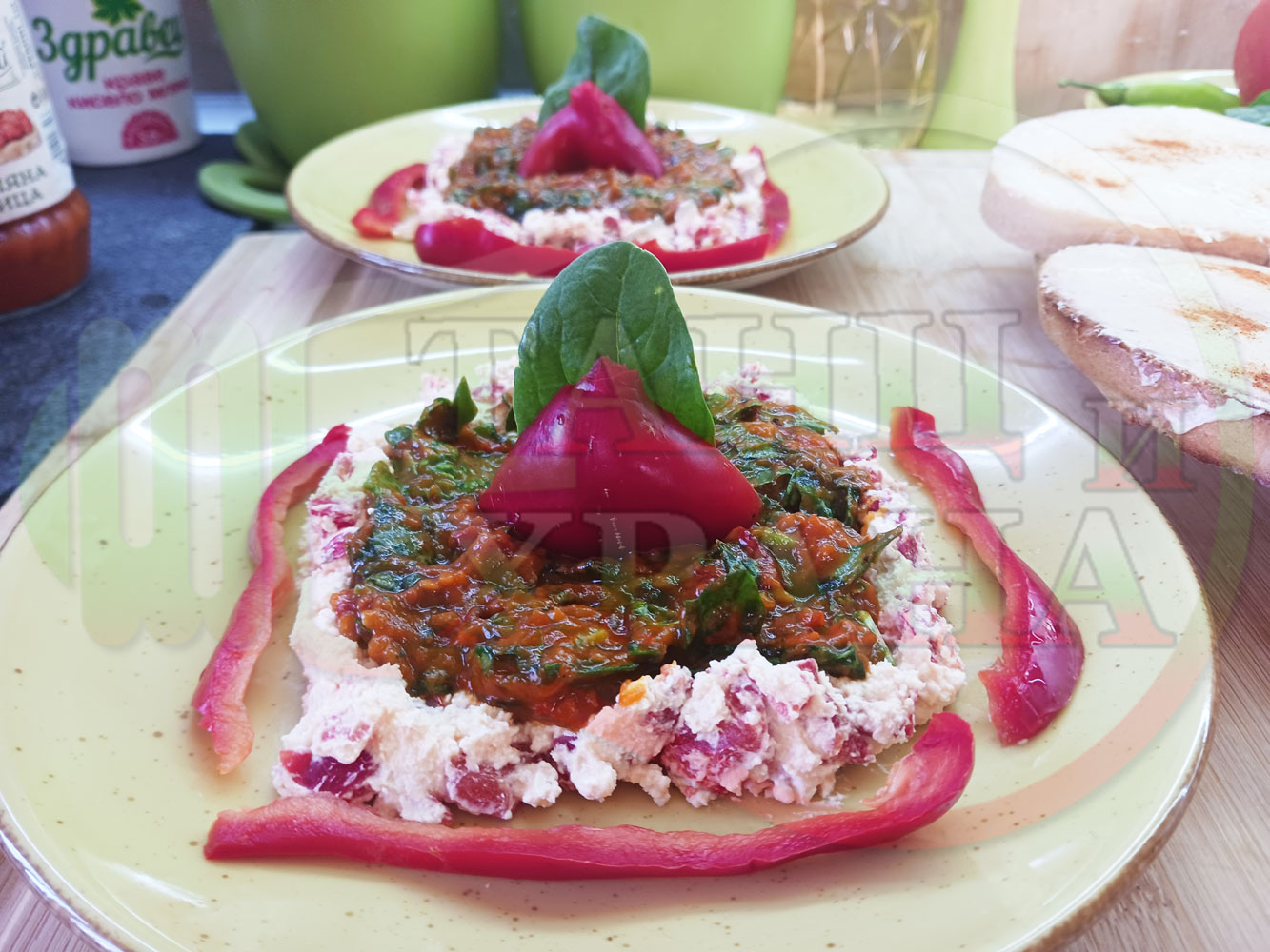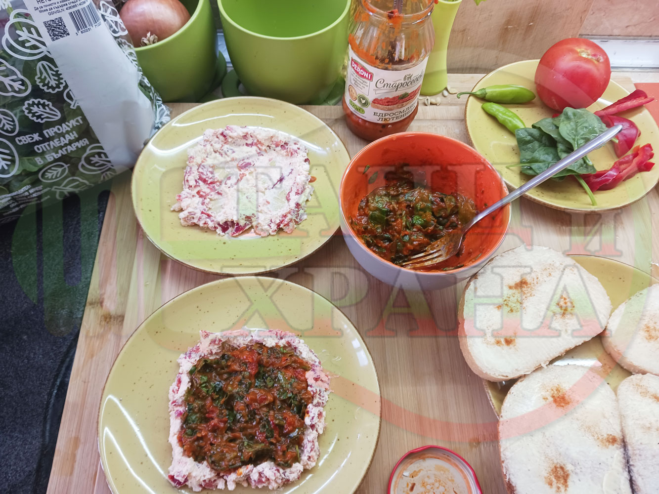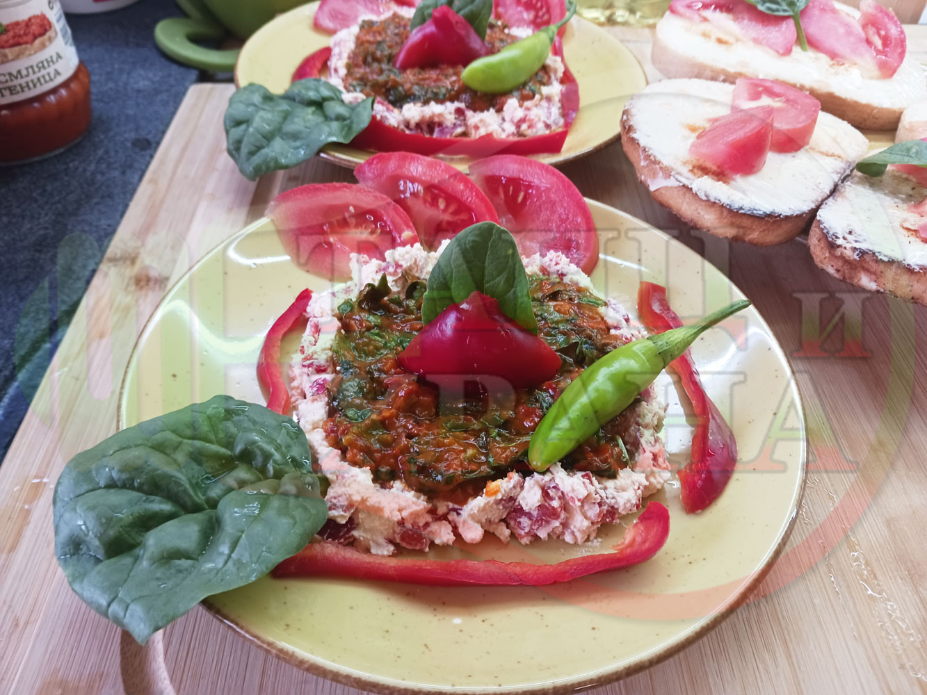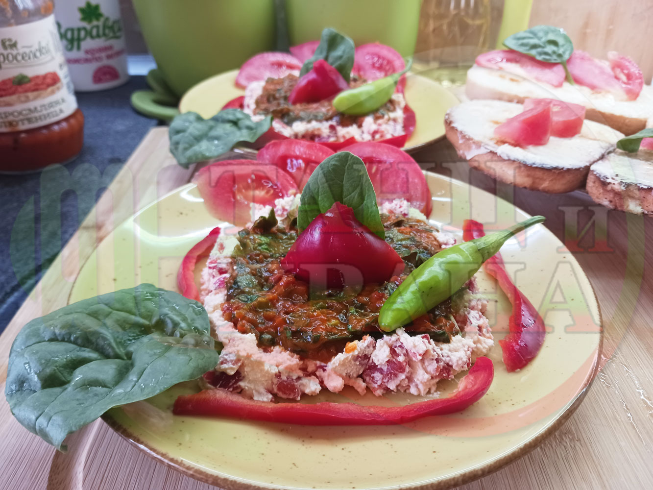 Българска лютенична сурова гъста супа "Спаначена червеночушкова с БГсирене" приготвена от едросмляна лютеница и свеж спанак напълнена в кладенчета от сиренов крем с червени пресни чушки и краве бяло сирене гарнирана с люти чушлета - двукомпонентна