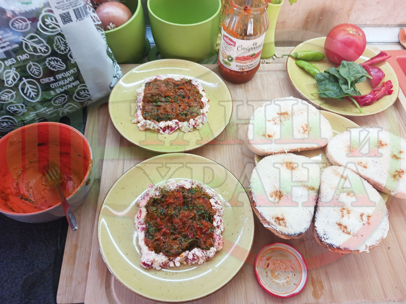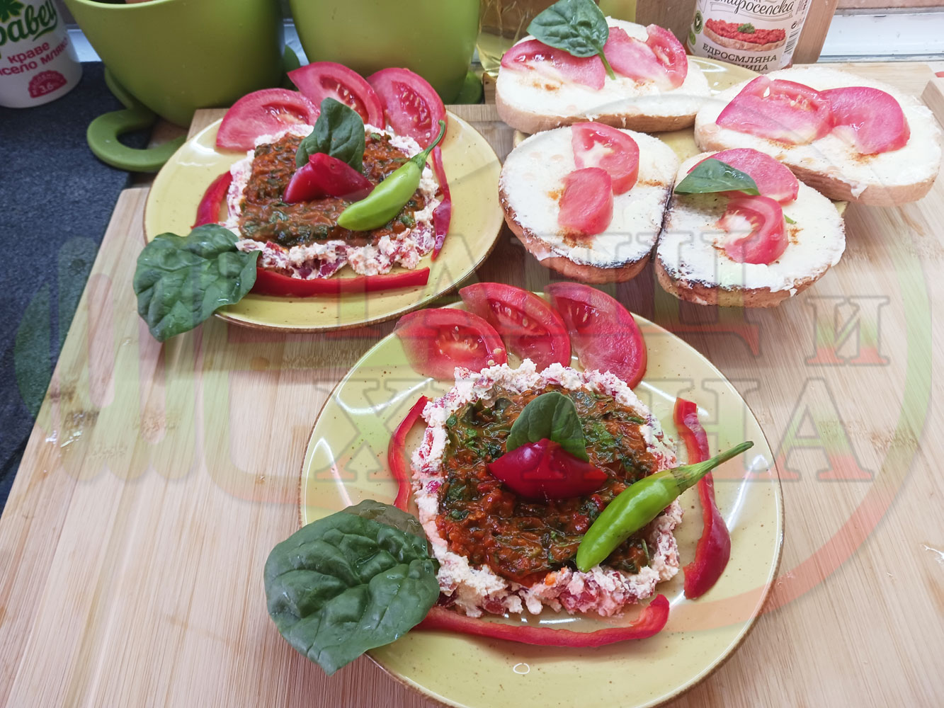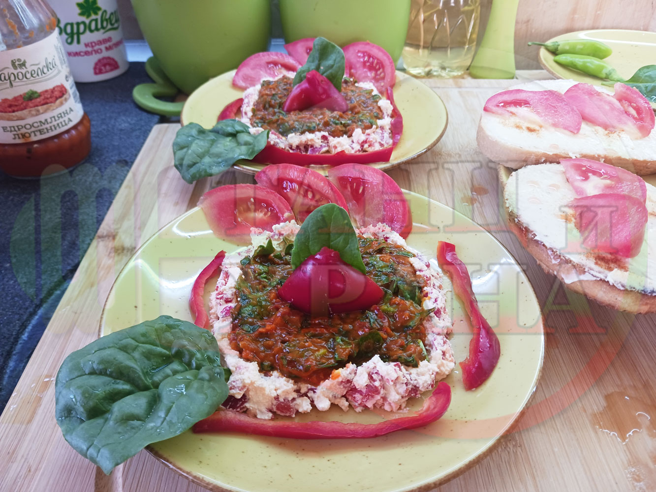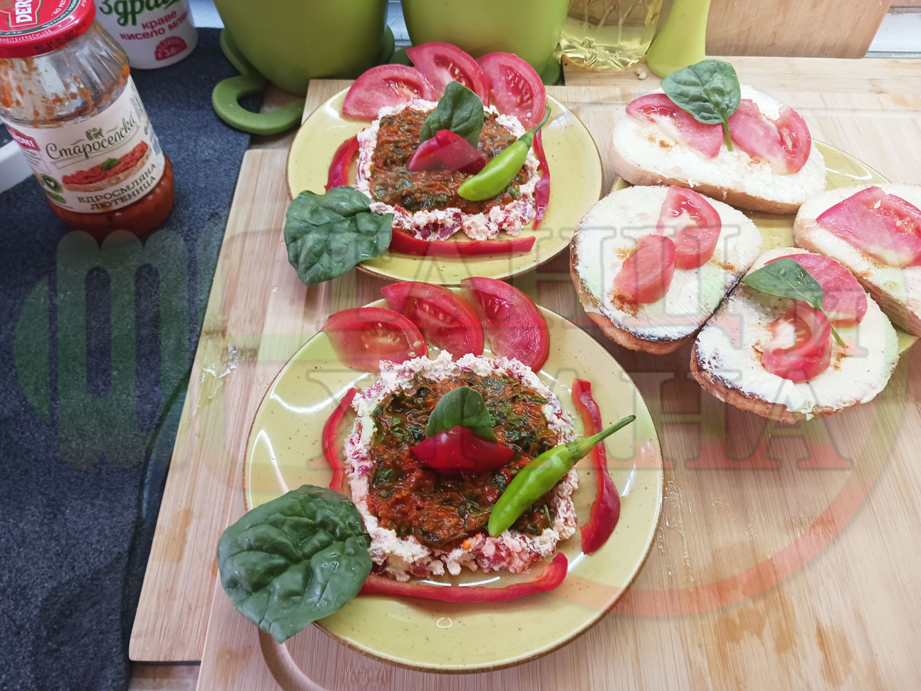 Българска лютенична сурова гъста супа "Спаначена червеночушкова с БГсирене" приготвена от едросмляна лютеница и свеж спанак напълнена в кладенчета от сиренов крем с червени пресни чушки и краве бяло сирене гарнирана с люти чушлета - двукомпонентна