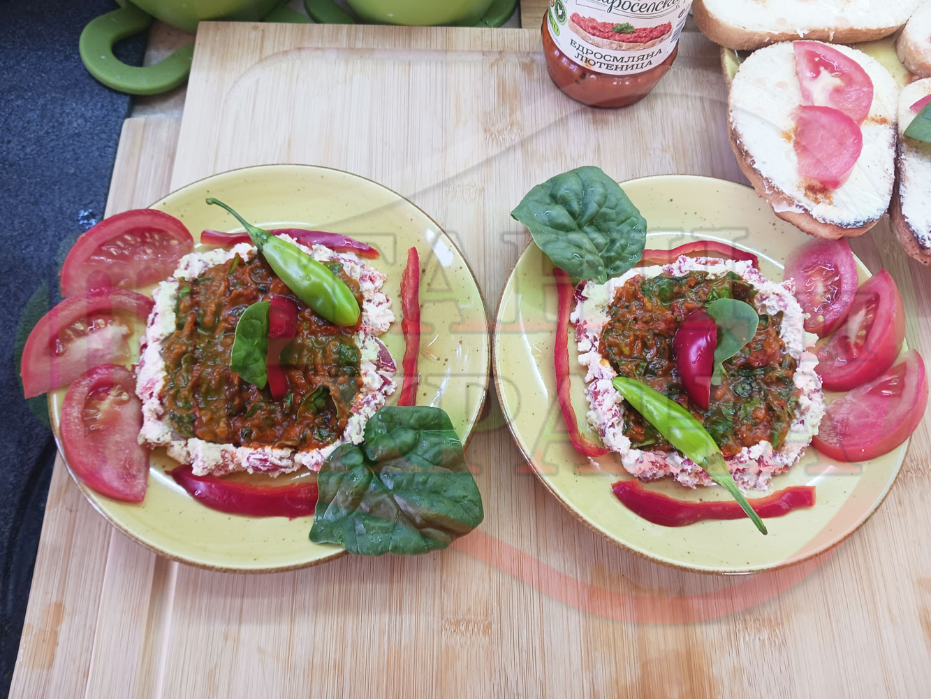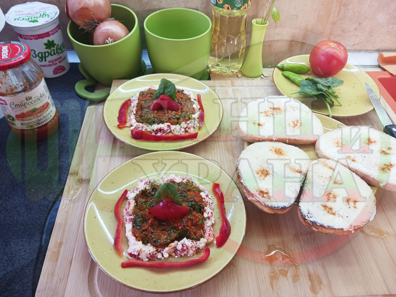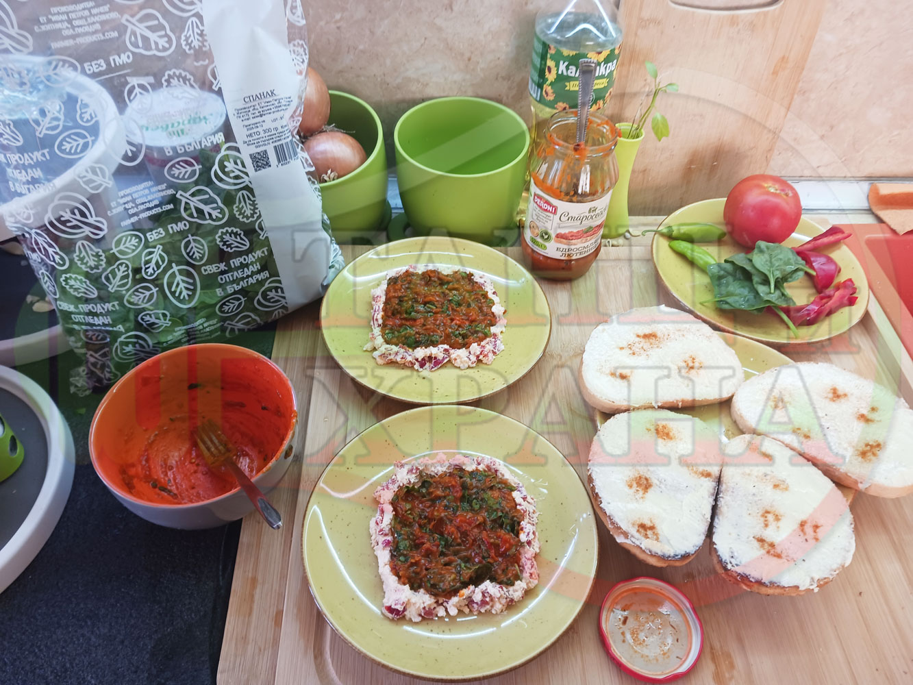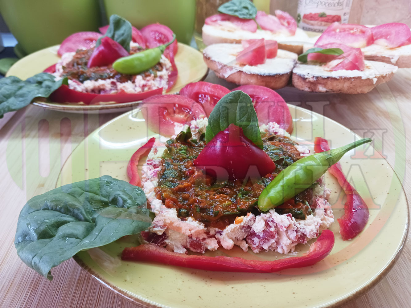 Българска лютенична сурова гъста супа "Спаначена червеночушкова с БГсирене" приготвена от едросмляна лютеница и свеж спанак напълнена в кладенчета от сиренов крем с червени пресни чушки и краве бяло сирене гарнирана с люти чушлета - двукомпонентна