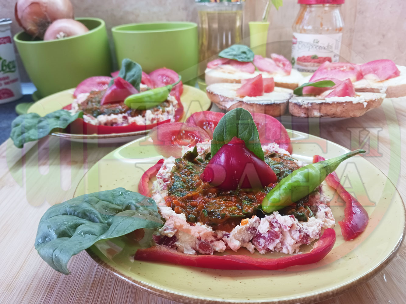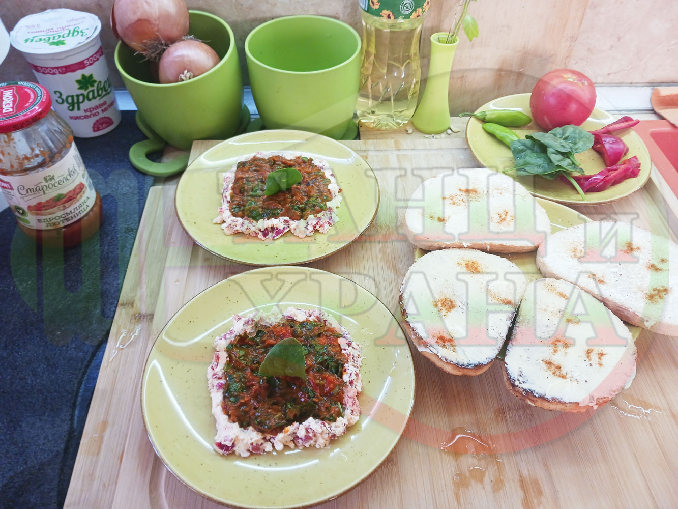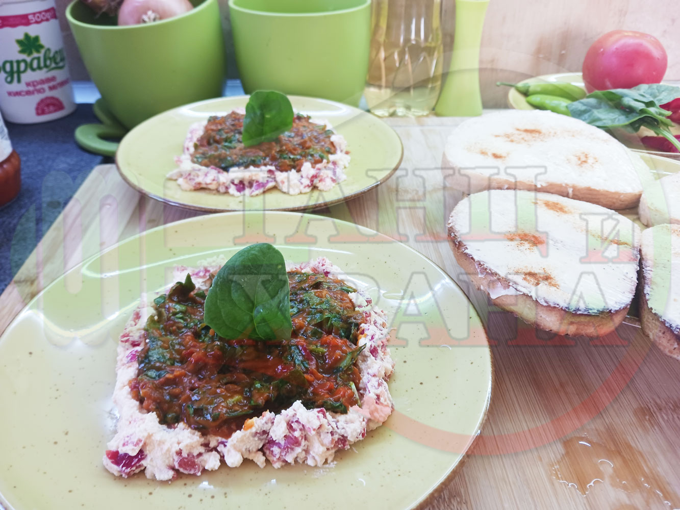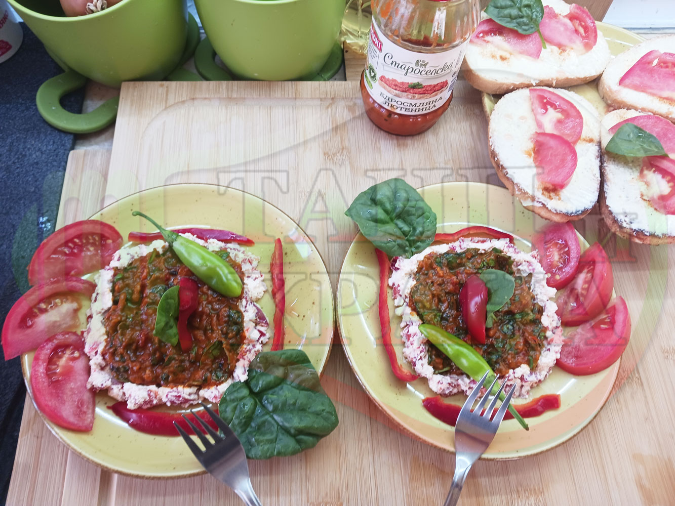 Българска лютенична сурова гъста супа "Спаначена червеночушкова с БГсирене" приготвена от едросмляна лютеница и свеж спанак напълнена в кладенчета от сиренов крем с червени пресни чушки и краве бяло сирене гарнирана с люти чушлета - двукомпонентна