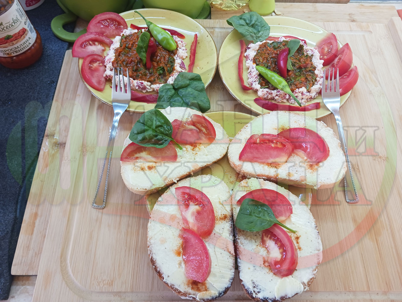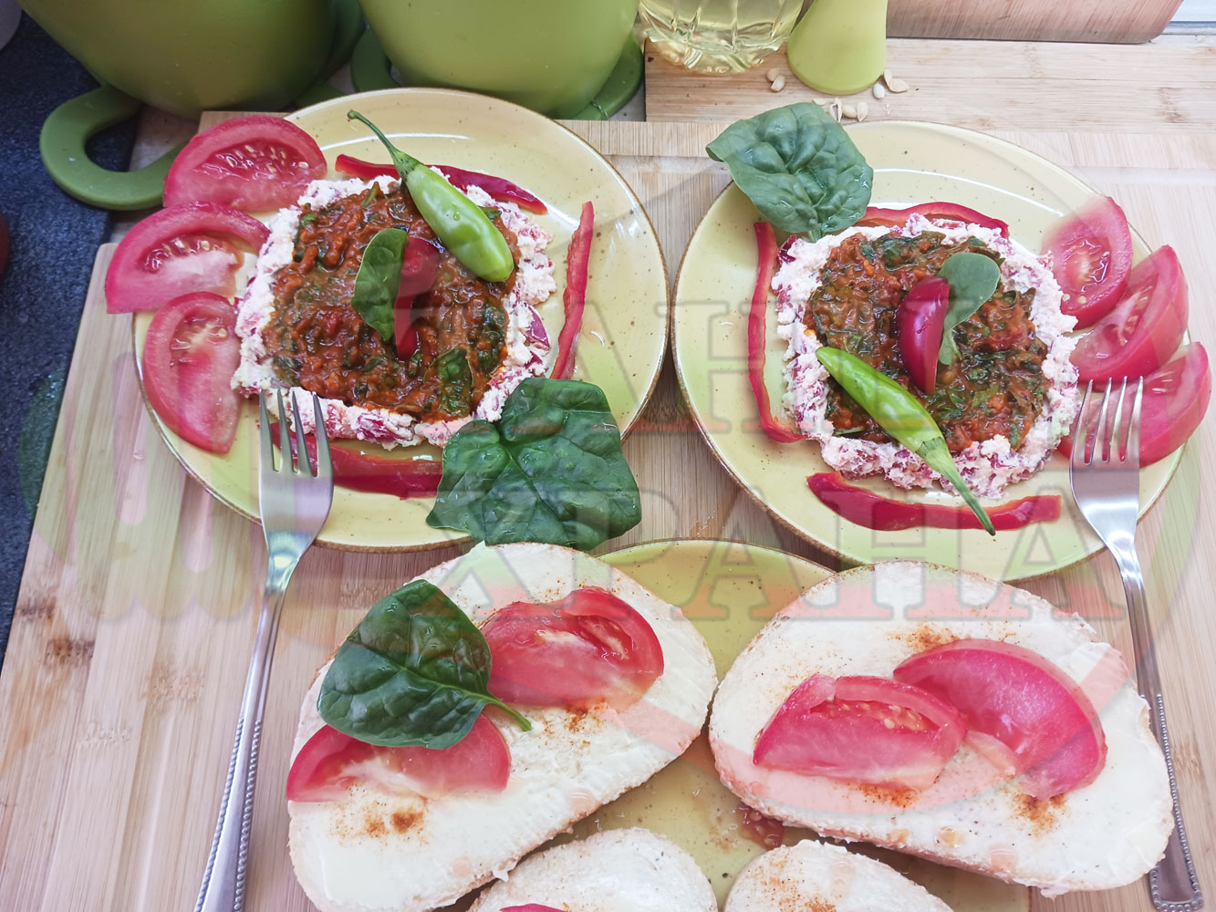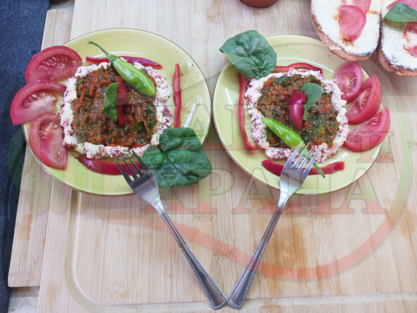 Добавете червен лют и/или сладък пипер при приготвянето на сиреново червеночушковия крем и/или поръсете готовите порции на вкус. Поднесете порциите с препечени на тостер филийки, намазани с краве масло и поръсени с червен сладък пипер и/или шарена сол. Украсете филийките с резенчета от пресния домат и с листенца от спанака (украсете по ваше желание и усмотрение). Измийте домата, нарежете го на резени и подредете еднакъв брой резени около кладенчетата по ваше желание и усмотрение.