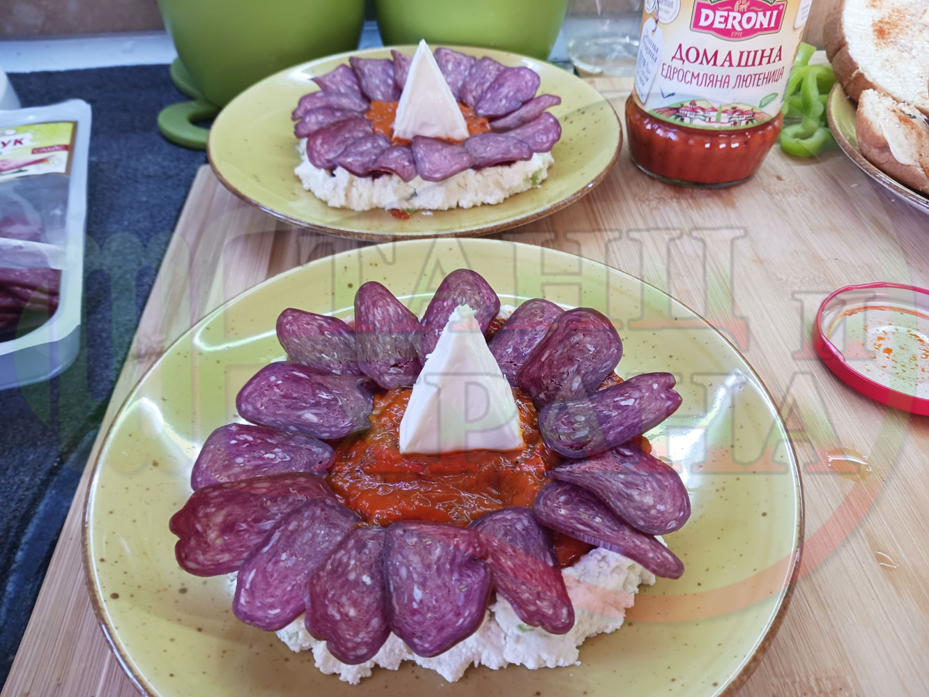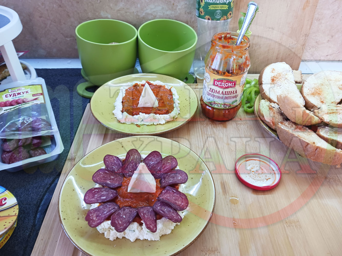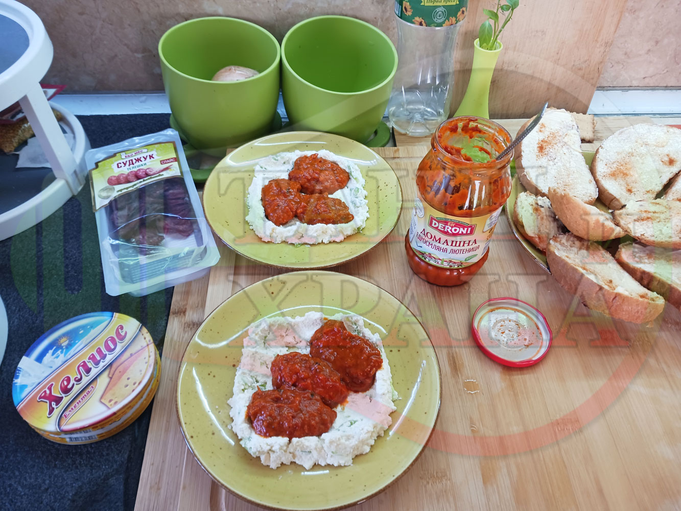 Оформете 2 топки с неправилна форма от сиреновия крем в чиниите и с ръце ги дооформете на широки "кладенчета" със средно високи стени и плътно дъно, така че да е стабилно и да задържи лютеницата и суджука. Сипете по 3 супени лъжици лютеница във всяко кладенче и я загладете.