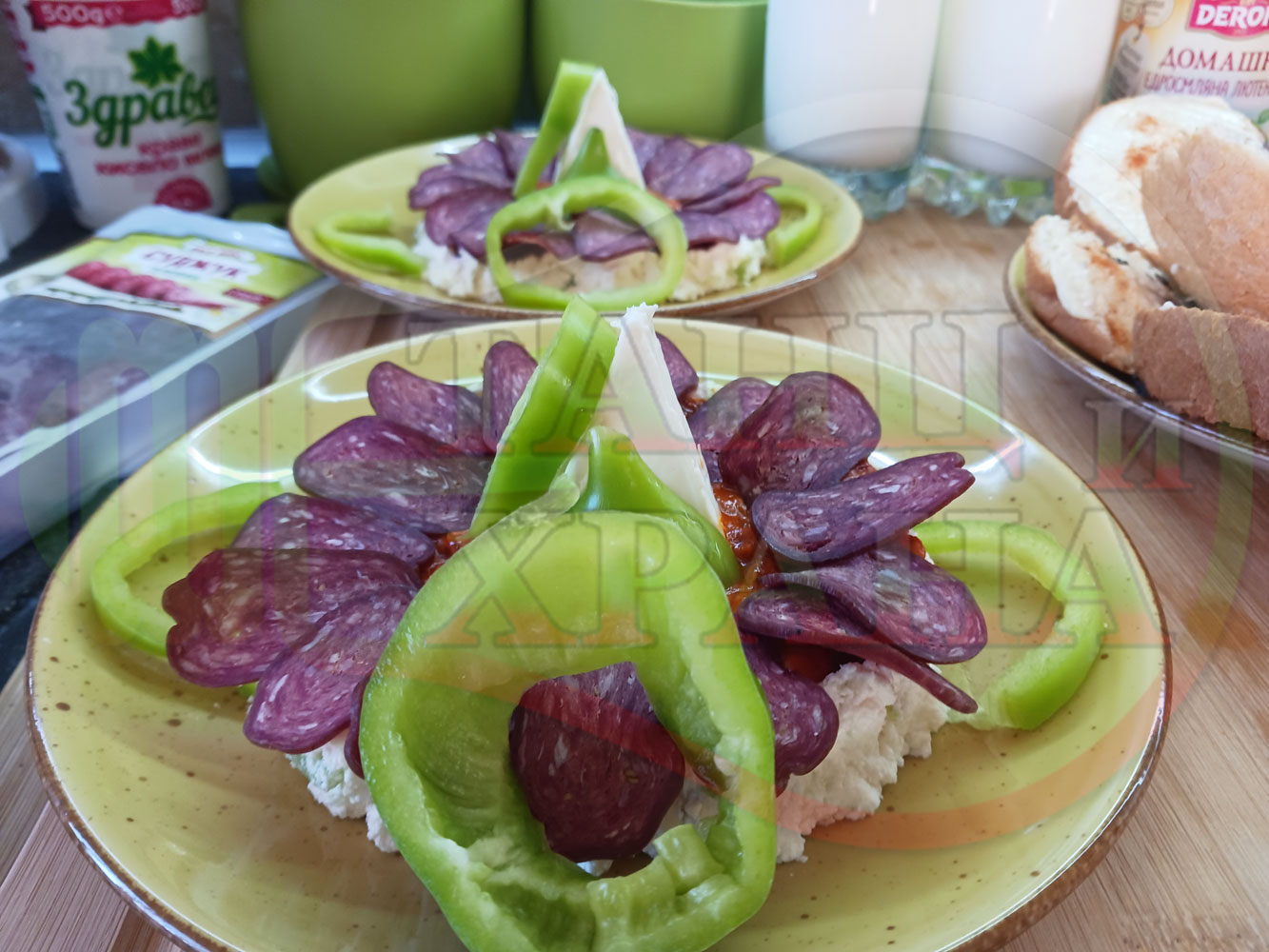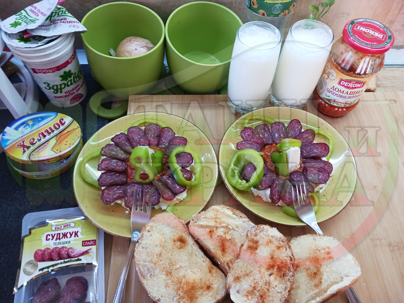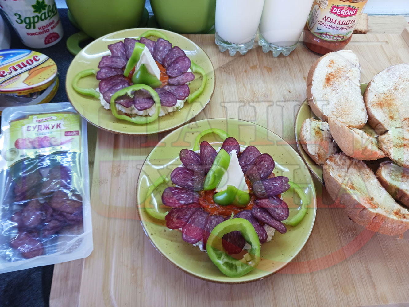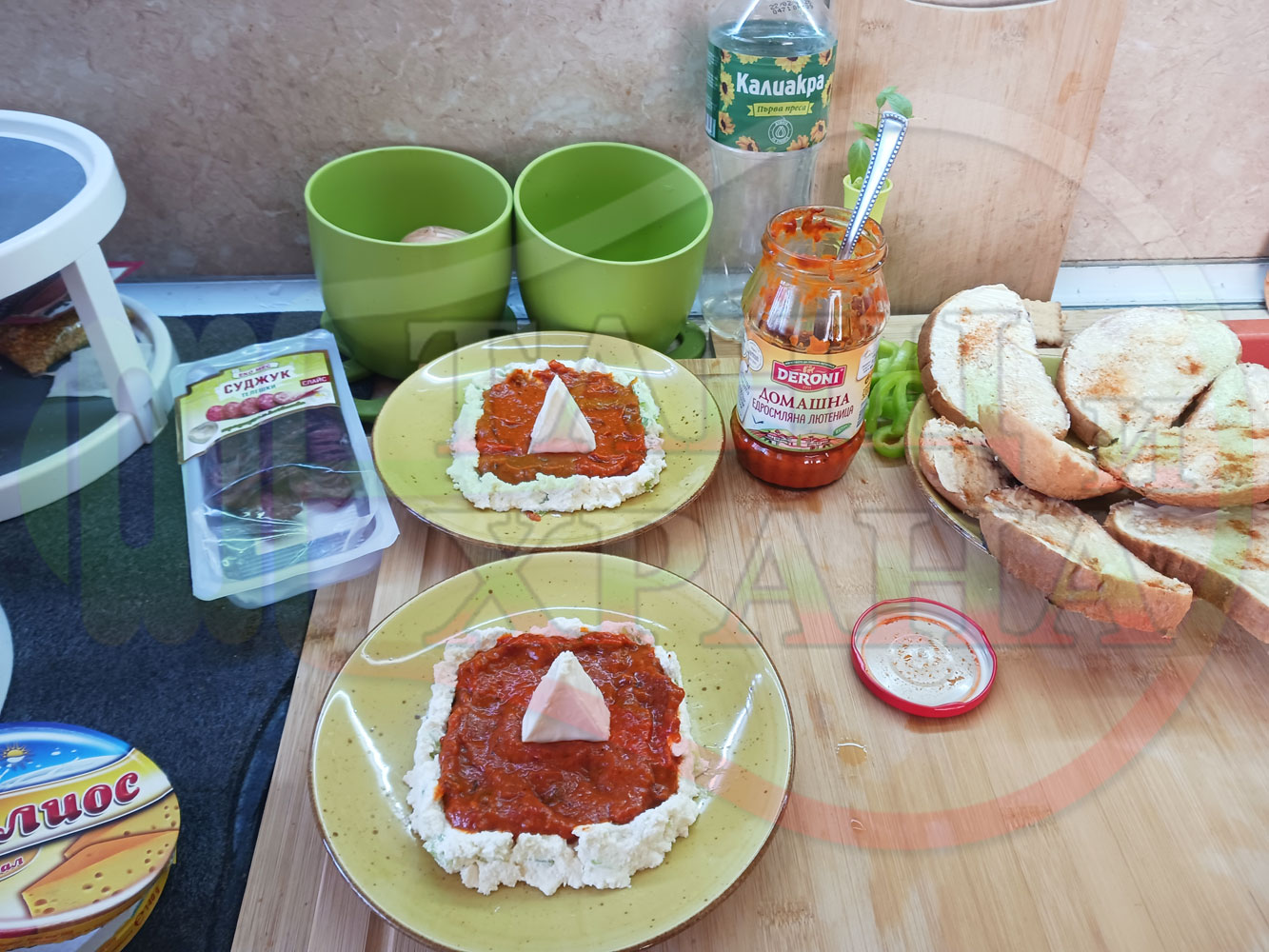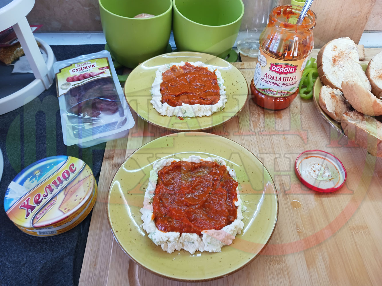 Българска лютенична сурова супа "Суджукова зеленочушкова с БГсирене" приготвена от едросмляна лютеница напълнена в кладенчета от сиренов крем със зелени пресни чушки и краве бяло сирене гарнирана с телешки суджук и топено сирене - двукомпонентна