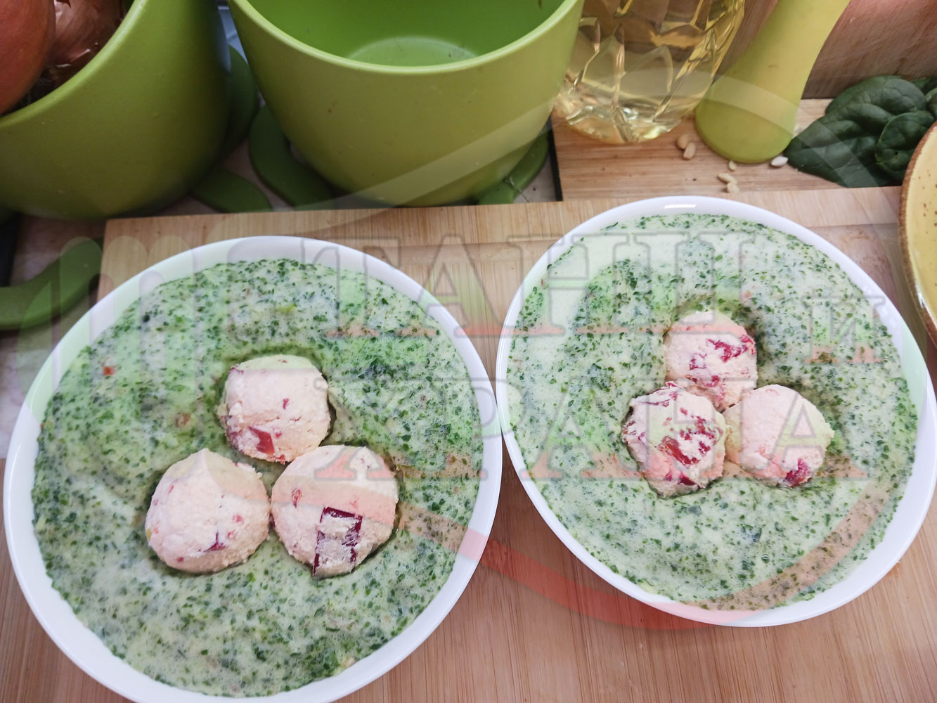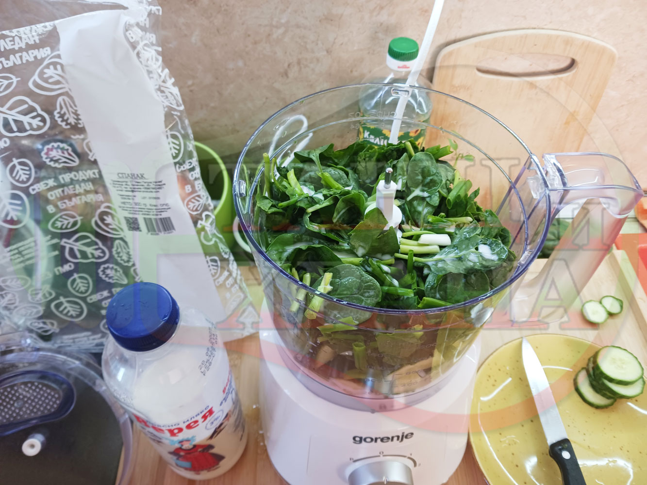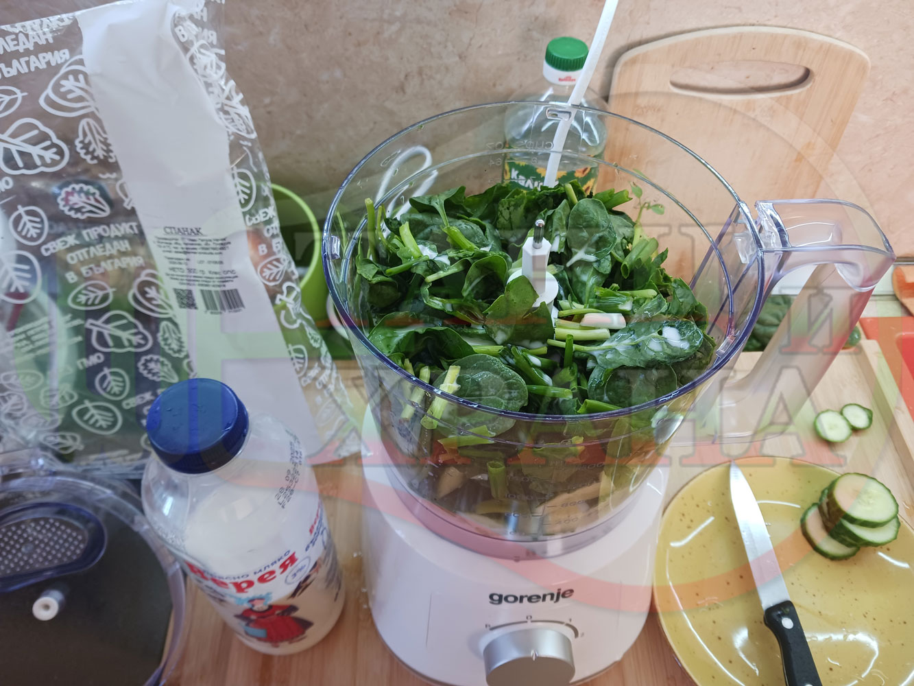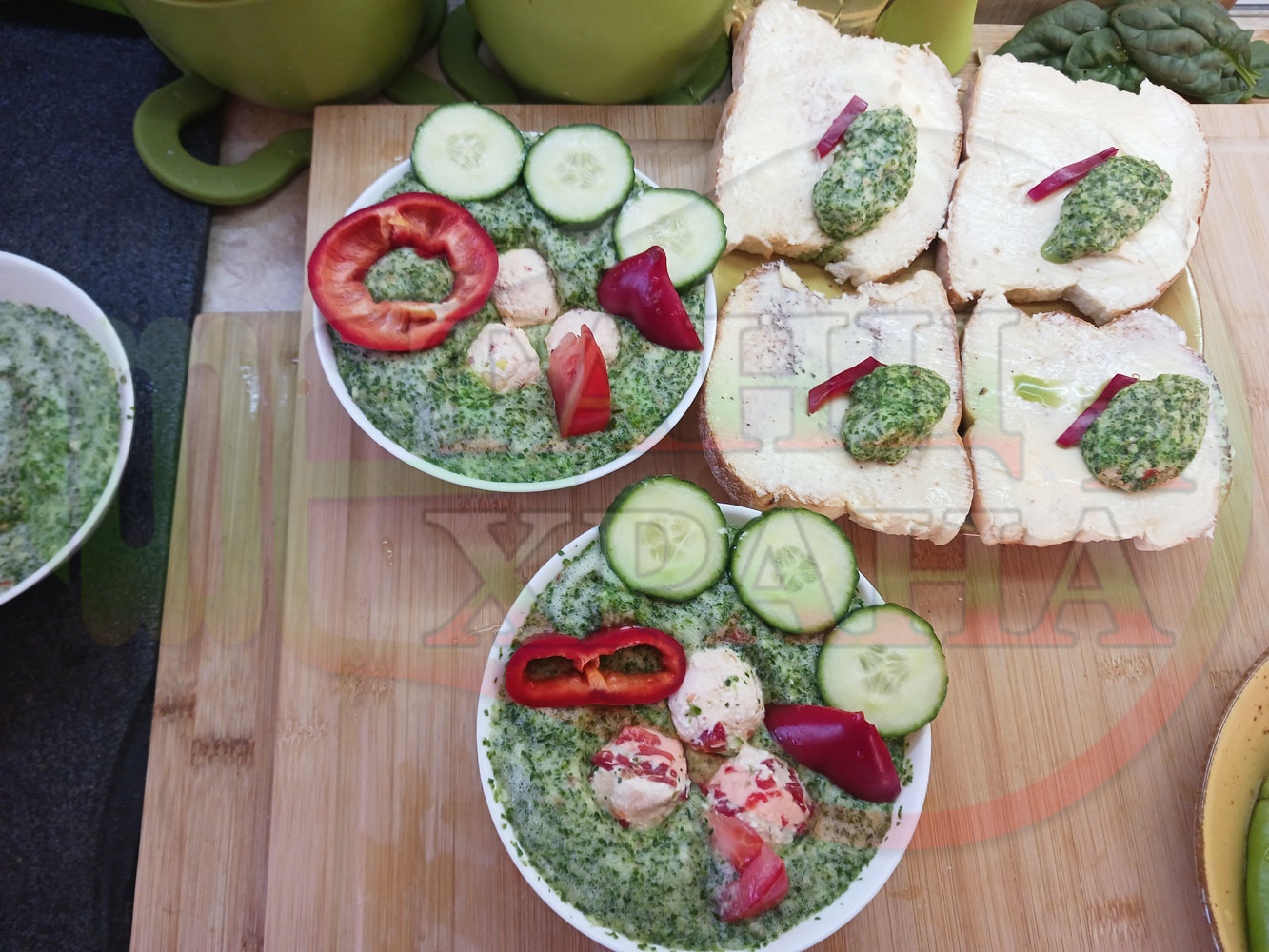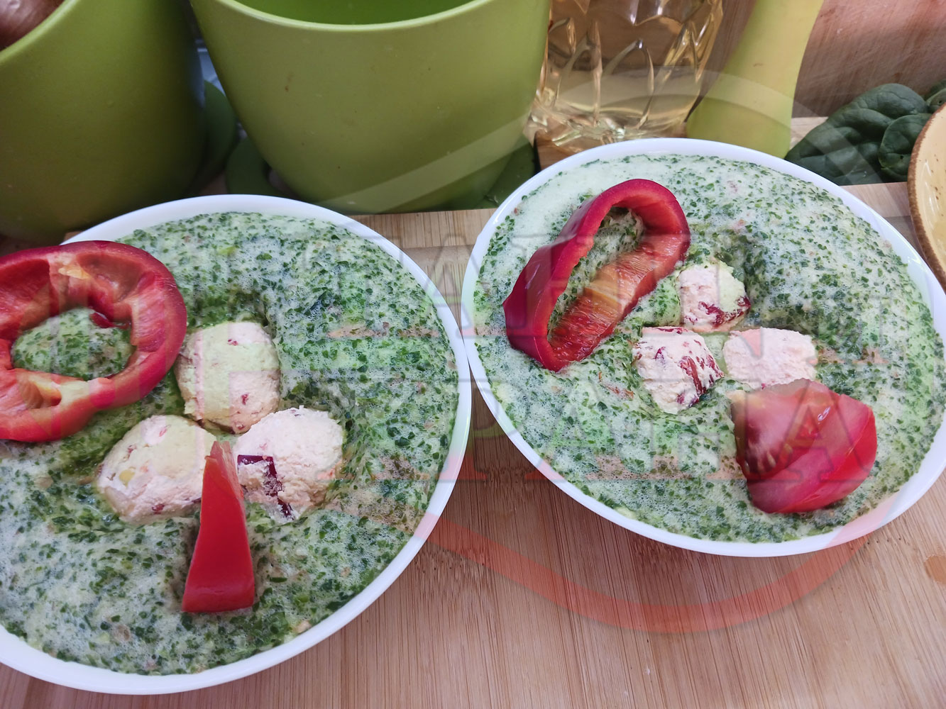 Българската спаначенокраставична сурова, млечна супа, която сътворих се оказа доста вкусна и се спретва буквално за "нула" време с чопър. Вече съм приготвяла краставични супи с прясно мляко (студено, пастьоризирано) вместо с вода и така реших да добавя свеж спанак и домати към супата без никакви подправки като растителна мазнина, сол и други. Спанакът обогатява супата с така характерния си вкус и аромат, който обичам още от детските си години (и към днешна дата супата се хареса от семейството ми). Гарнирах супата с топчета от сиреново червеночушков крем приготвени с българско краве бяло саламурено сирене и се получи най-вкусната сурова супа, която сме хапвали. Двукомпонентността на супите (в голямата си част са авторски с иновативен метод на представяне и комбиниране на продуктите (прилагам метода на двукомпонентността в почти всички видове ястия, които приготвям)), позволява да се комбинират различни сурови и/или запечени продукти, с което се осъвременяват и обогатяват традиционни български супи, ястия, печива и различни гозби. Сиреновите топчета овкусяват супата с неповторимия вкус, който носят в идеална хармония с червените пресни чушки и отново се получи голяма вкусно, вкусна, вкусотия (вкуснотия), която е изключително полезна, обединяваща млечните протеини, минерали и микроелементи с богатството от полезни съставки на спанака, пресния лук, домата и краставицата. laughing От спаначенокраставичната супа заделих малко количество за производно ястие.