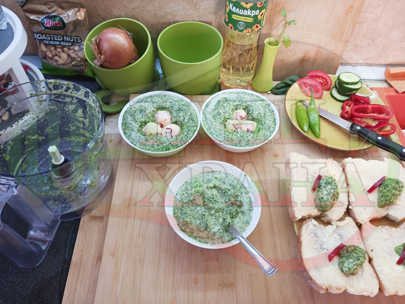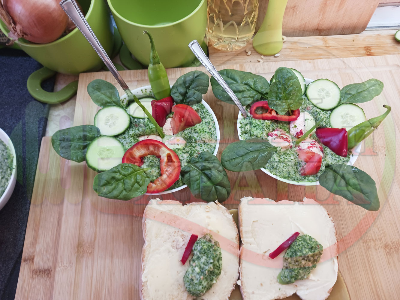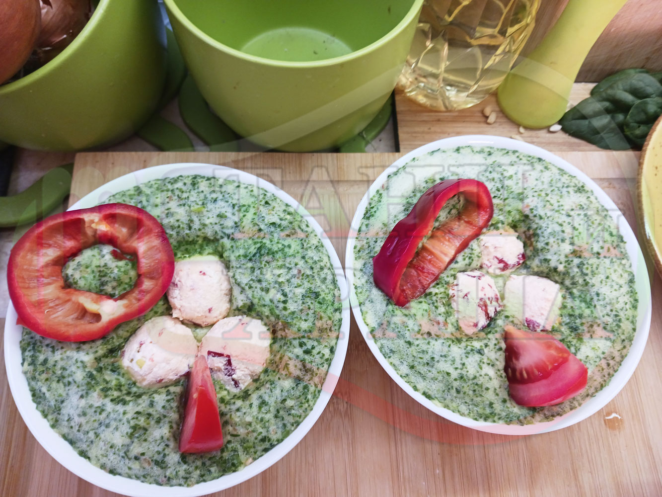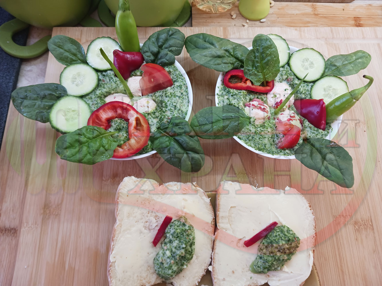Българската спаначенокраставична сурова, млечна супа, която сътворих се оказа доста вкусна и се спретва буквално за "нула" време с чопър. Вече съм приготвяла краставични супи с прясно мляко (студено, пастьоризирано) вместо с вода и така реших да добавя свеж спанак и домати към супата без никакви подправки като растителна мазнина, сол и други. Спанакът обогатява супата с така характерния си вкус и аромат, който обичам още от детските си години (и към днешна дата супата се хареса от семейството ми). Гарнирах супата с топчета от сиреново червеночушков крем приготвени с българско краве бяло саламурено сирене и се получи най-вкусната сурова супа, която сме хапвали. Двукомпонентността на супите (в голямата си част са авторски с иновативен метод на представяне и комбиниране на продуктите (прилагам метода на двукомпонентността в почти всички видове ястия, които приготвям)), позволява да се комбинират различни сурови и/или запечени продукти, с което се осъвременяват и обогатяват традиционни български супи, ястия, печива и различни гозби. Сиреновите топчета овкусяват супата с неповторимия вкус, който носят в идеална хармония с червените пресни чушки и отново се получи голяма вкусно, вкусна, вкусотия (вкуснотия), която е изключително полезна, обединяваща млечните протеини, минерали и микроелементи с богатството от полезни съставки на спанака, пресния лук, домата и краставицата. laughing От спаначенокраставичната супа заделих малко количество за производно ястие.