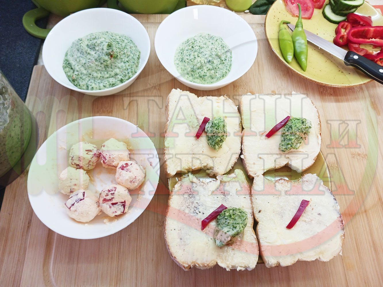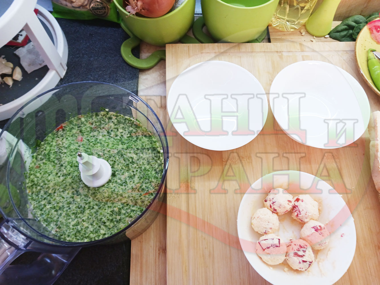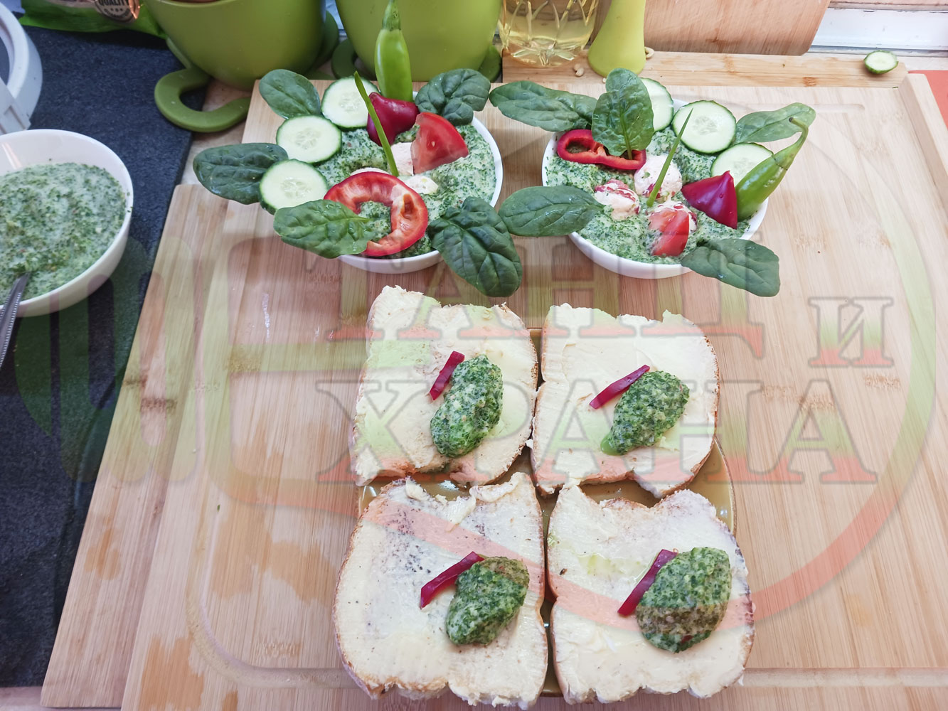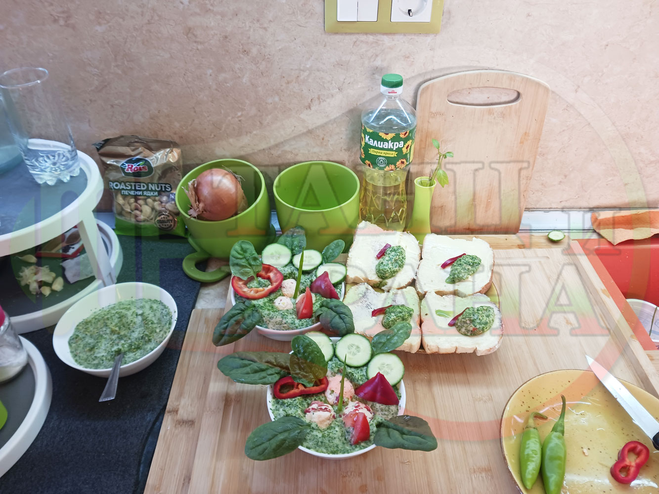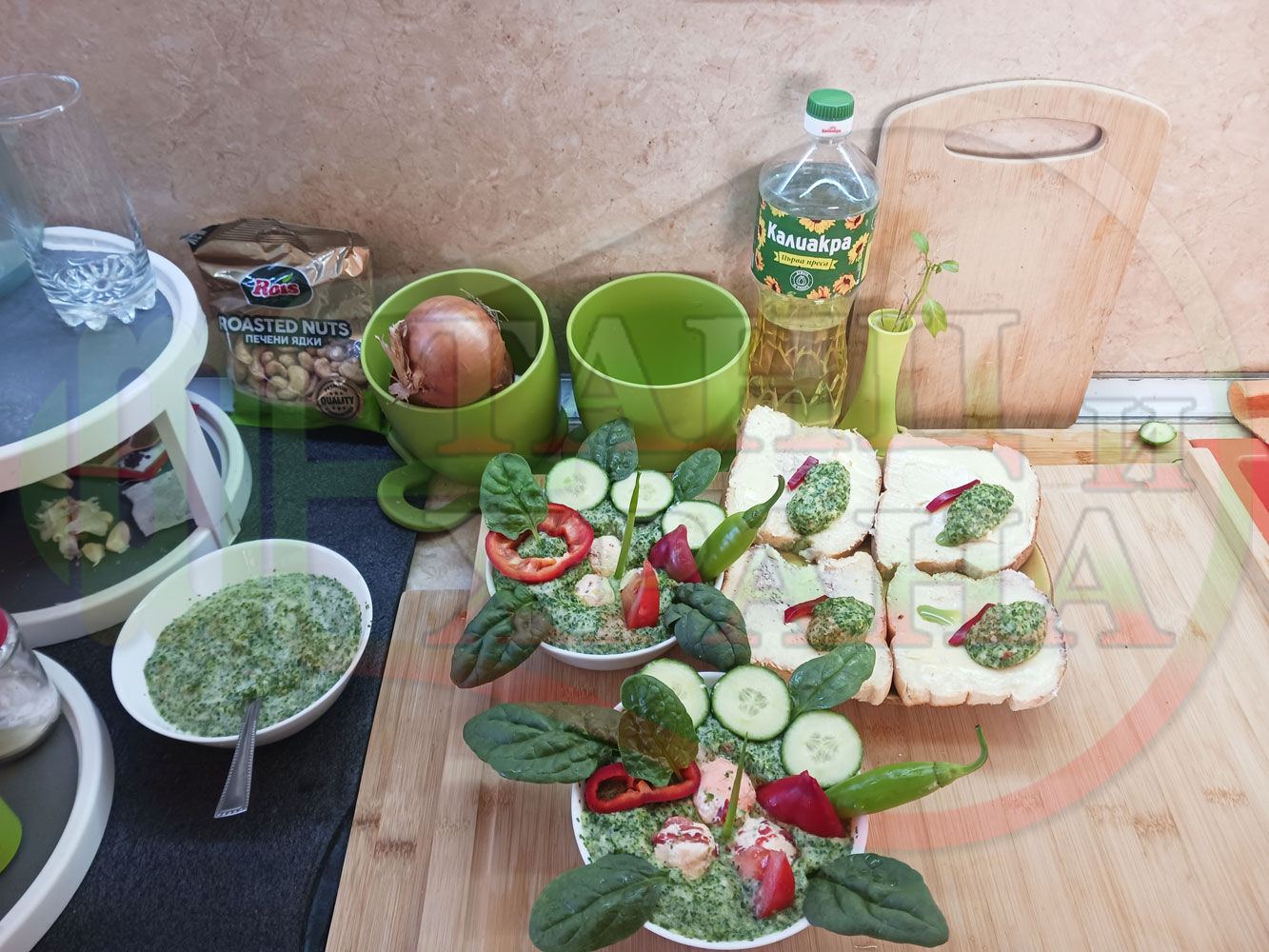 Българската спаначенокраставична сурова, млечна супа, която сътворих се оказа доста вкусна и се спретва буквално за "нула" време с чопър. Вече съм приготвяла краставични супи с прясно мляко (студено, пастьоризирано) вместо с вода и така реших да добавя свеж спанак и домати към супата без никакви подправки като растителна мазнина, сол и други. Спанакът обогатява супата с така характерния си вкус и аромат, който обичам още от детските си години (и към днешна дата супата се хареса от семейството ми). Гарнирах супата с топчета от сиреново червеночушков крем приготвени с българско краве бяло саламурено сирене и се получи най-вкусната сурова супа, която сме хапвали. Двукомпонентността на супите (в голямата си част са авторски с иновативен метод на представяне и комбиниране на продуктите (прилагам метода на двукомпонентността в почти всички видове ястия, които приготвям)), позволява да се комбинират различни сурови и/или запечени продукти, с което се осъвременяват и обогатяват традиционни български супи, ястия, печива и различни гозби. Сиреновите топчета овкусяват супата с неповторимия вкус, който носят в идеална хармония с червените пресни чушки и отново се получи голяма вкусно, вкусна, вкусотия (вкуснотия), която е изключително полезна, обединяваща млечните протеини, минерали и микроелементи с богатството от полезни съставки на спанака, пресния лук, домата и краставицата. laughing От спаначенокраставичната супа заделих малко количество за производно ястие.