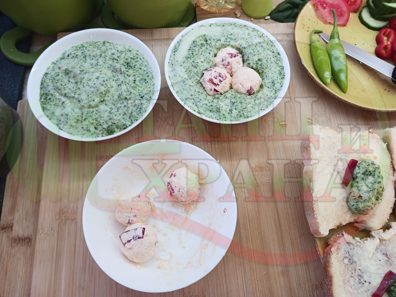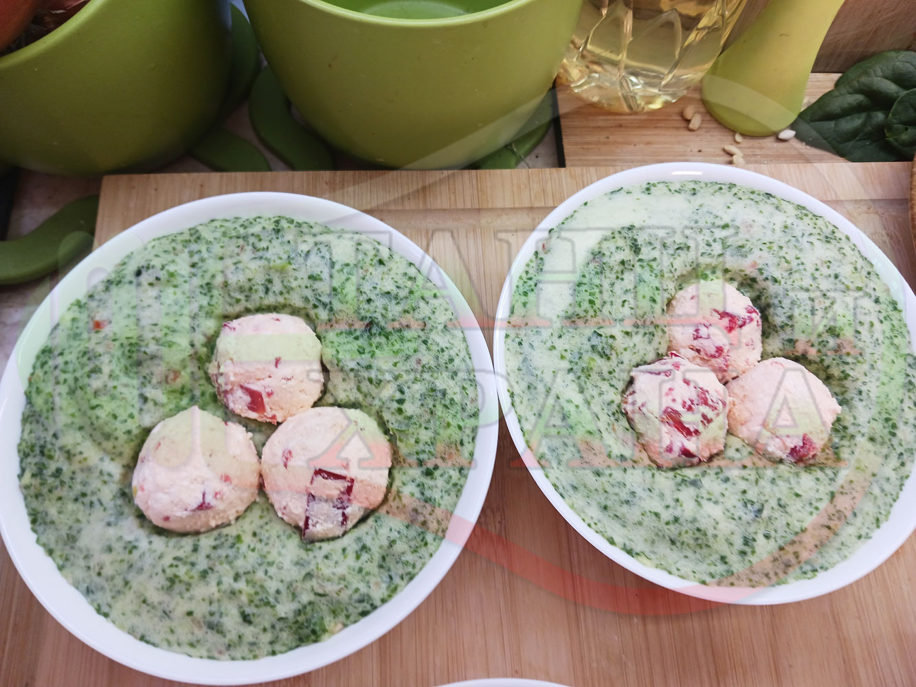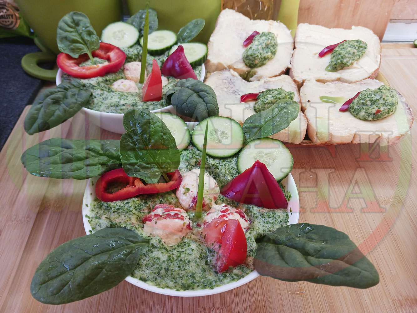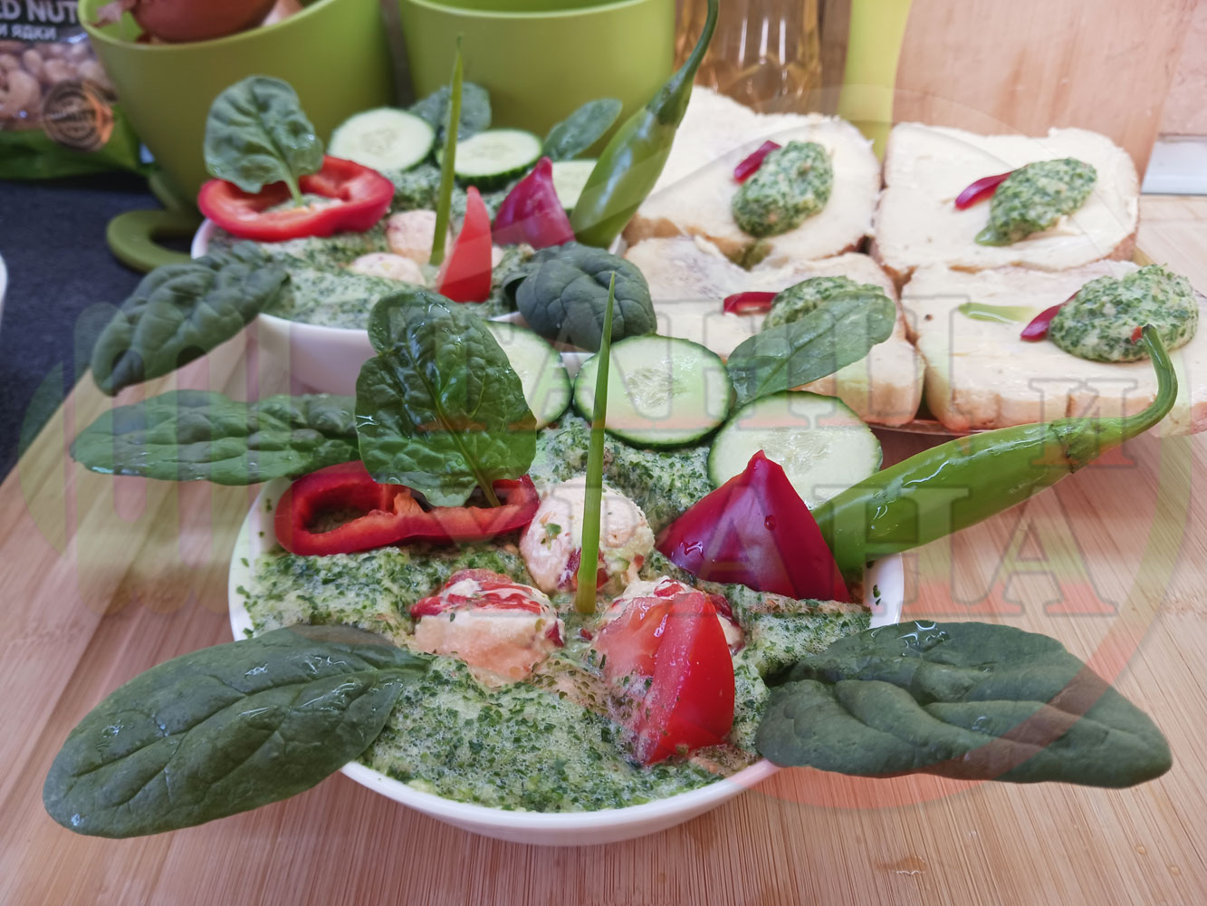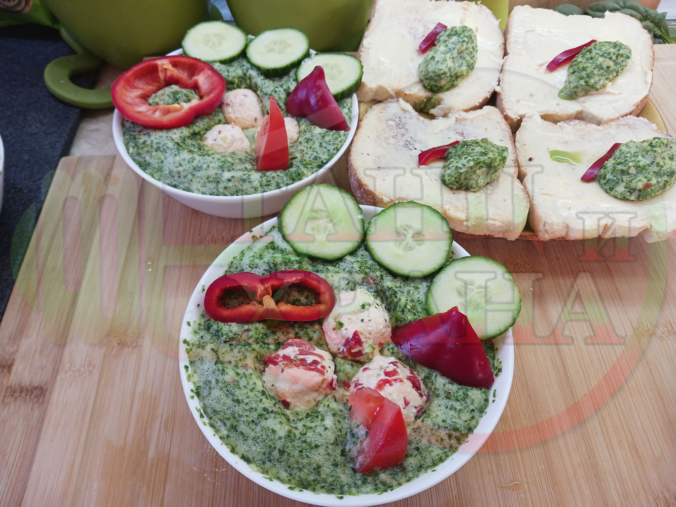 Българска сурова супа "Спаначенокраставична прясномлечна доматенолучена" приготвена от спанак, краставици, прясно мляко, зелен лук и домати гарнирана с топчета от сиреново червеночушков крем с краве бяло сирене и червени пресни чушки - двукомпонентна