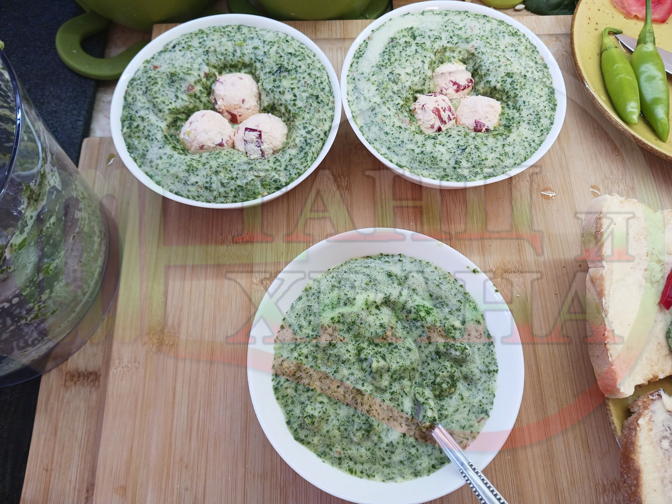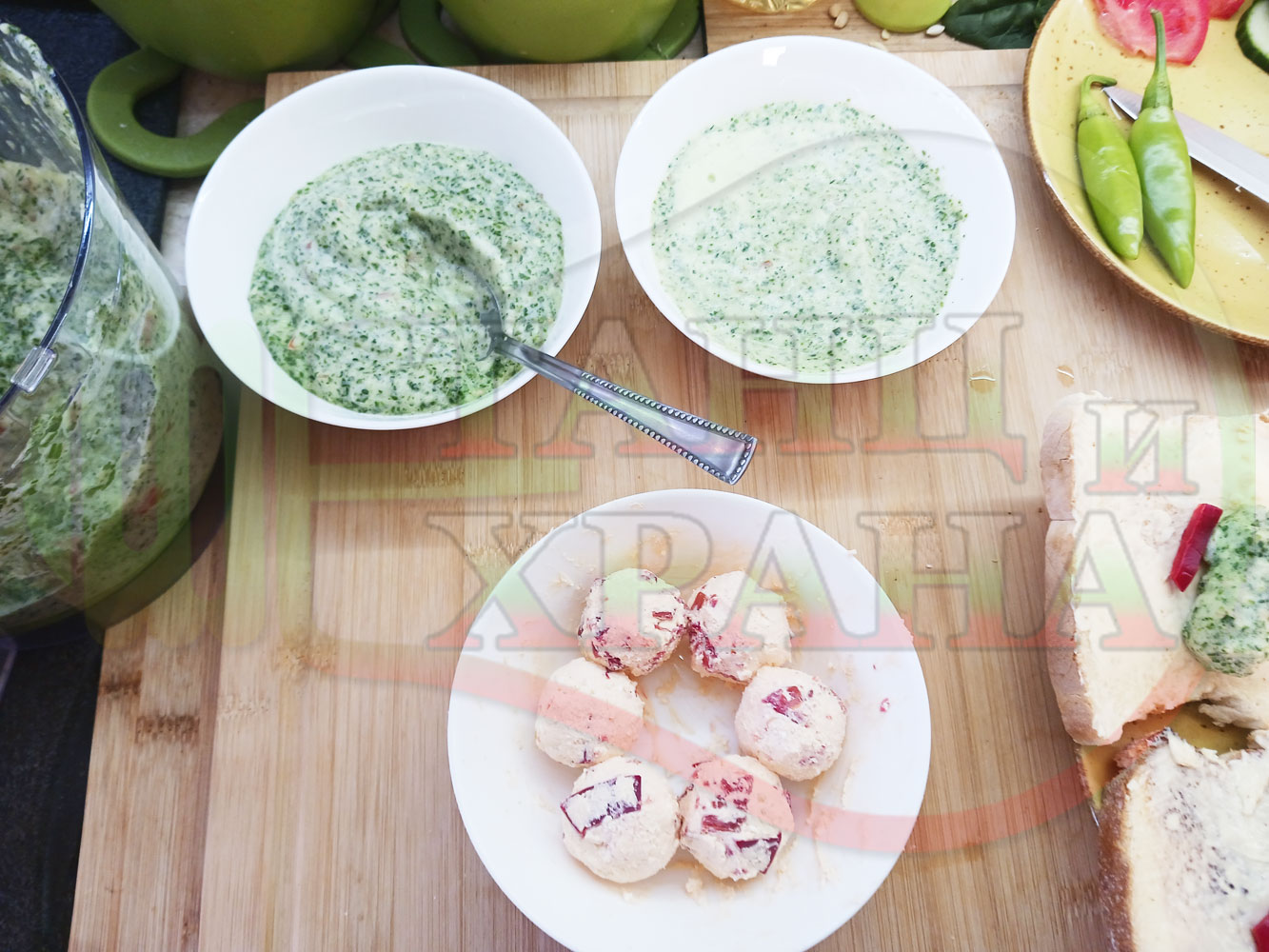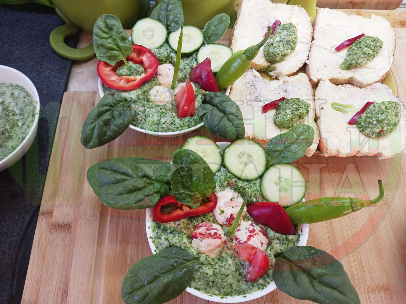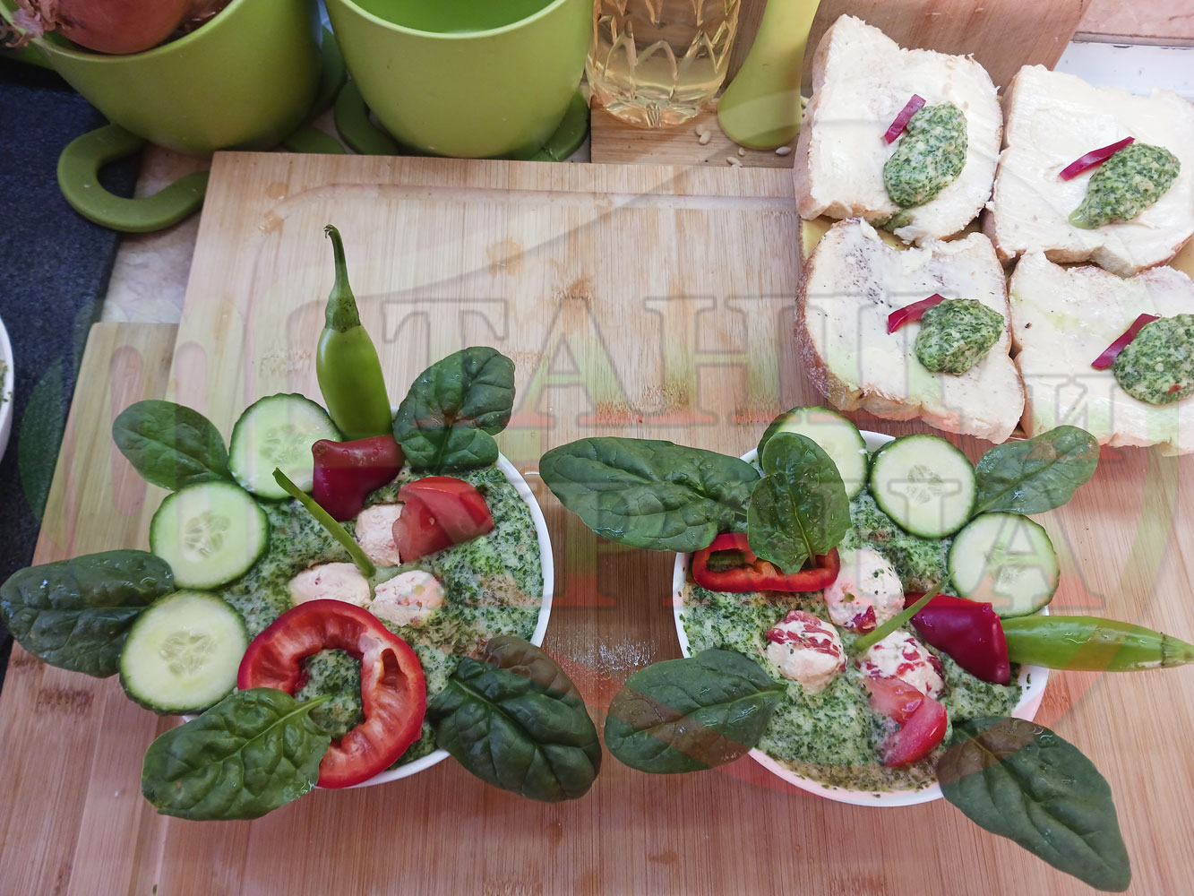 Българска сурова супа "Спаначенокраставична прясномлечна доматенолучена" приготвена от спанак, краставици, прясно мляко, зелен лук и домати гарнирана с топчета от сиреново червеночушков крем с краве бяло сирене и червени пресни чушки - двукомпонентна