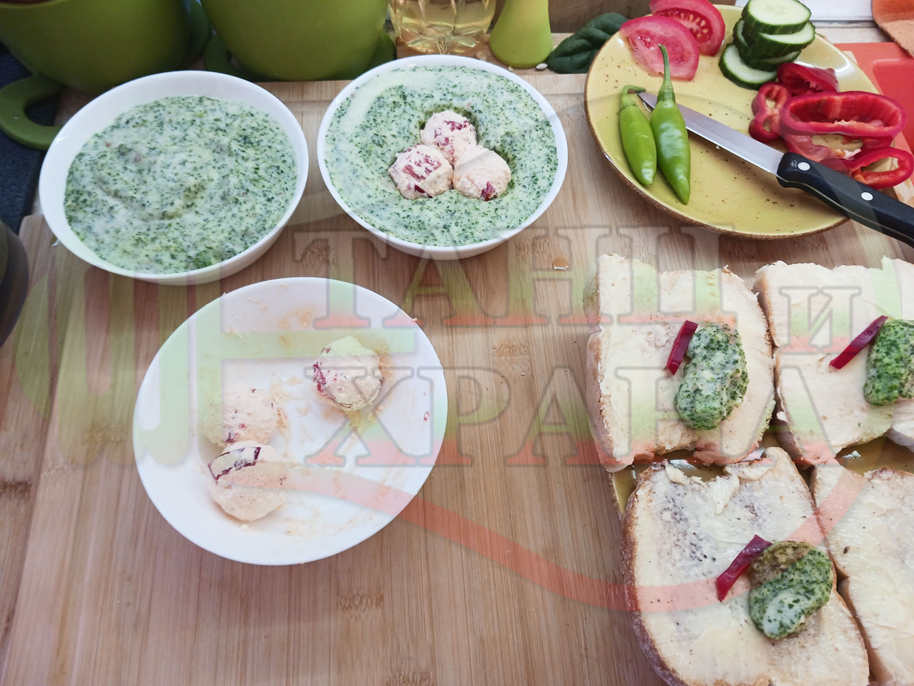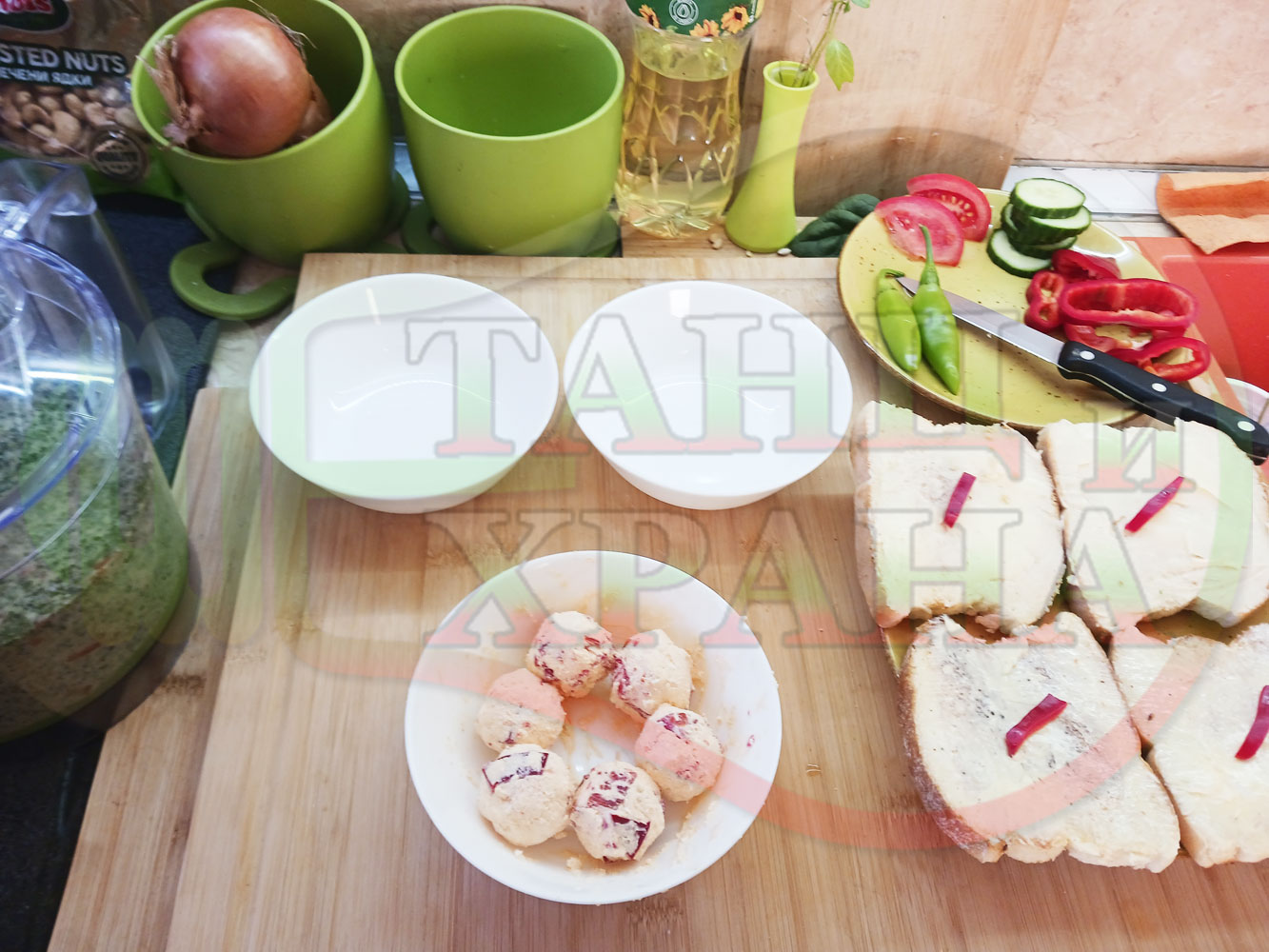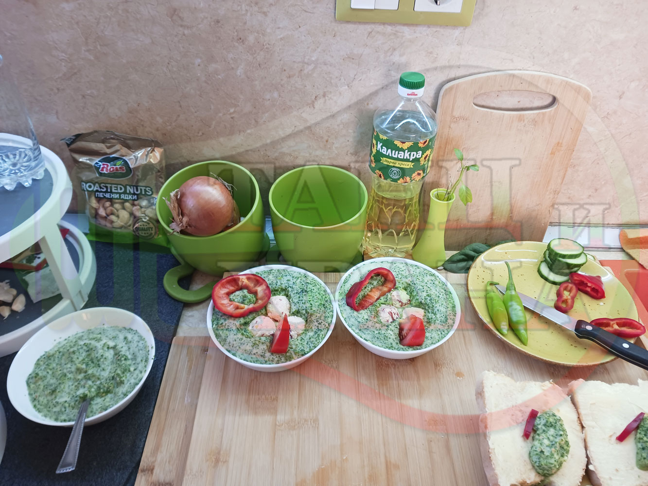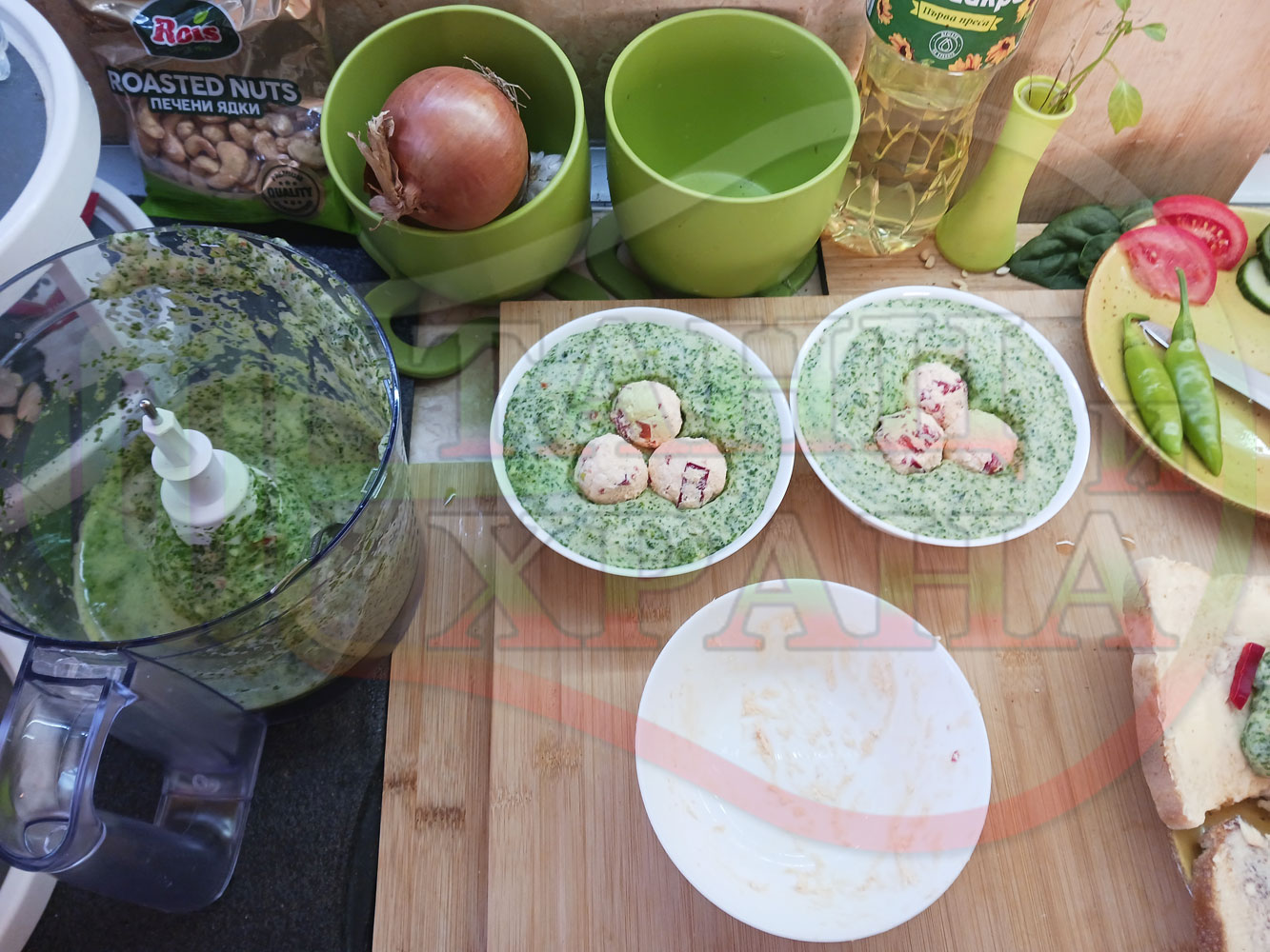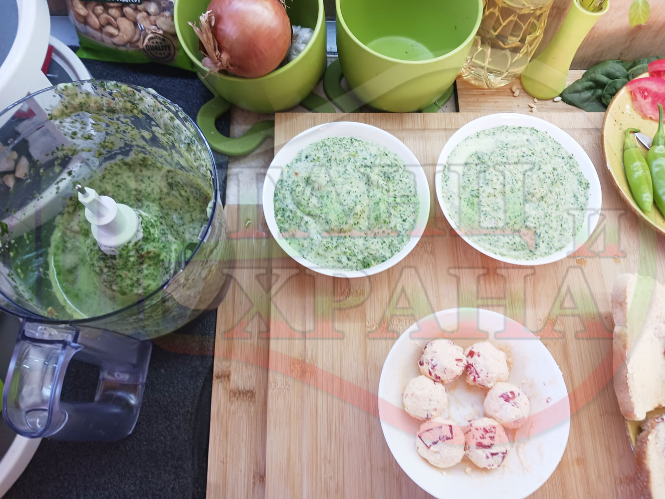 Българска сурова супа "Спаначенокраставична прясномлечна доматенолучена" приготвена от спанак, краставици, прясно мляко, зелен лук и домати гарнирана с топчета от сиреново червеночушков крем с краве бяло сирене и червени пресни чушки - двукомпонентна