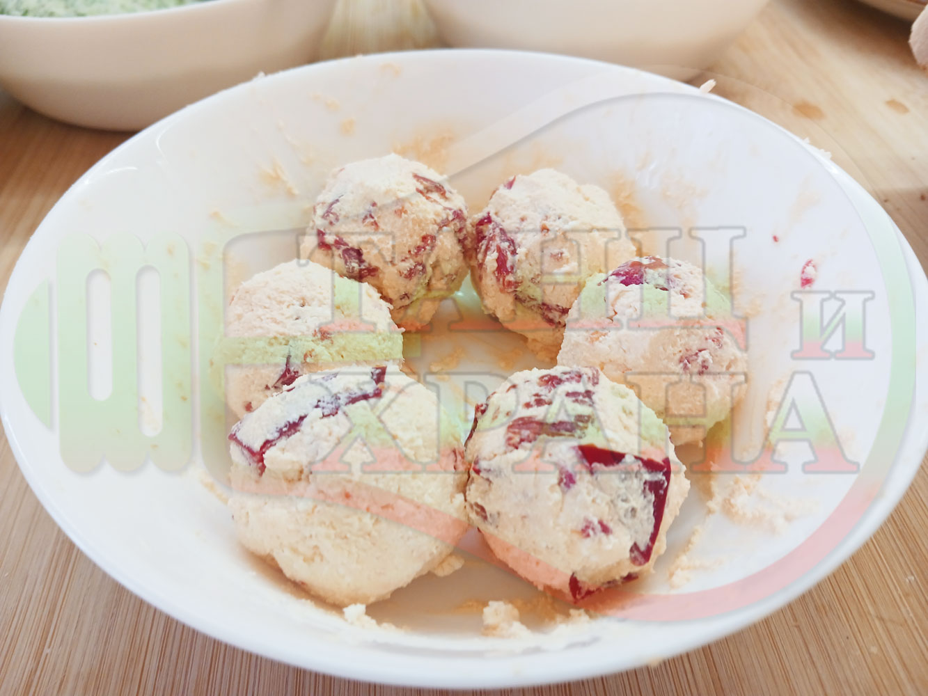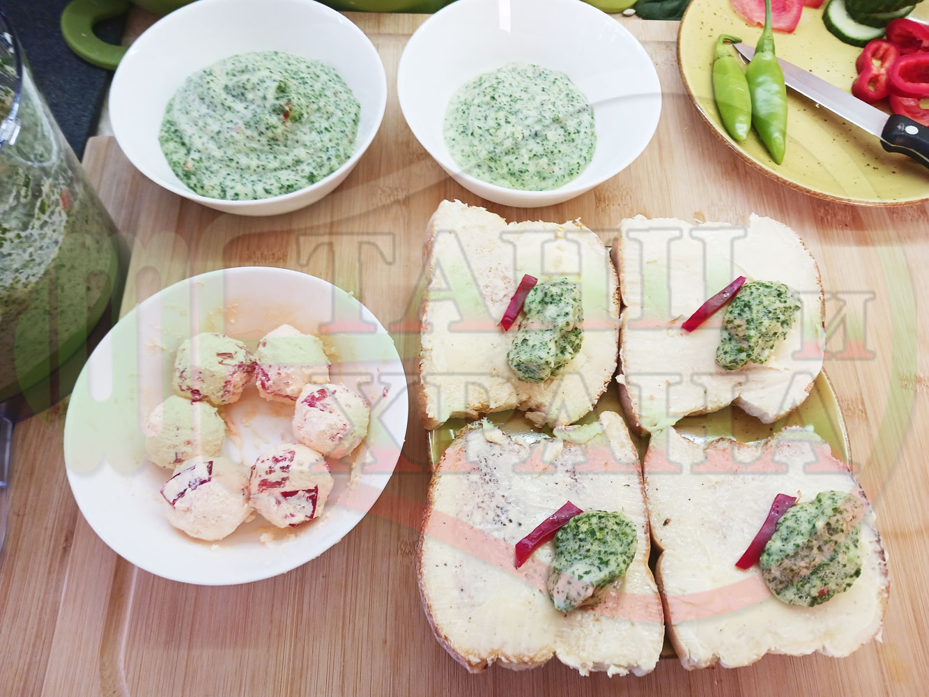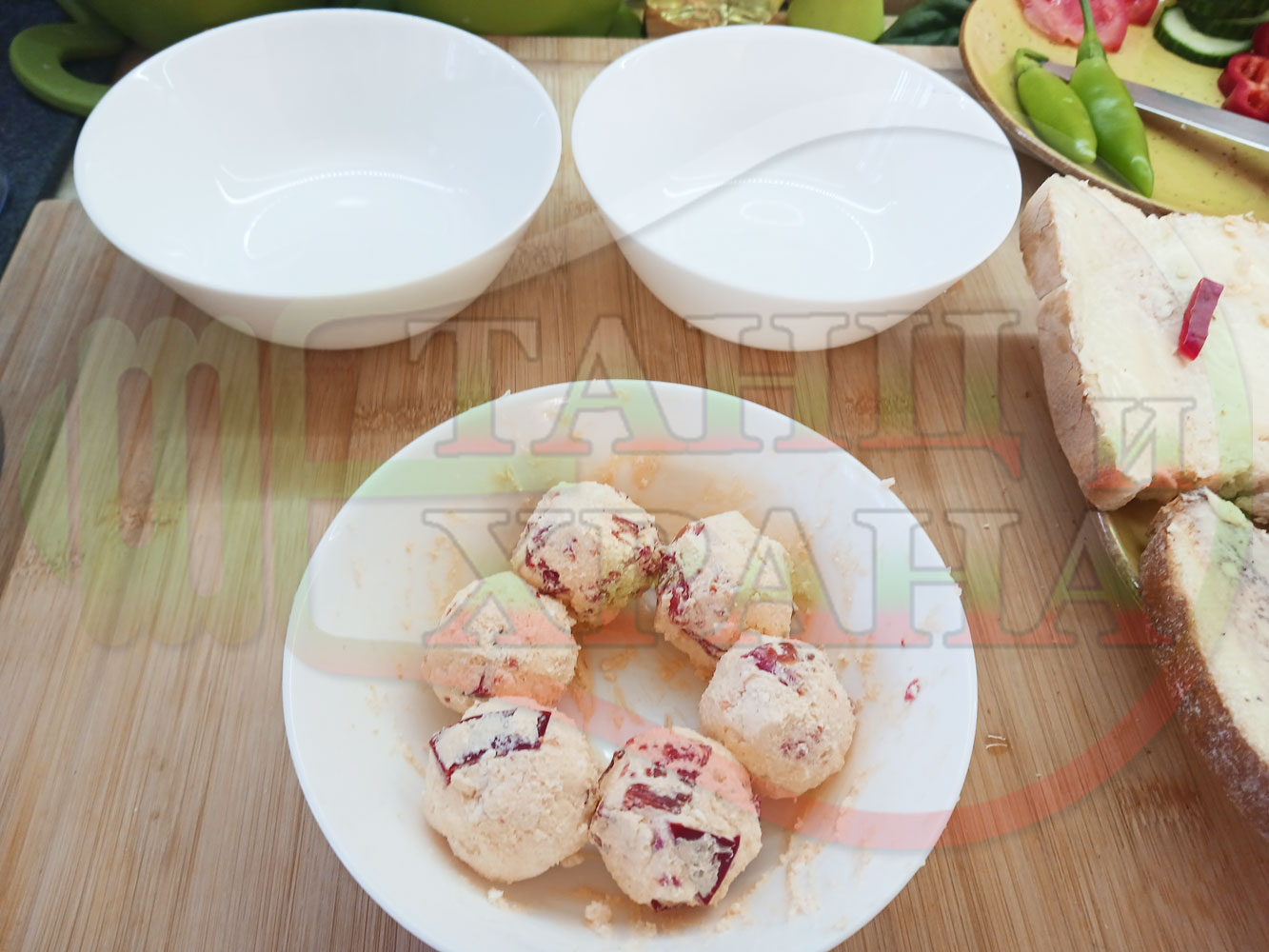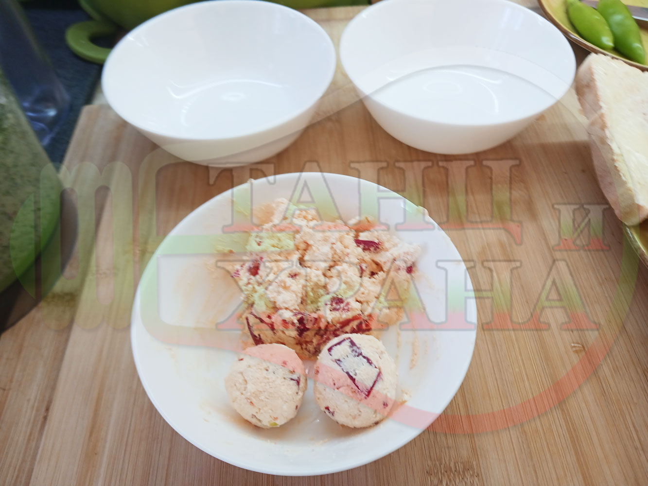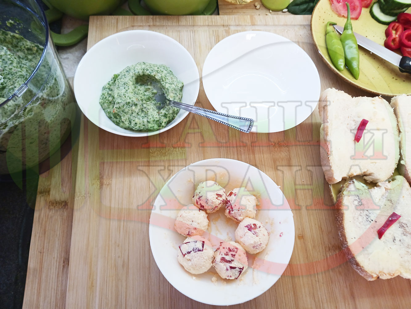 Българска сурова супа "Спаначенокраставична прясномлечна доматенолучена" приготвена от спанак, краставици, прясно мляко, зелен лук и домати гарнирана с топчета от сиреново червеночушков крем с краве бяло сирене и червени пресни чушки - двукомпонентна