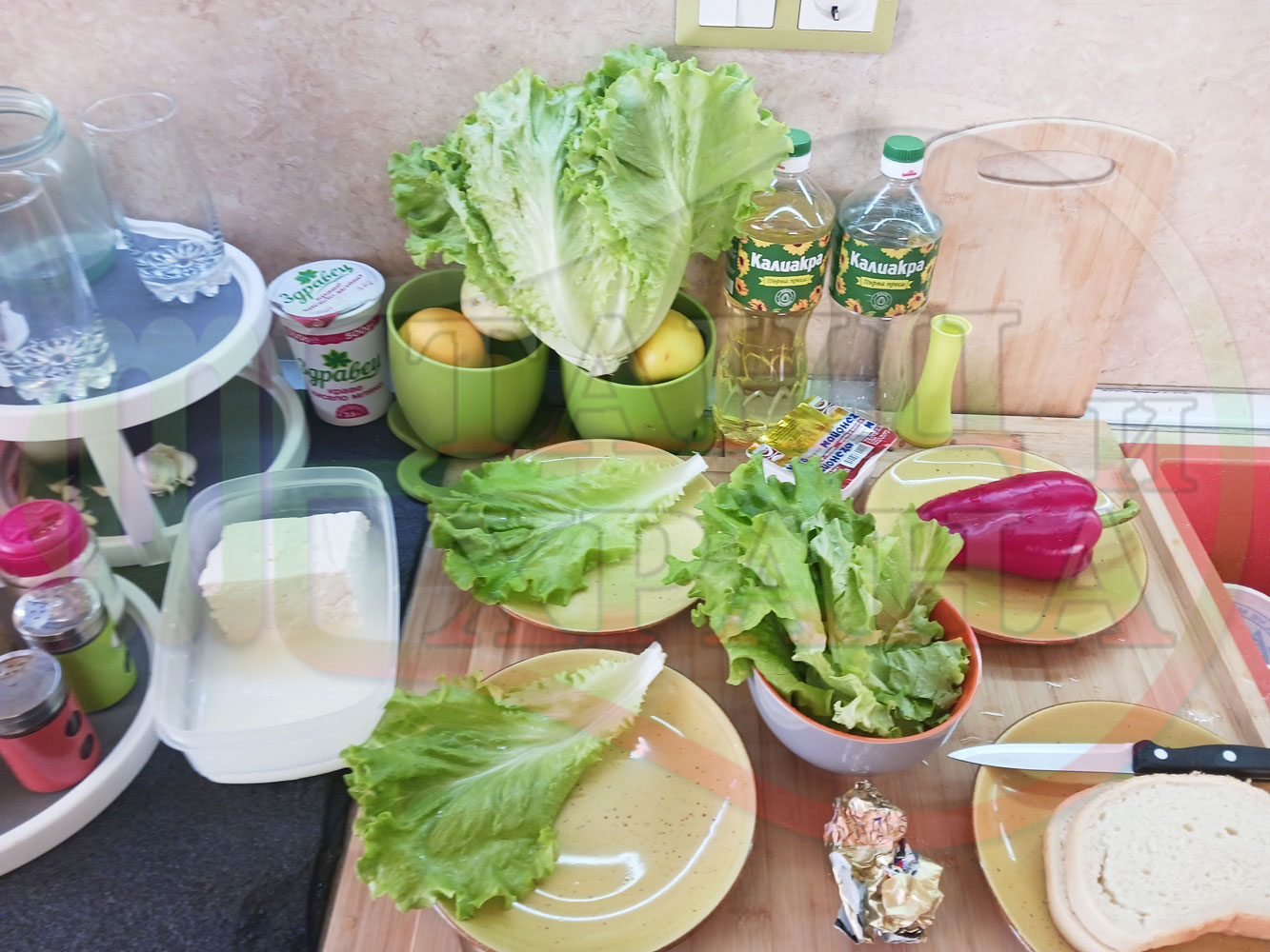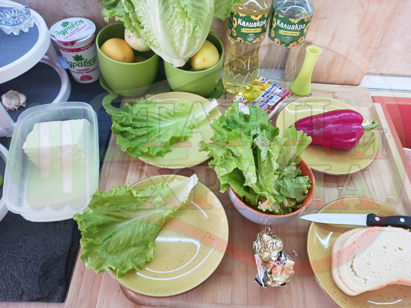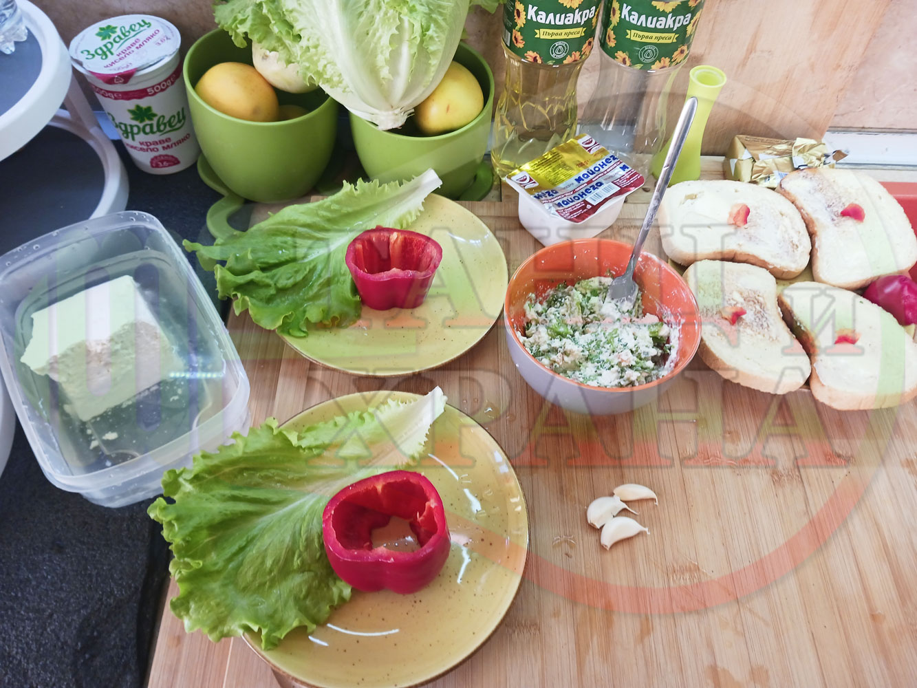 ПРОДУКТИ: Приблизителни количества за зеленчукова салата със сурови пълнени чушки"Маруленочервеночушкова майонезена с БГсирене" приготвена от червени пресни пиперки напълнени със сиренов крем с маруля, чесън, майонеза и краве бяло сирене гарнирани с филе "Елена" - двукомпонентна