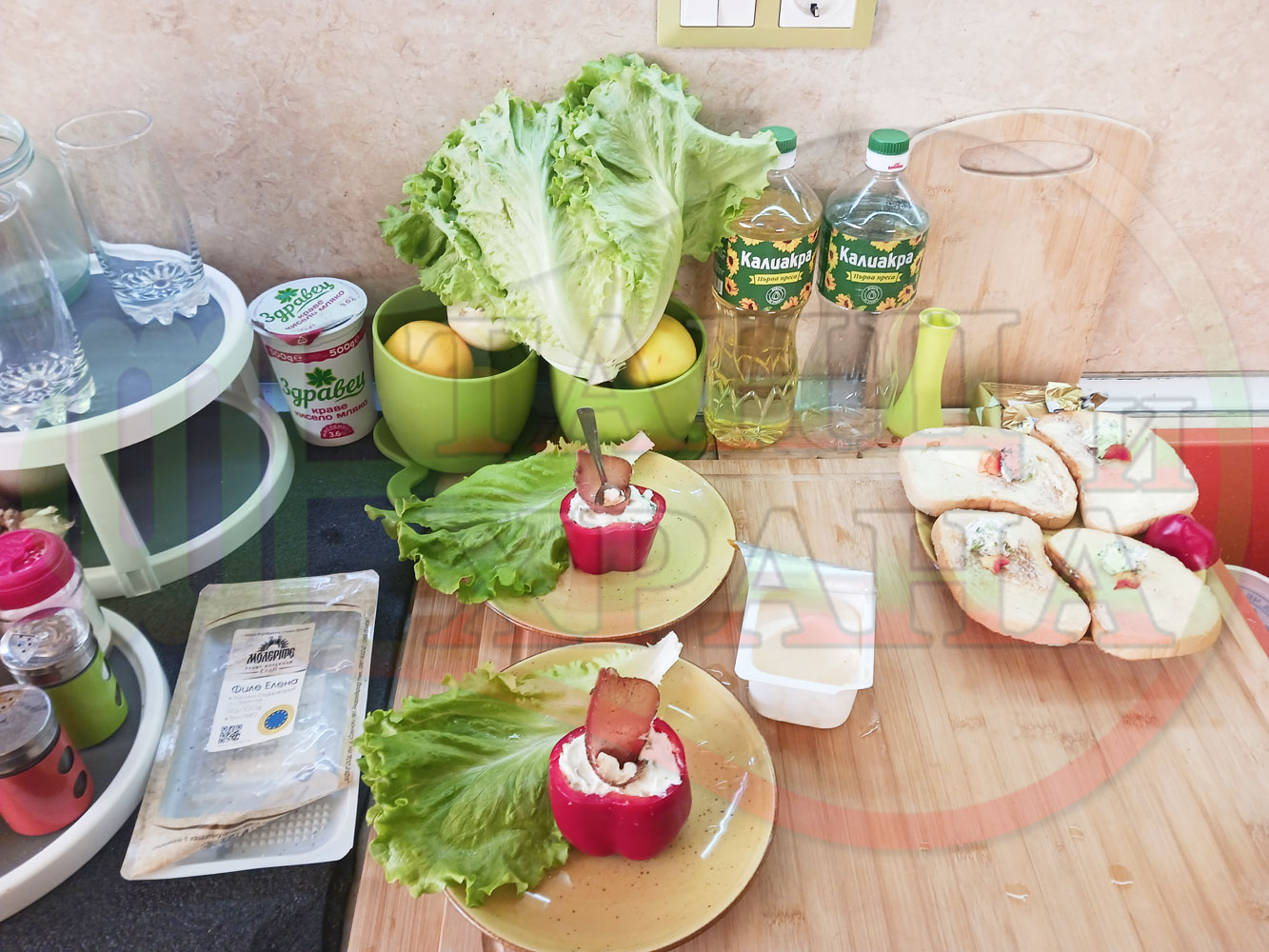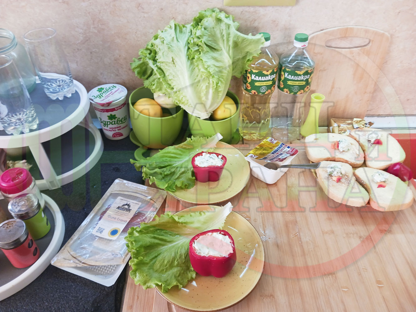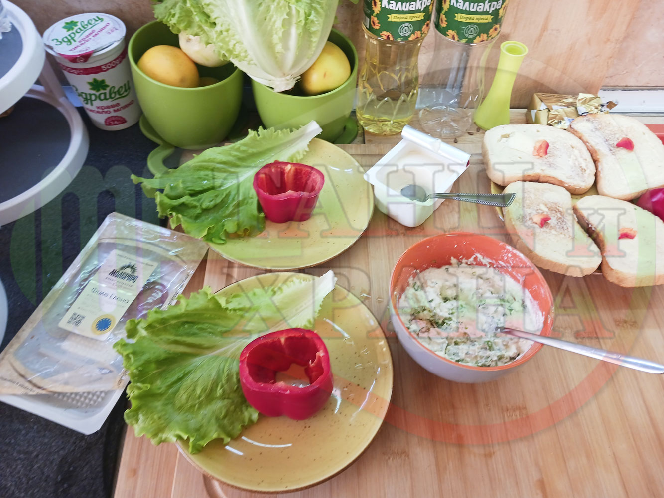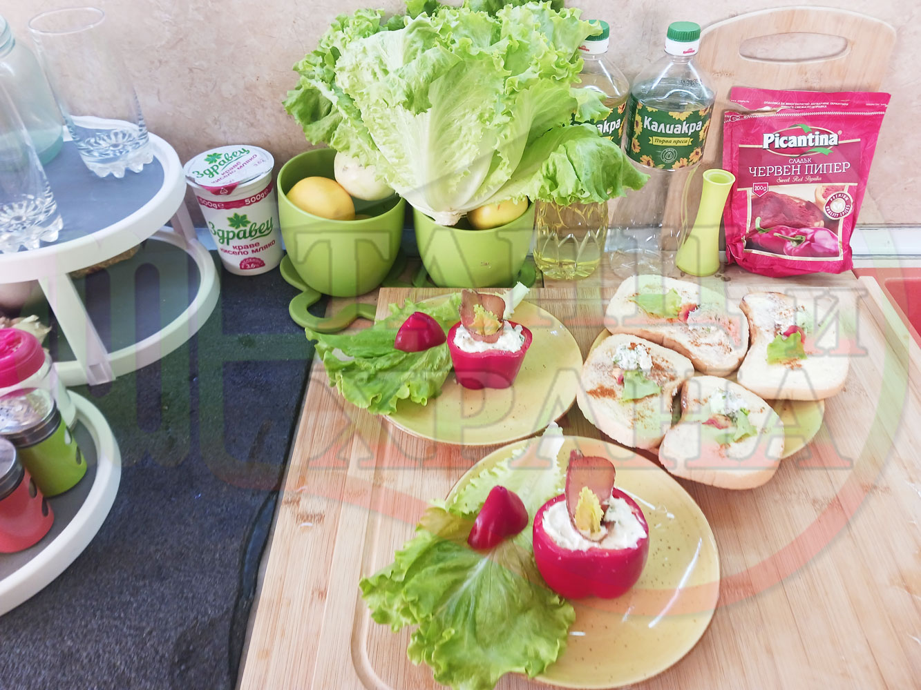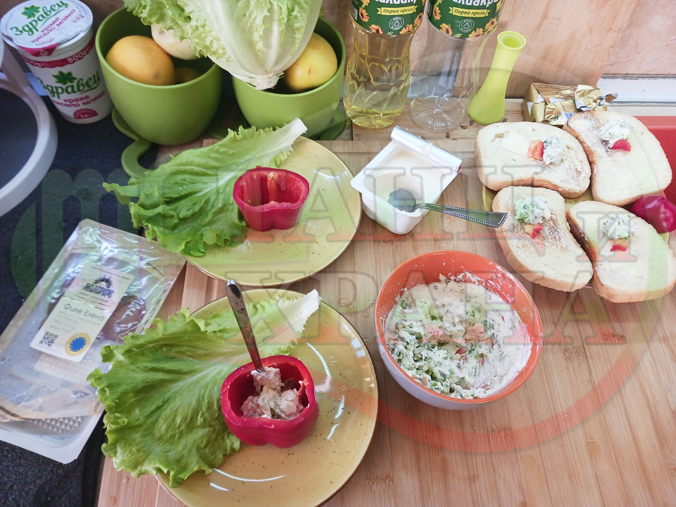 Зеленчукова салата със сурови пълнени чушки"Маруленочервеночушкова майонезена с БГсирене" приготвена от червени пресни пиперки напълнени със сиренов крем с маруля, чесън, майонеза и краве бяло сирене гарнирани с филе "Елена" - двукомпонентна