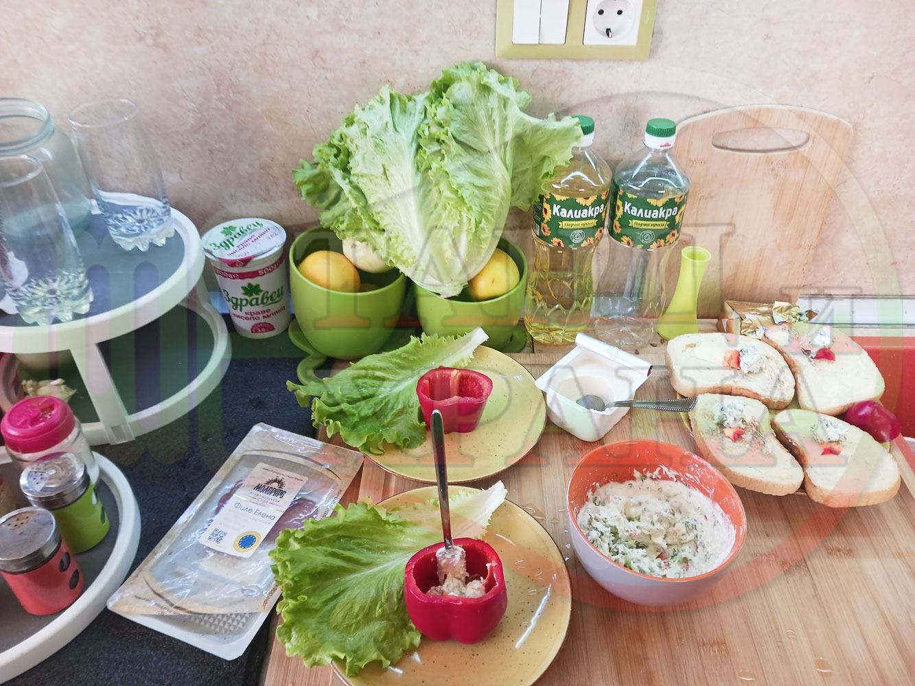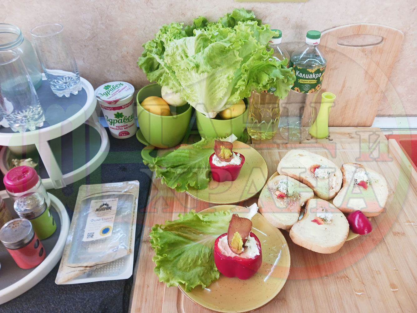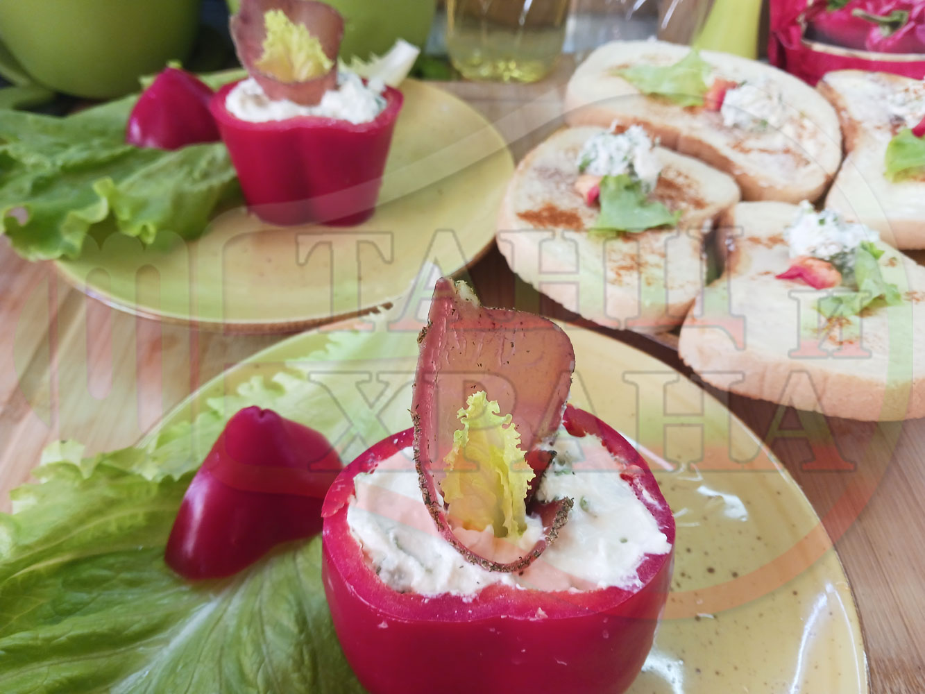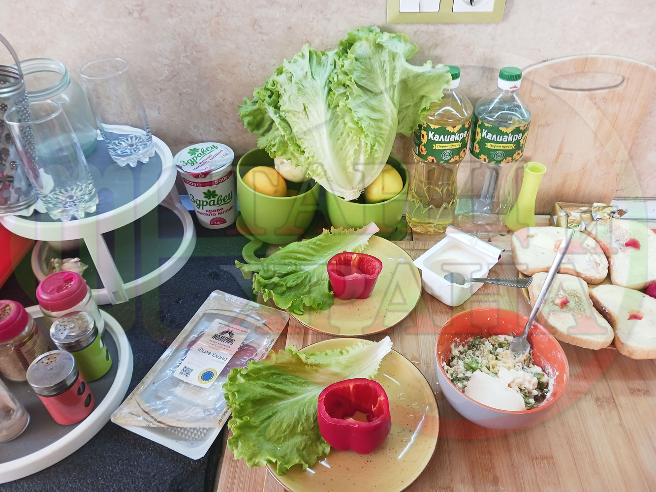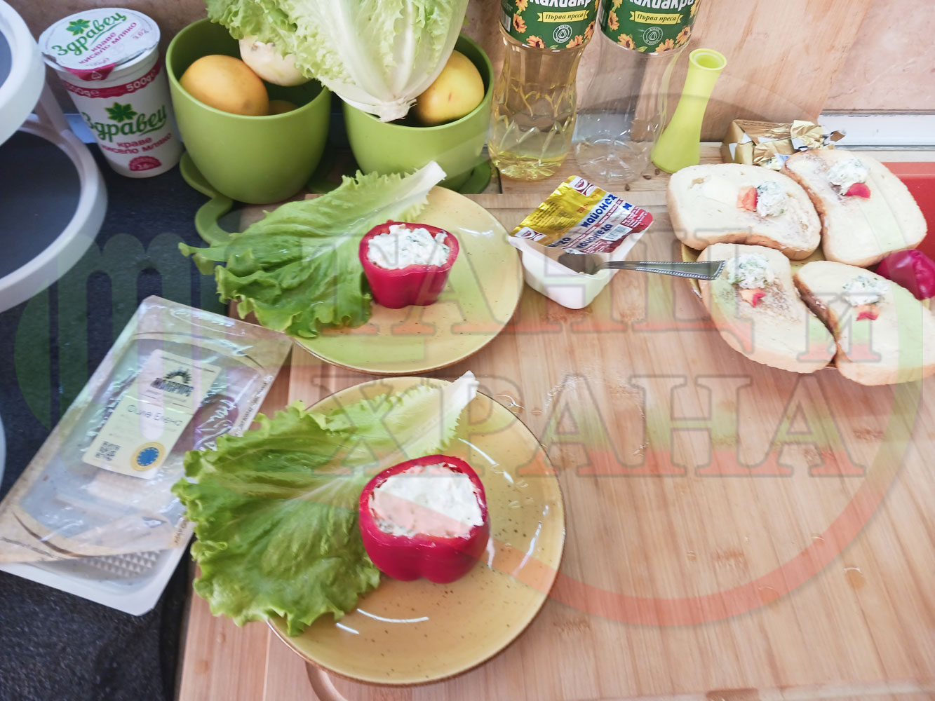 Зеленчукова салата със сурови пълнени чушки"Маруленочервеночушкова майонезена с БГсирене" приготвена от червени пресни пиперки напълнени със сиренов крем с маруля, чесън, майонеза и краве бяло сирене гарнирани с филе "Елена" - двукомпонентна