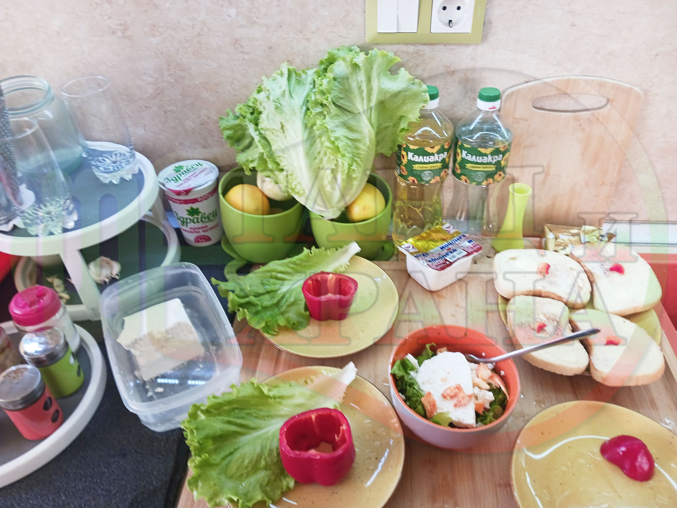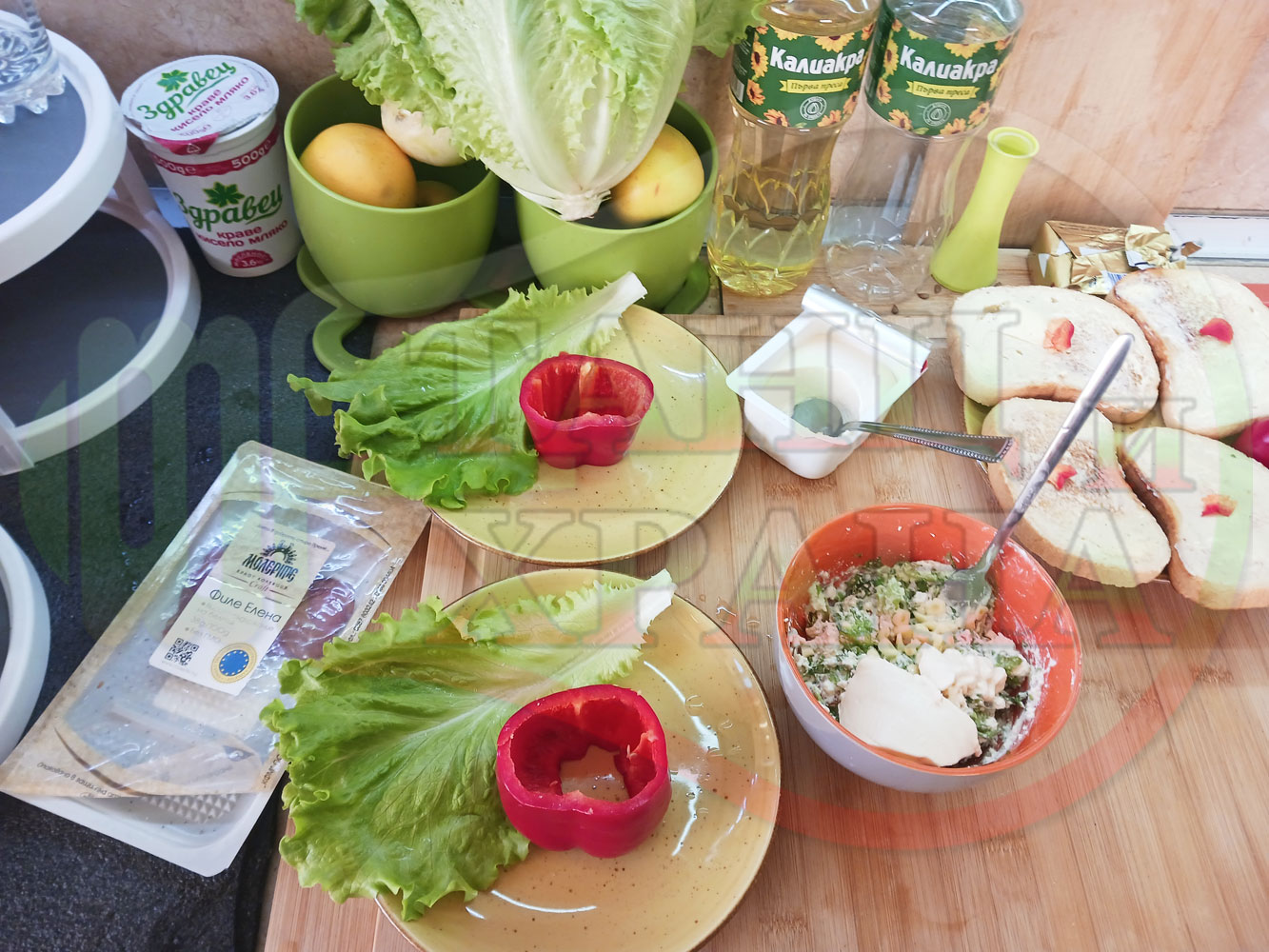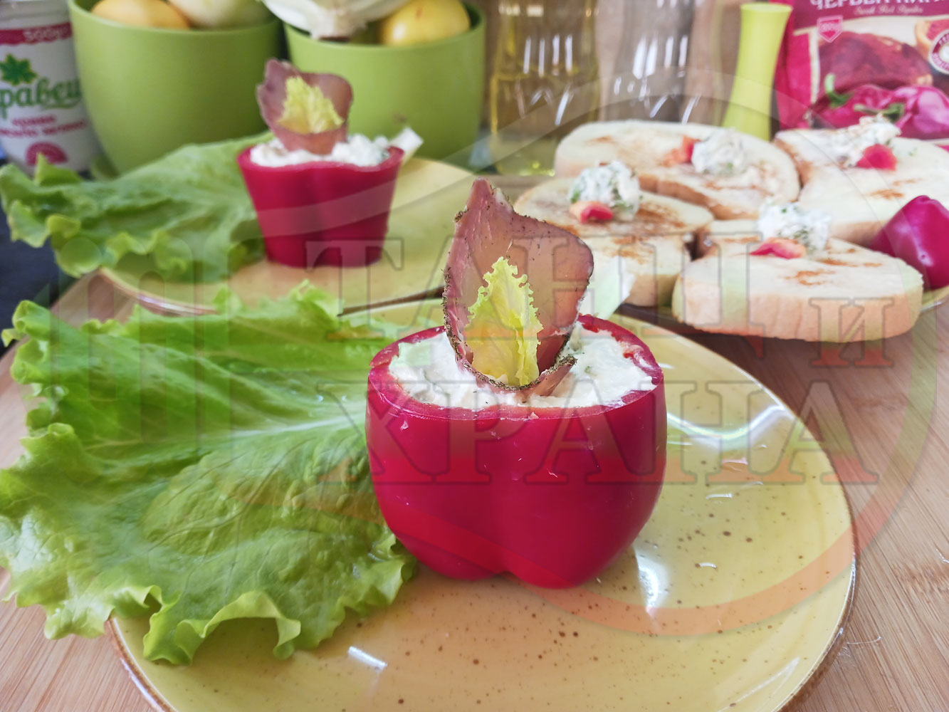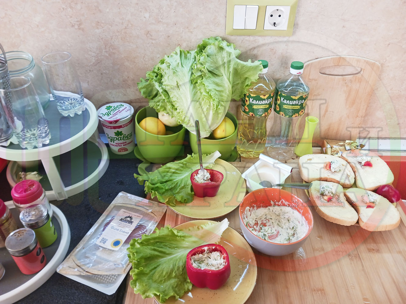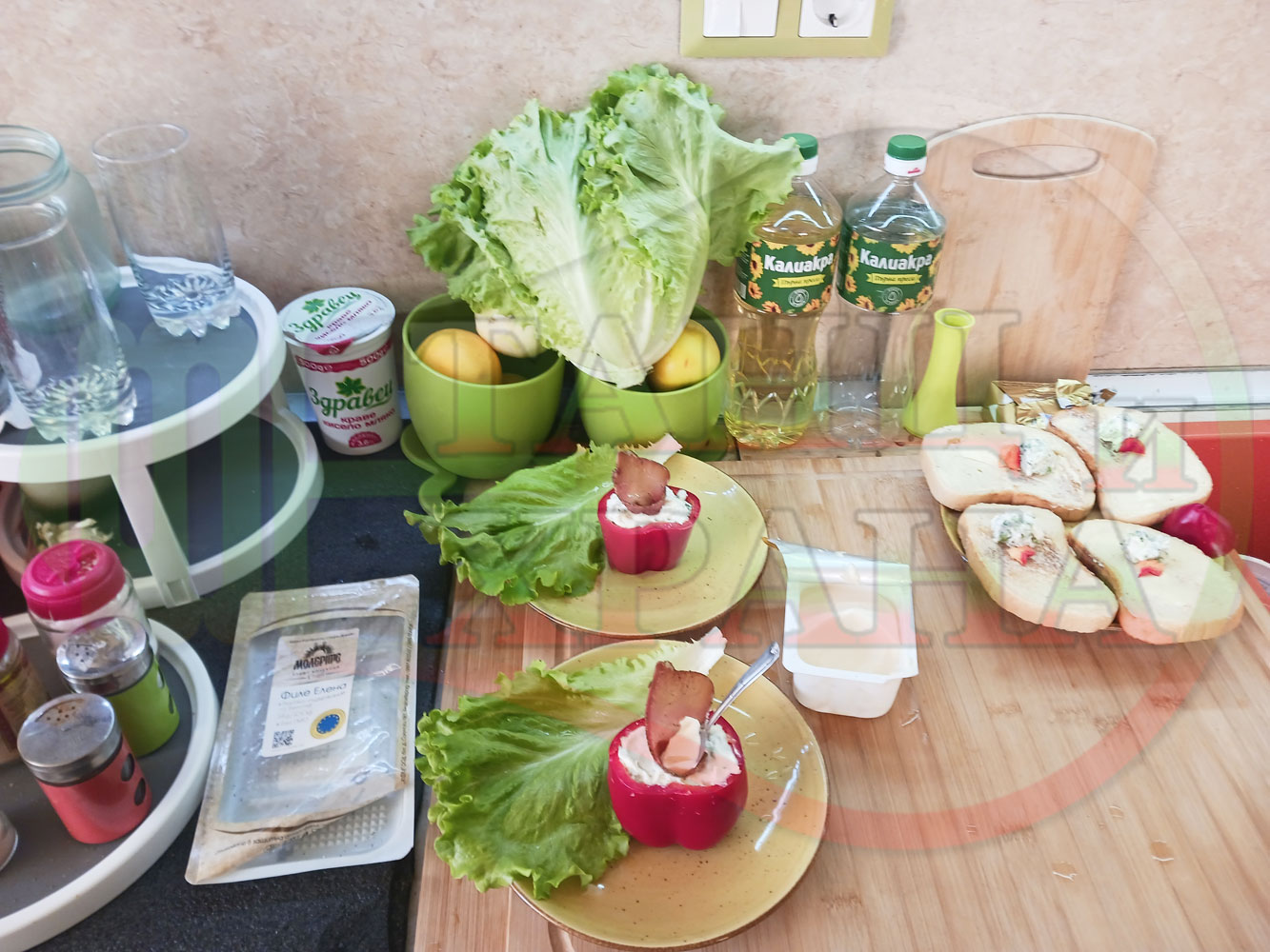 Зеленчукова салата със сурови пълнени чушки"Маруленочервеночушкова майонезена с БГсирене" приготвена от червени пресни пиперки напълнени със сиренов крем с маруля, чесън, майонеза и краве бяло сирене гарнирани с филе "Елена" - двукомпонентна