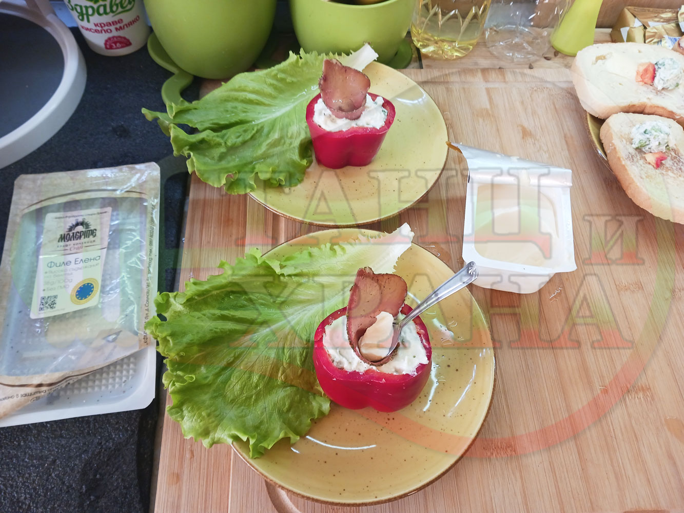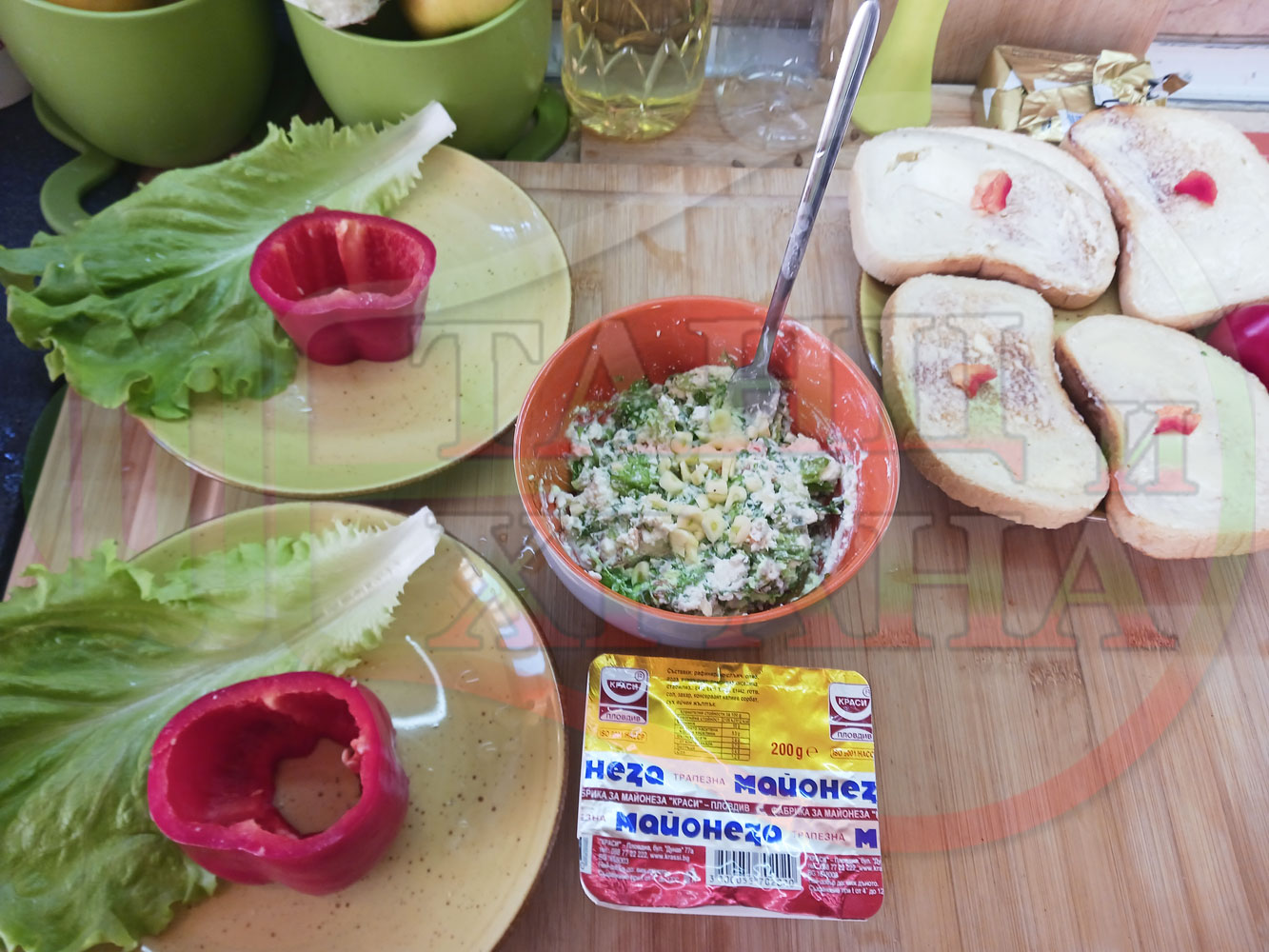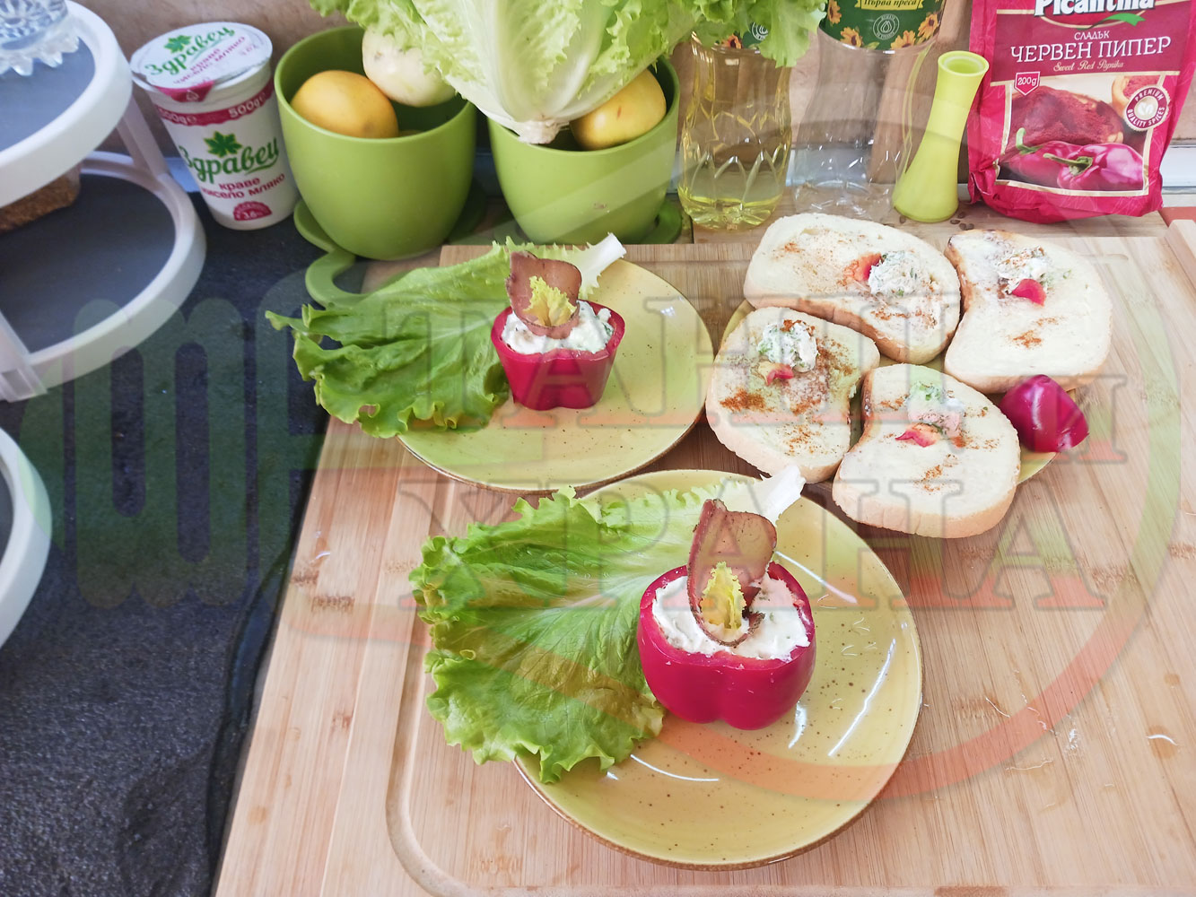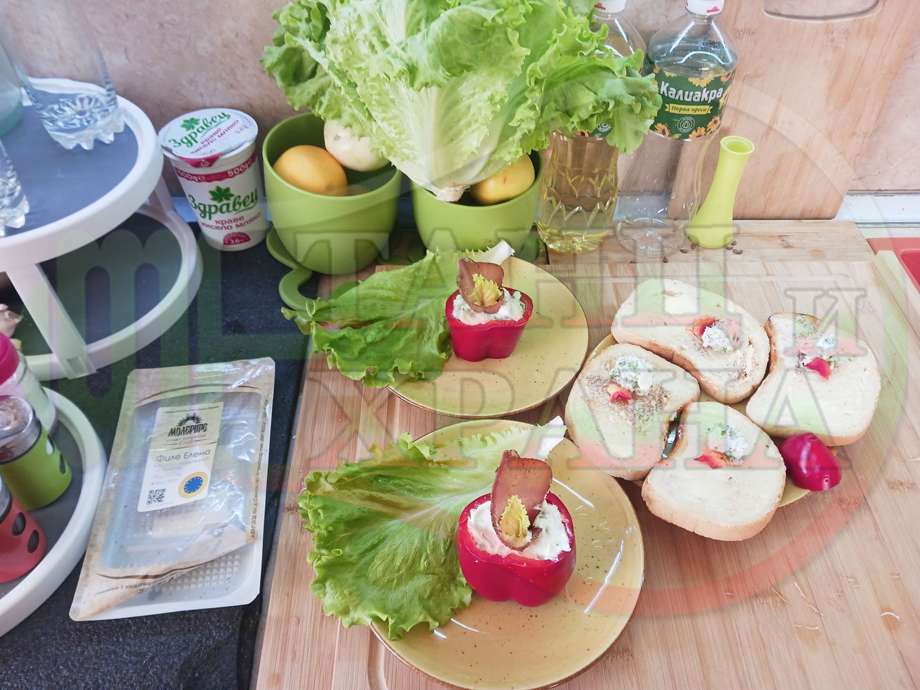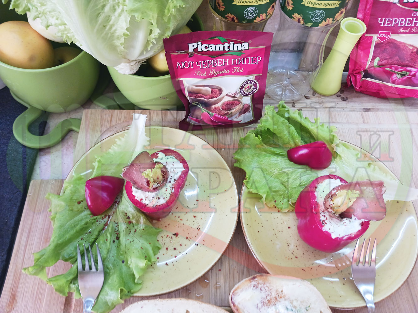 Спретнах за пореден път невероятна вкусно, вкусна, вкусотия (вкуснотия), приготвена от сурови, червени, пресни чушки, напълнени със сиреново марулен майонезен крем от свежа маруля, българско краве бяло, саламурено сирене, стар чесън и майонеза. Гарнирах чушките с любимото ни филе "Елена" навито на фунийки, напълнено с чаена лъжичка от майонезата и украсено с малки, свежи и крехки майонезени листенца.