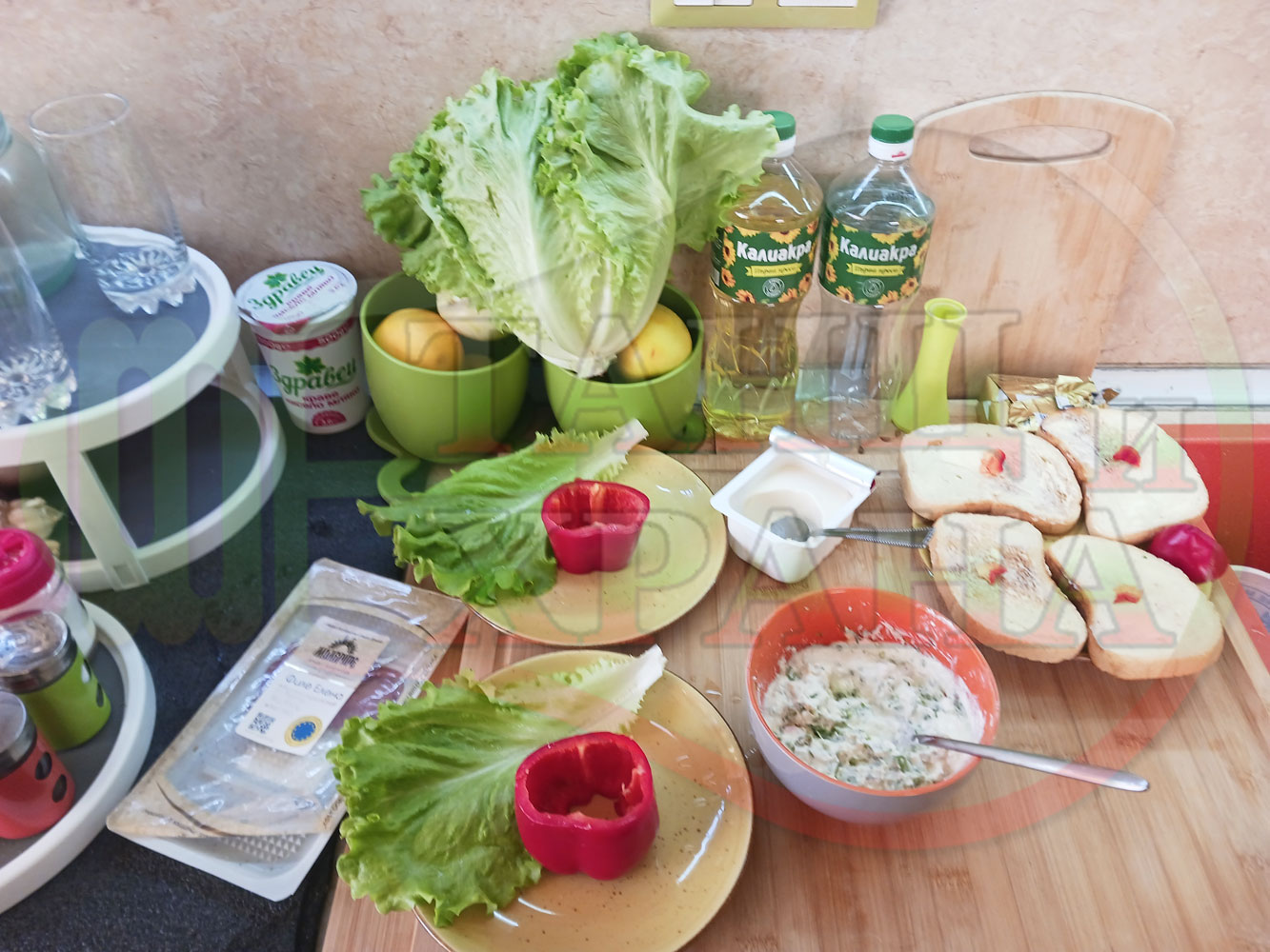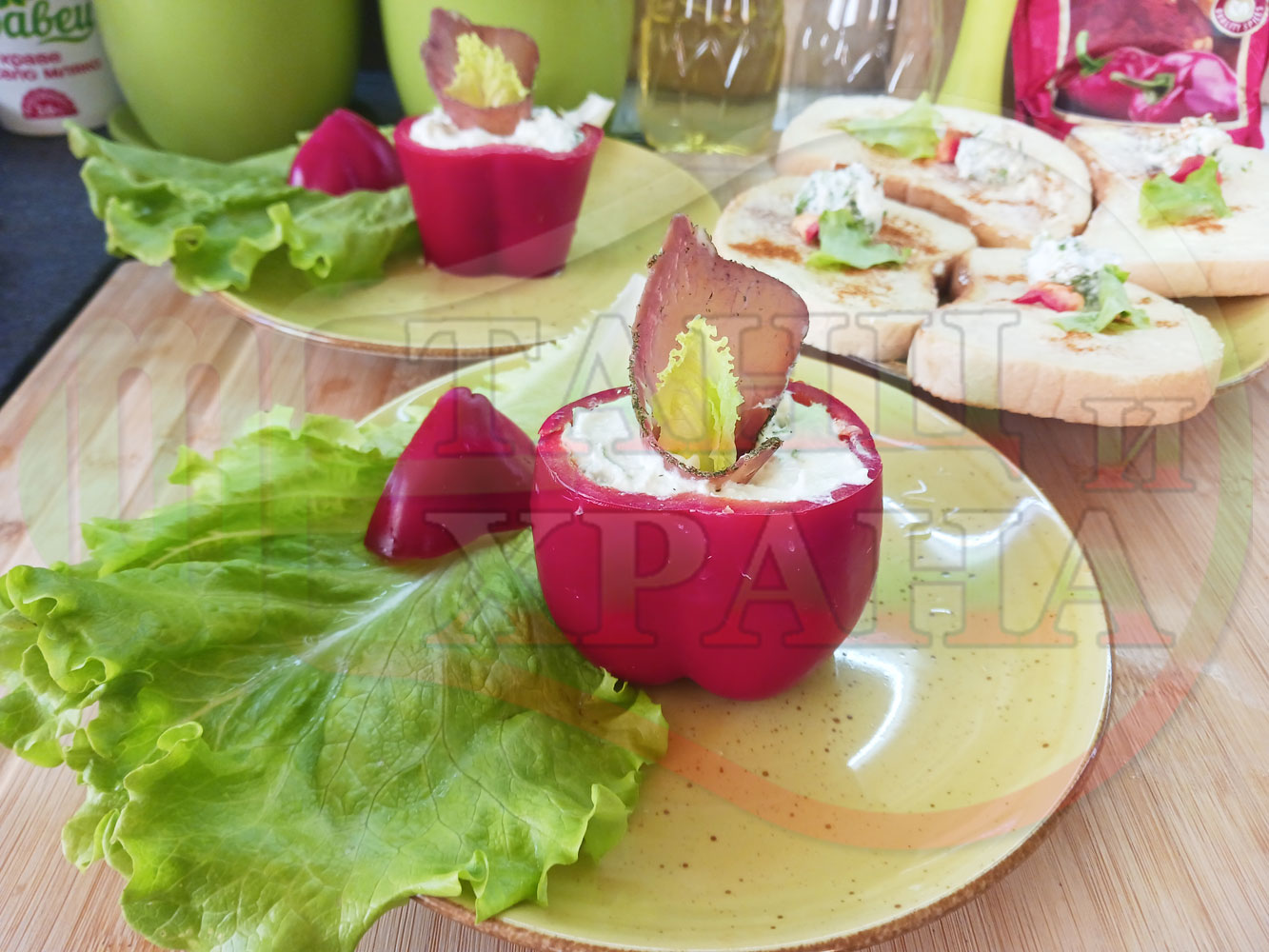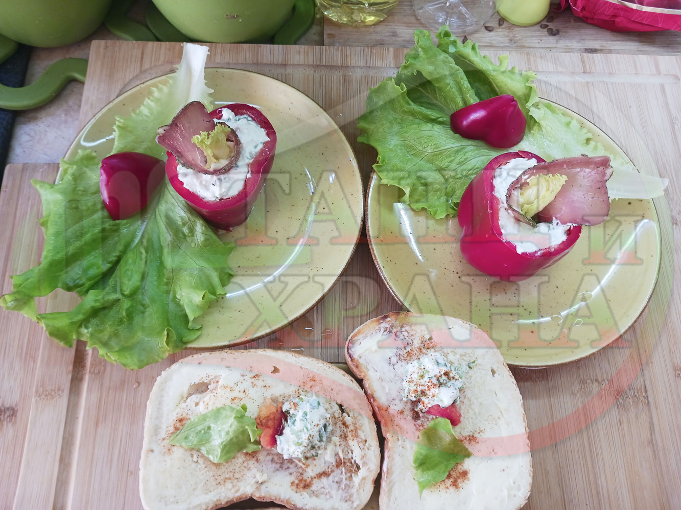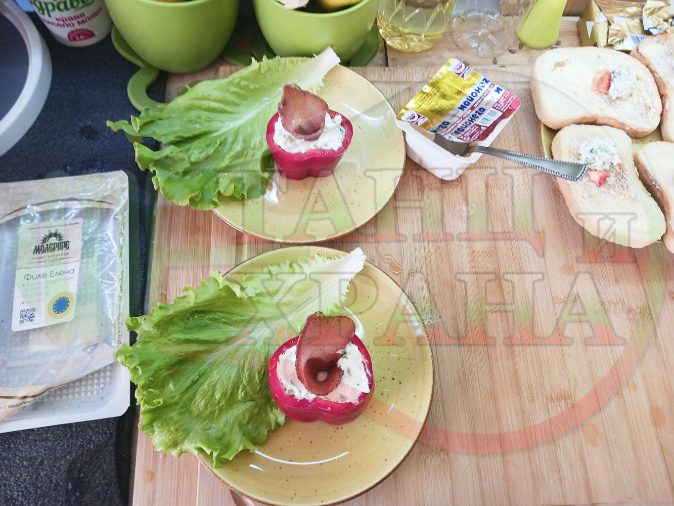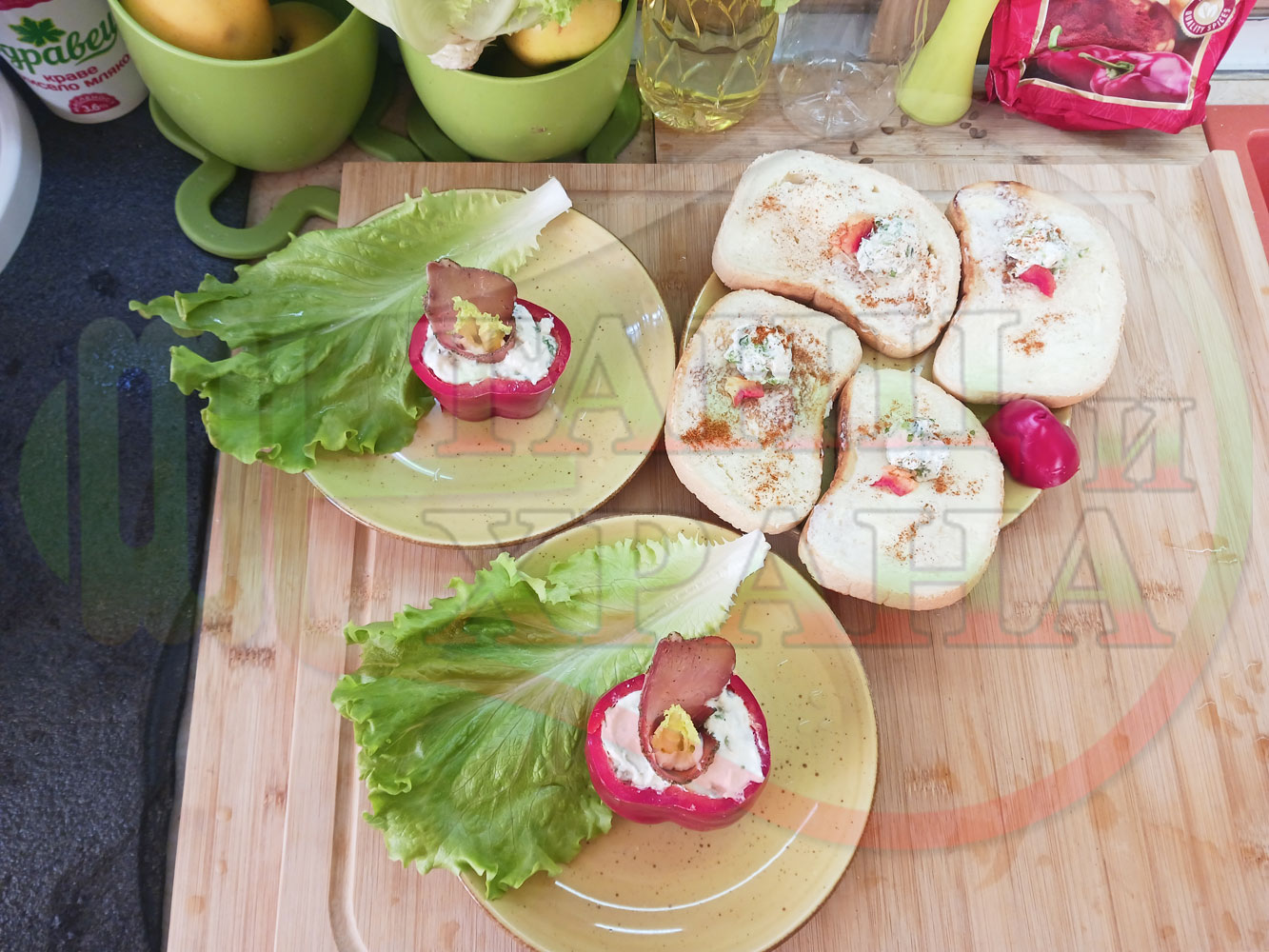 Спретнах за пореден път невероятна вкусно, вкусна, вкусотия (вкуснотия), приготвена от сурови, червени, пресни чушки, напълнени със сиреново марулен майонезен крем от свежа маруля, българско краве бяло, саламурено сирене, стар чесън и майонеза. Гарнирах чушките с любимото ни филе "Елена" навито на фунийки, напълнено с чаена лъжичка от майонезата и украсено с малки, свежи и крехки майонезени листенца.