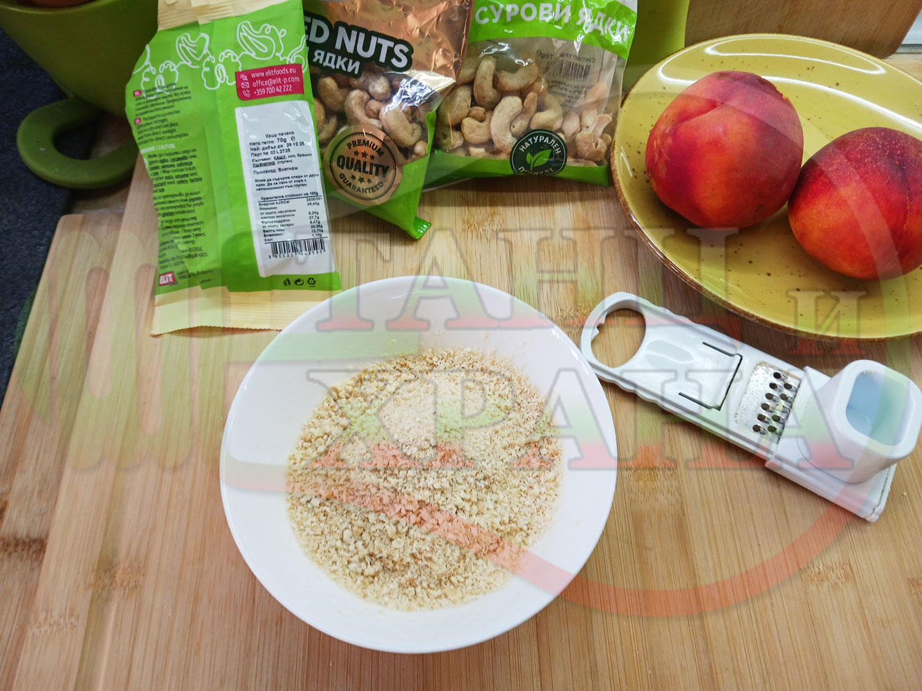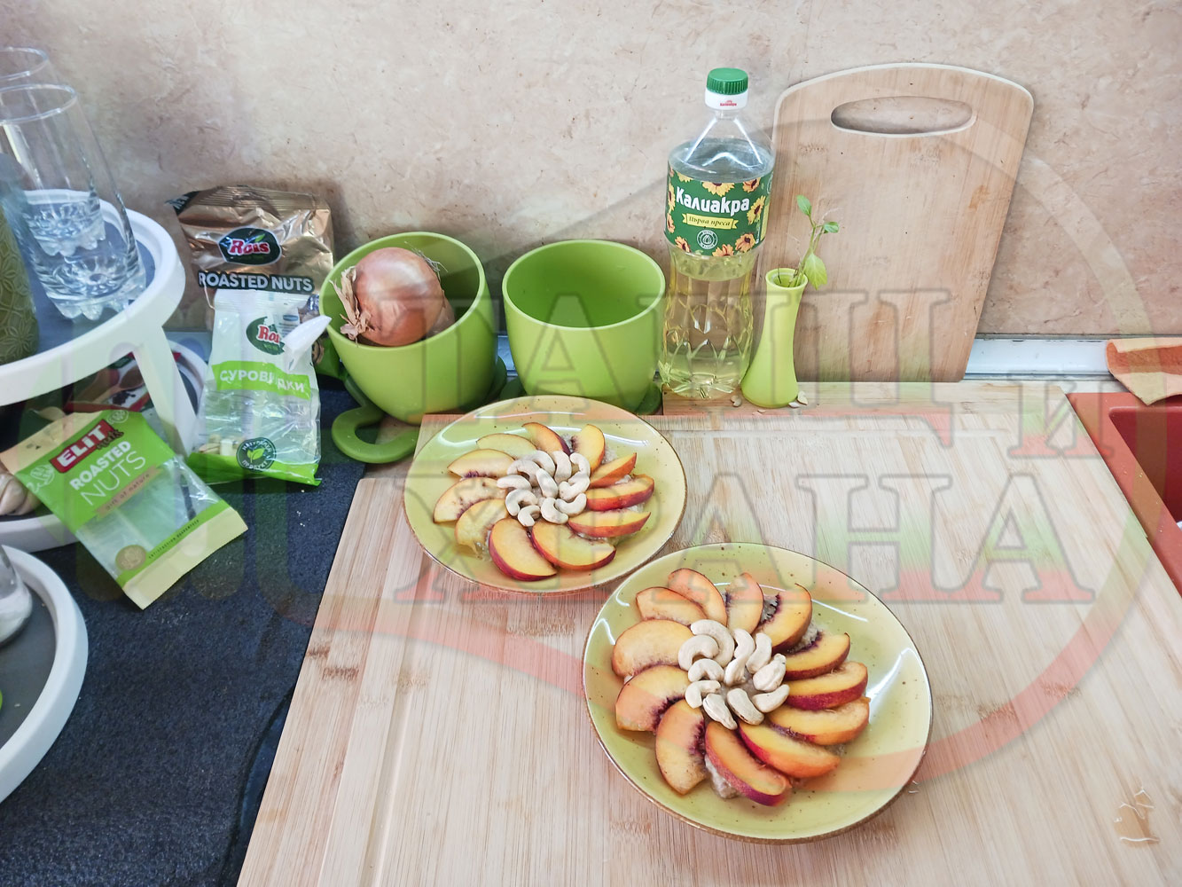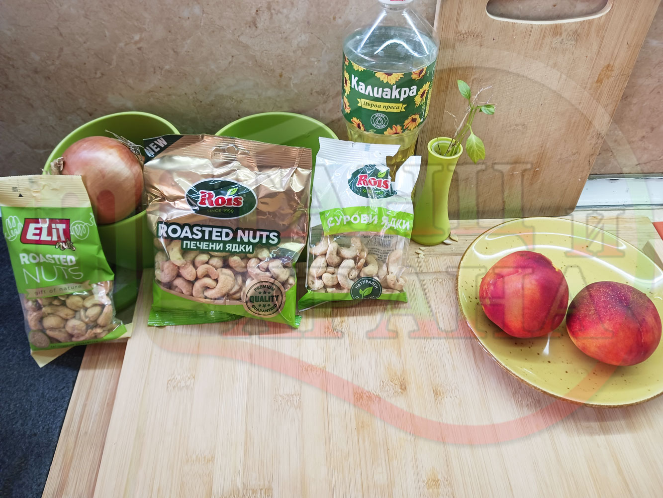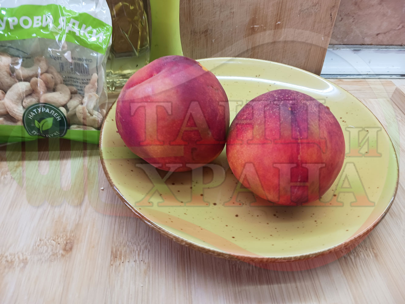 ПРОДУКТИ: Приблизителни количества за плодова сурова салата "Прасковена кашуядкова" приготвена от плодово ядков крем с пресни праскови и настъргано печено и осолено кашу оформен като кладенчета гарнирани с резени от праскова и сурови ядки