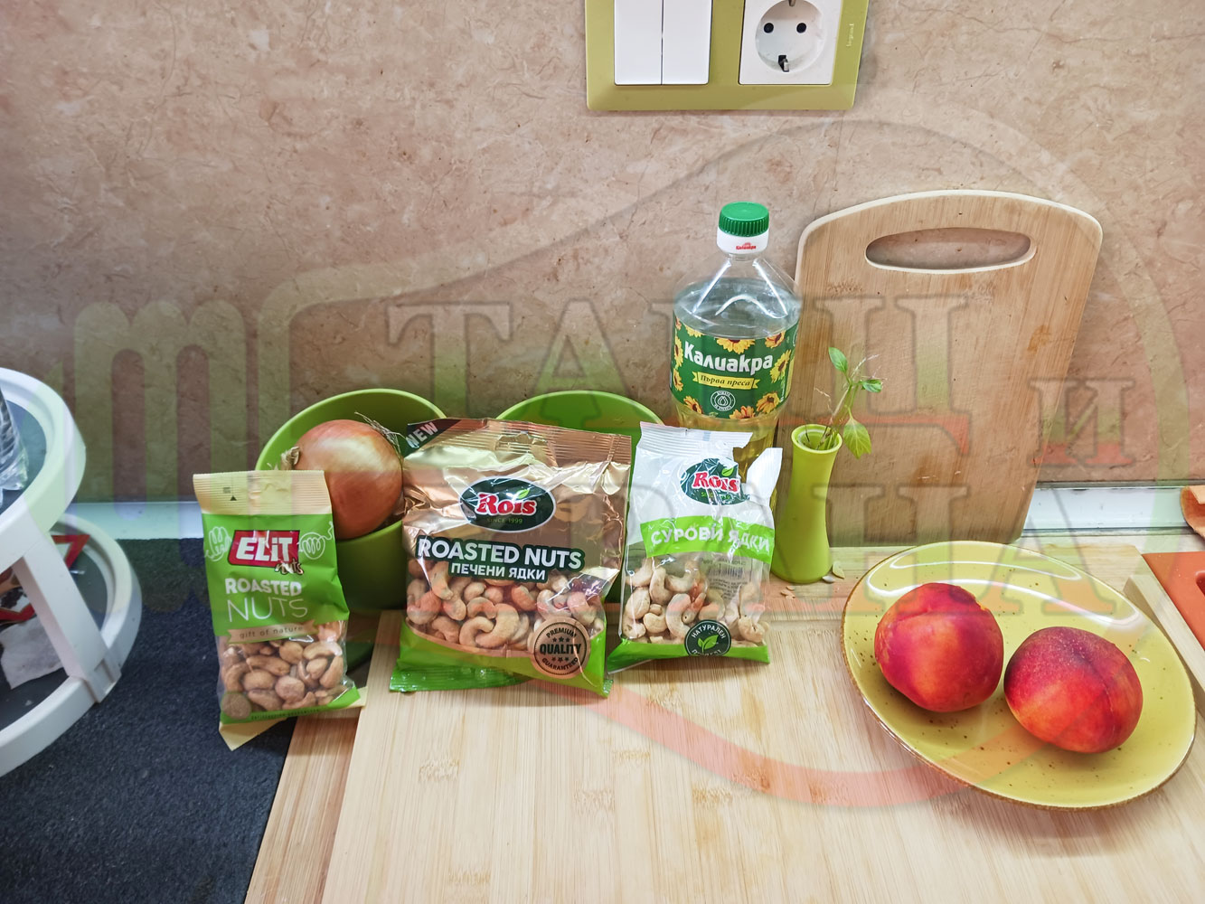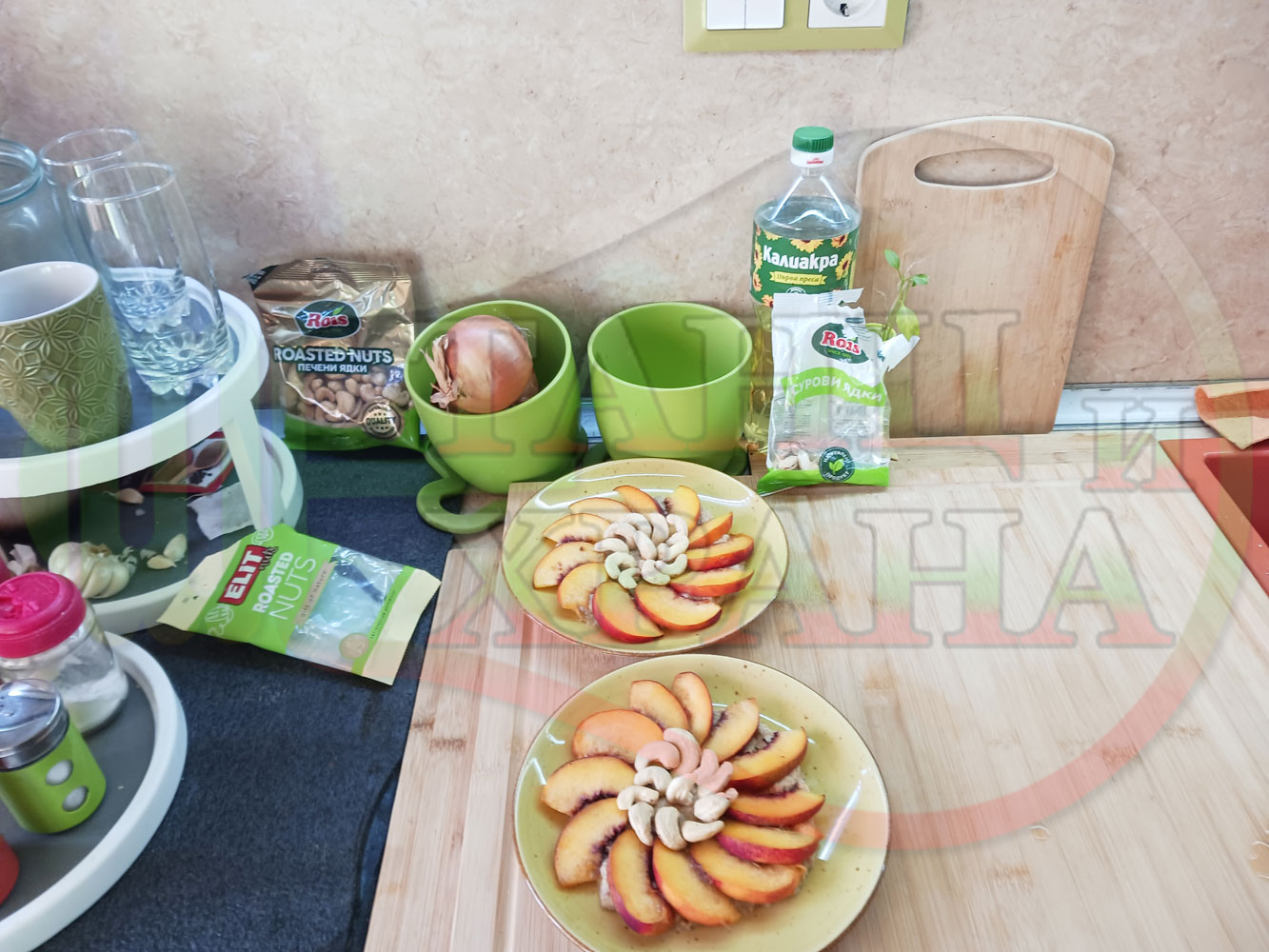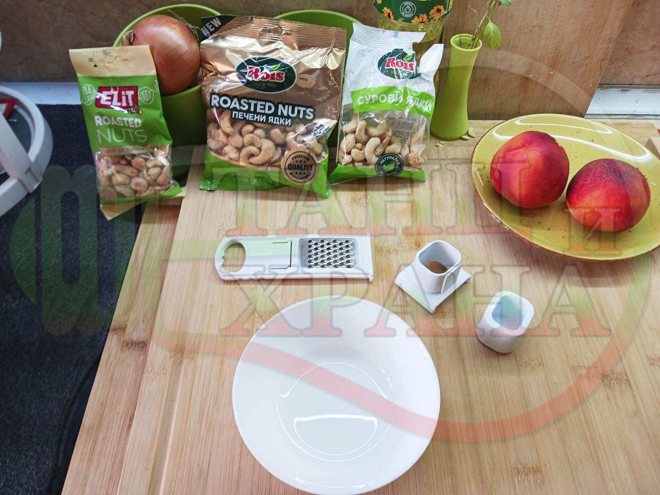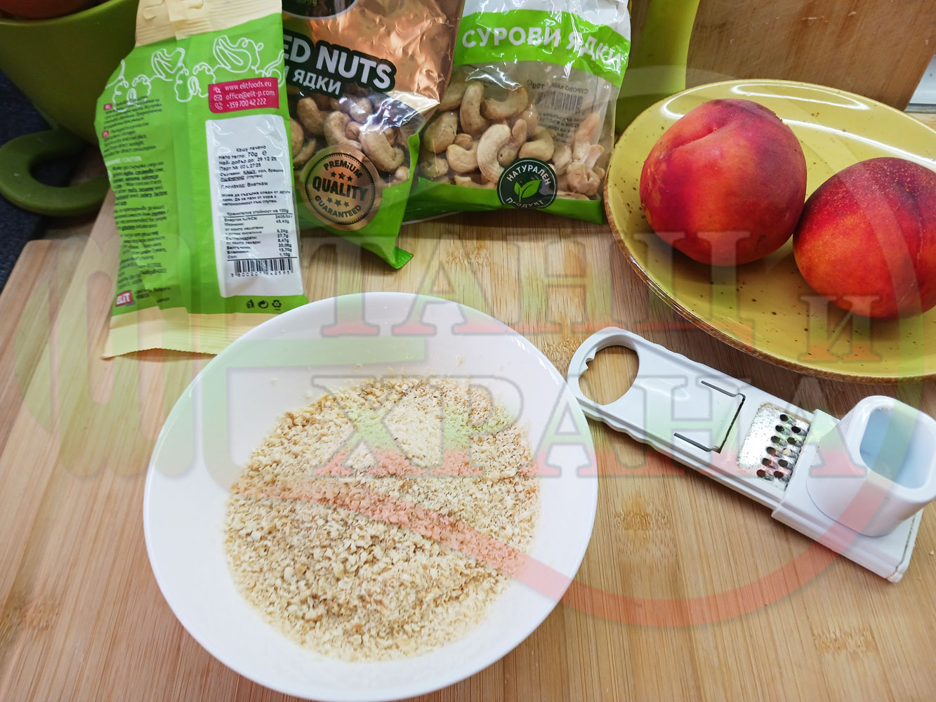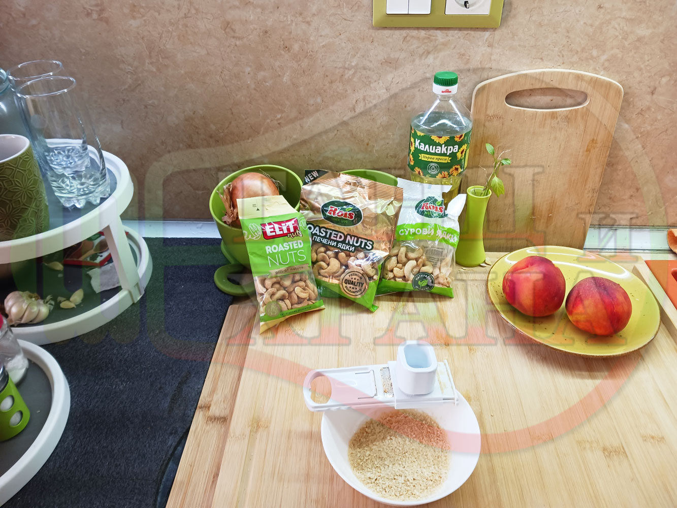 ПРОДУКТИ: Приблизителни количества за плодова сурова салата "Прасковена кашуядкова" приготвена от плодово ядков крем с пресни праскови и настъргано печено и осолено кашу оформен като кладенчета гарнирани с резени от праскова и сурови ядки