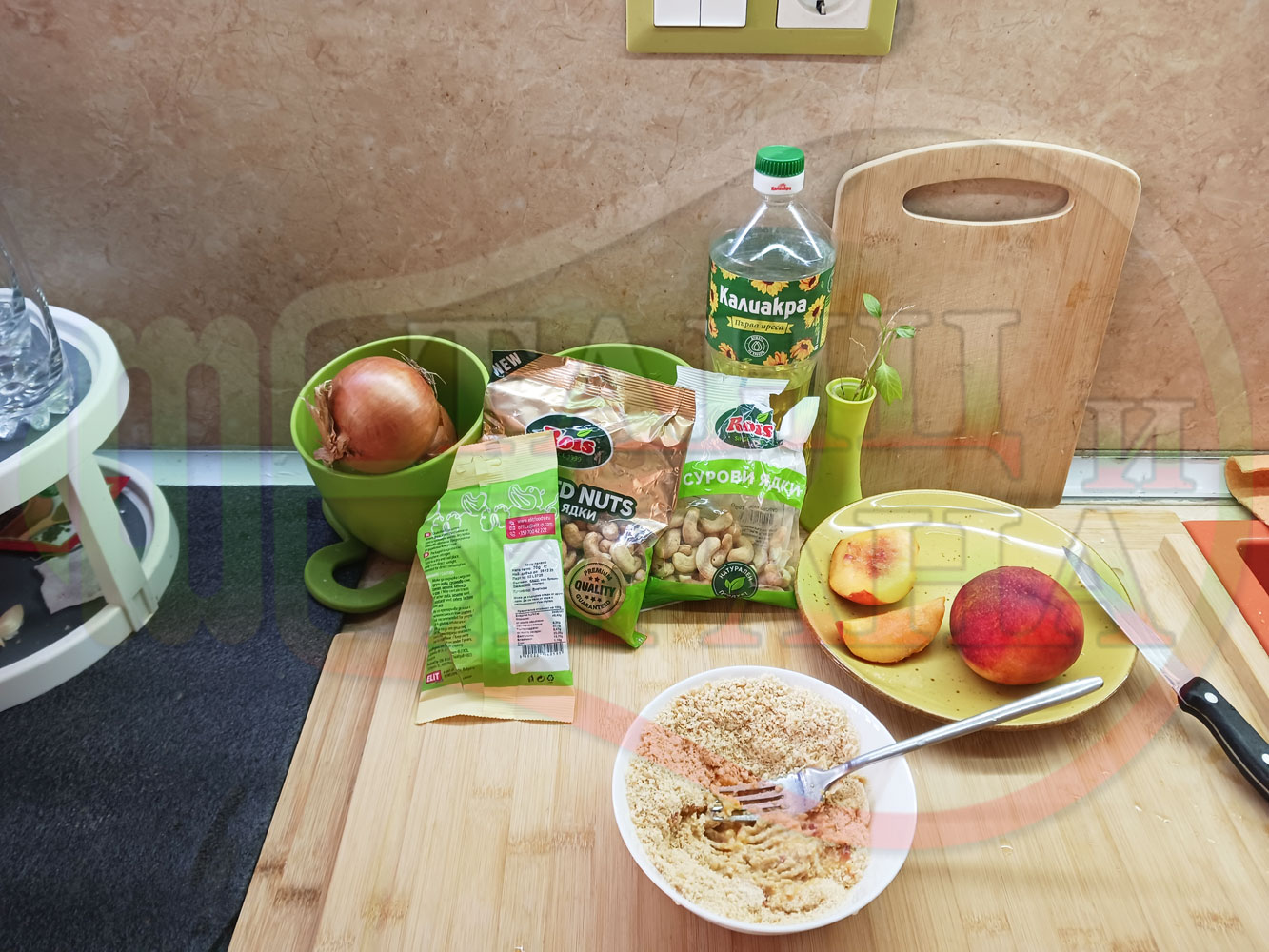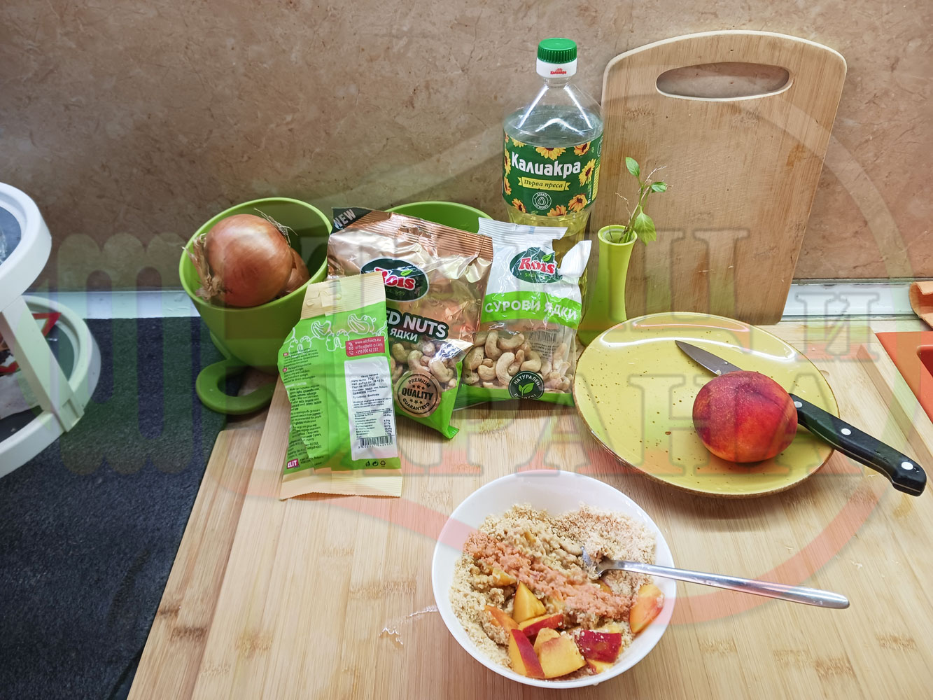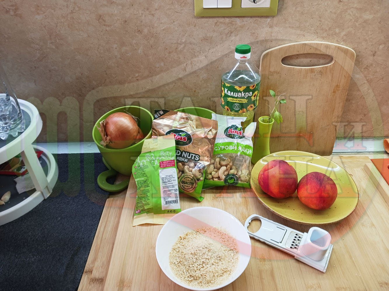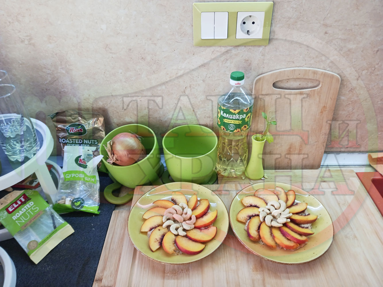 ПРОДУКТИ: Приблизителни количества за плодова сурова салата "Прасковена кашуядкова" приготвена от плодово ядков крем с пресни праскови и настъргано печено и осолено кашу оформен като кладенчета гарнирани с резени от праскова и сурови ядки