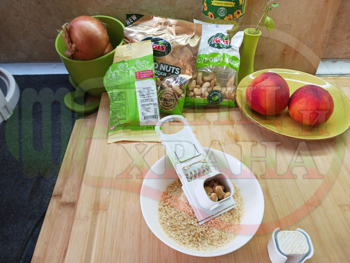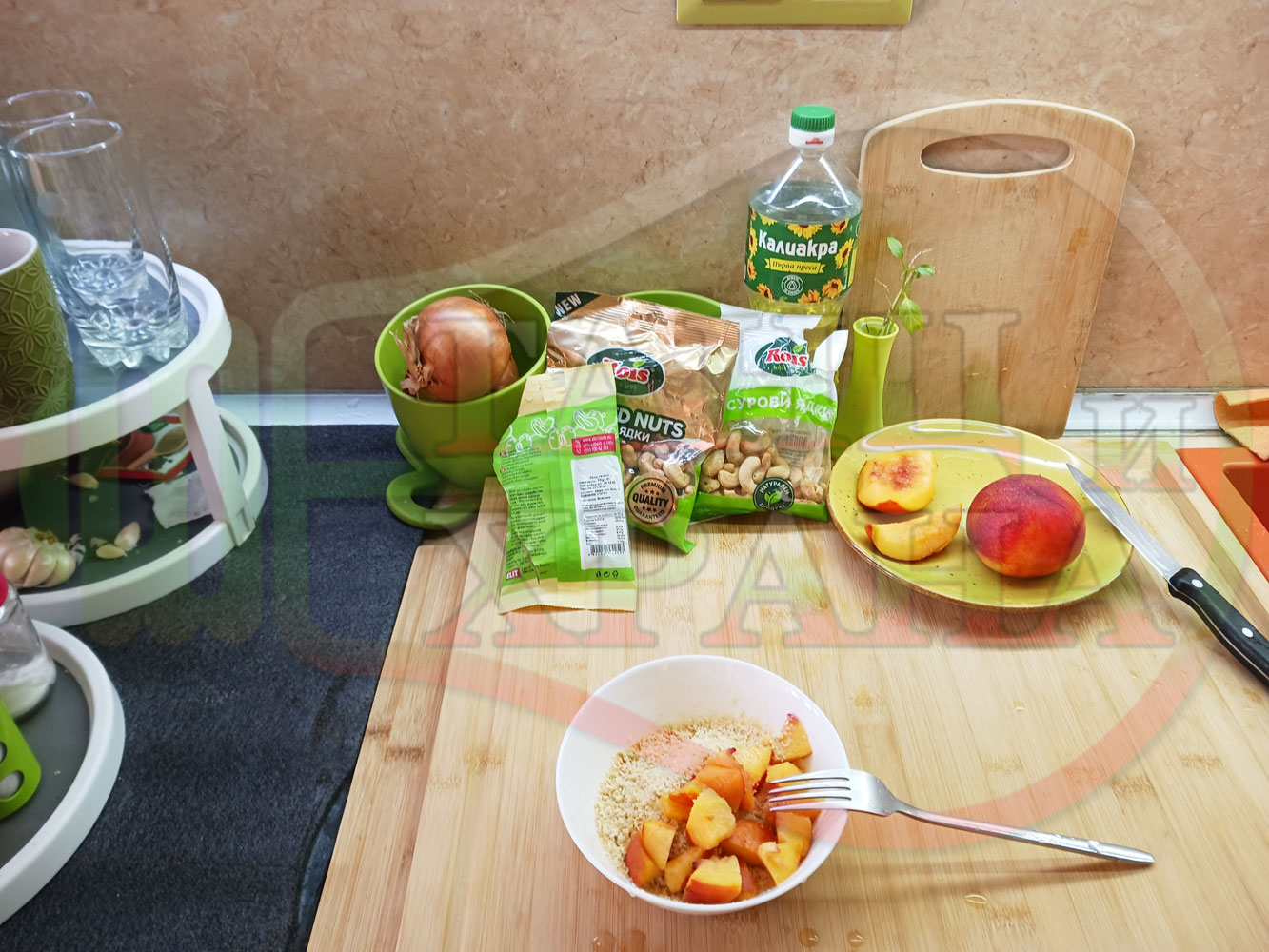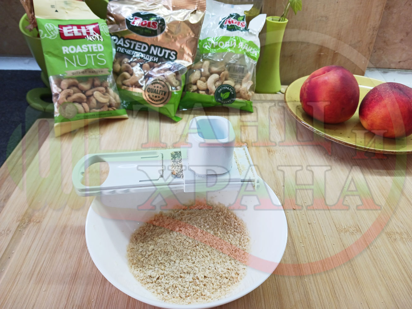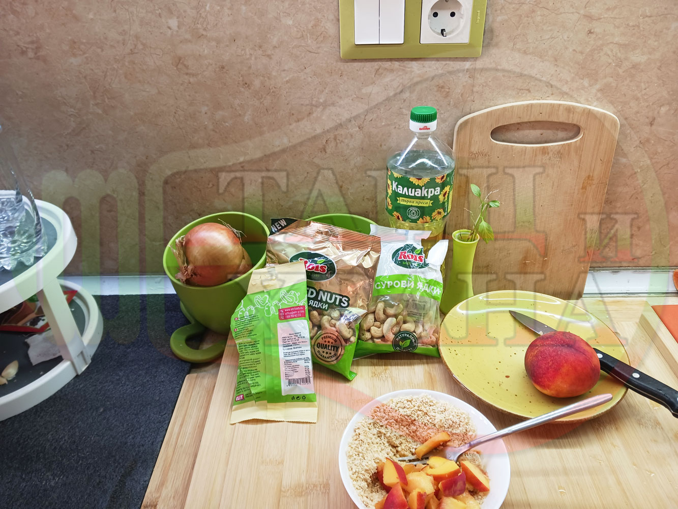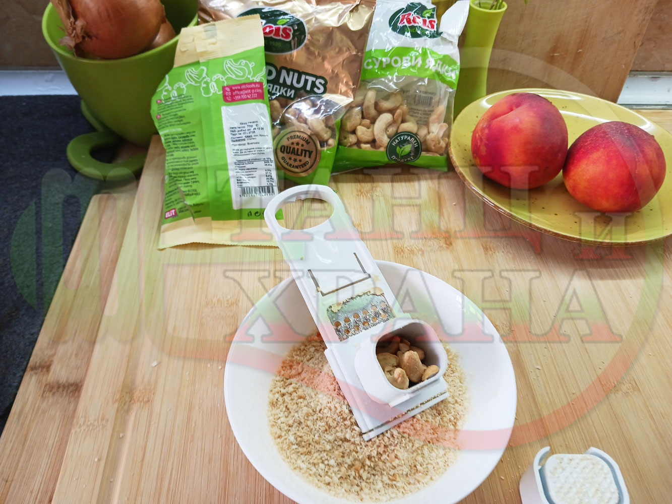 ПРОДУКТИ: Приблизителни количества за плодова сурова салата "Прасковена кашуядкова" приготвена от плодово ядков крем с пресни праскови и настъргано печено и осолено кашу оформен като кладенчета гарнирани с резени от праскова и сурови ядки