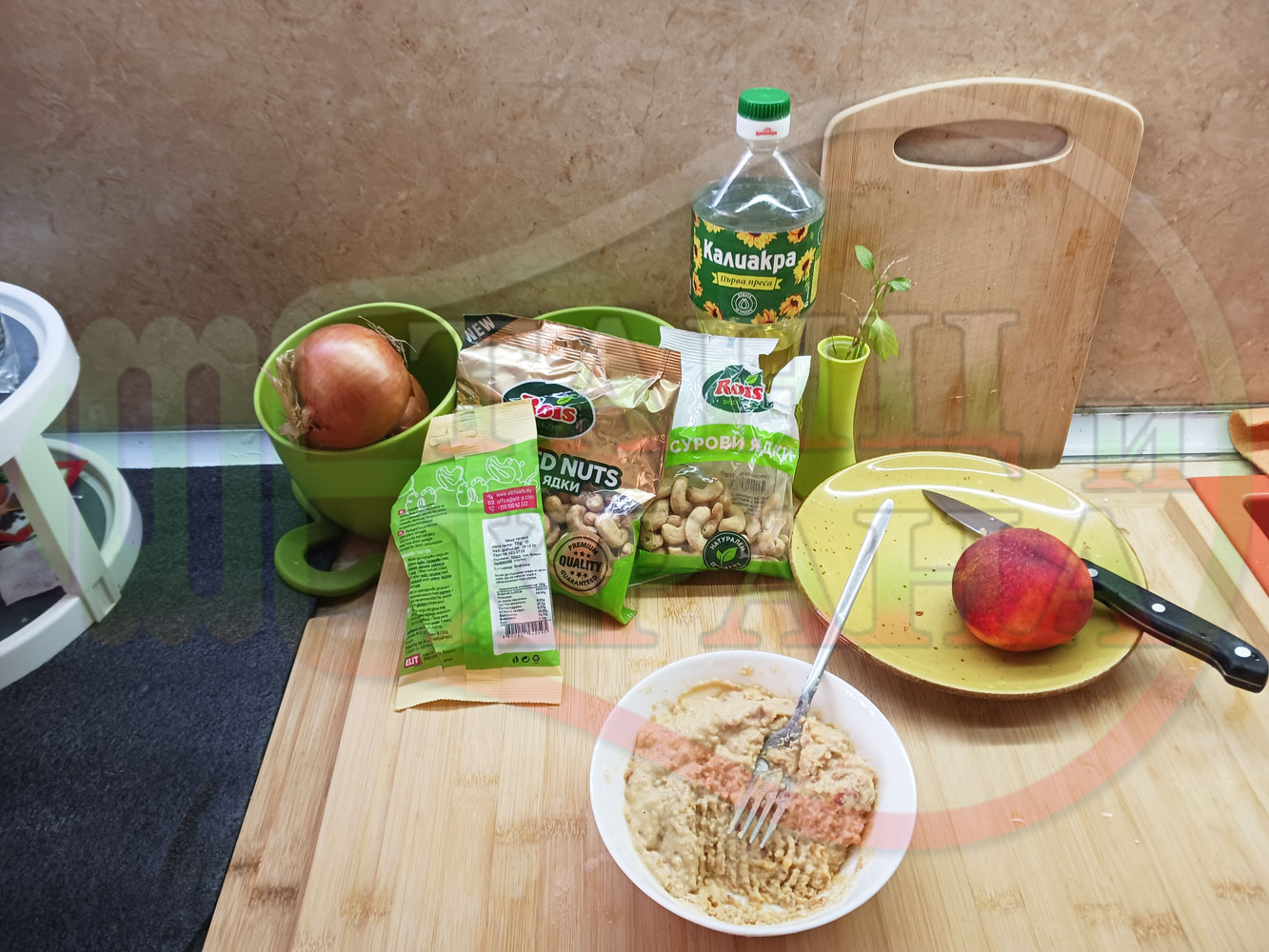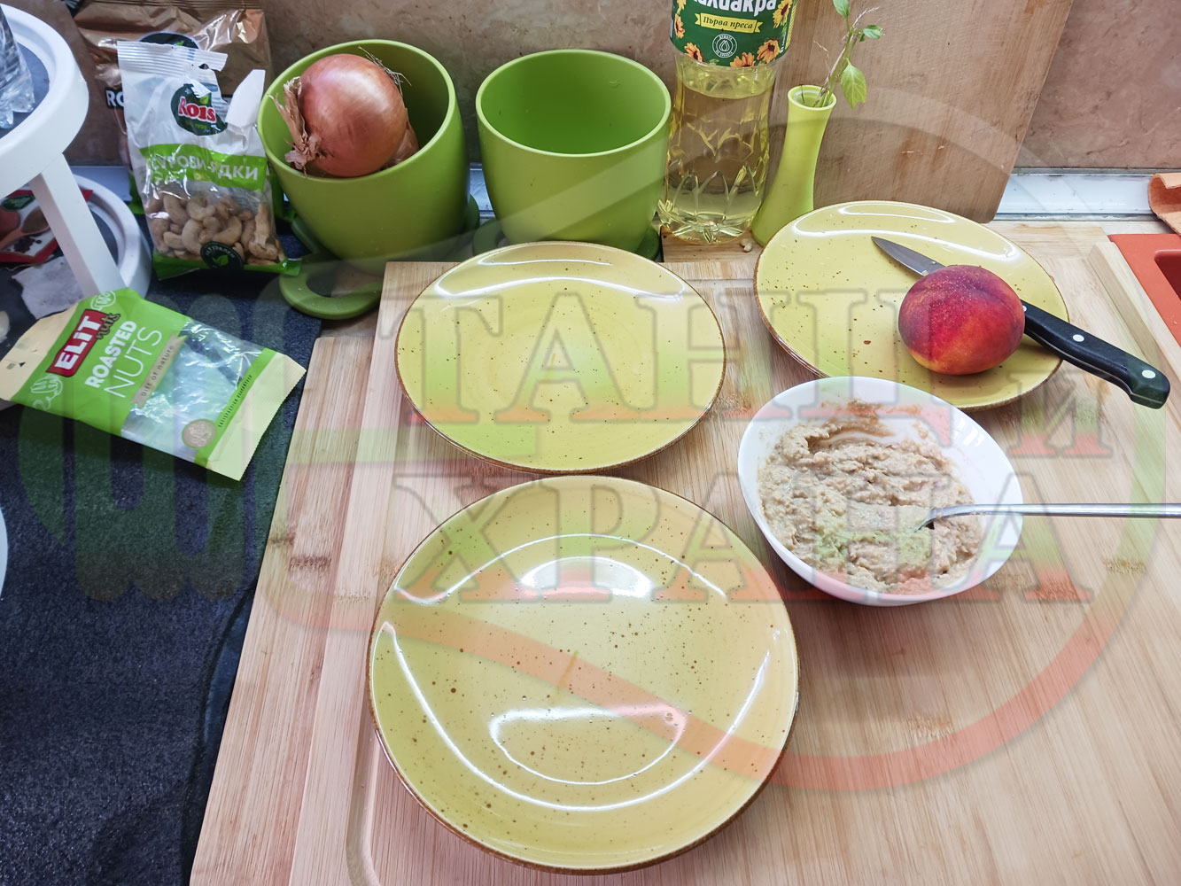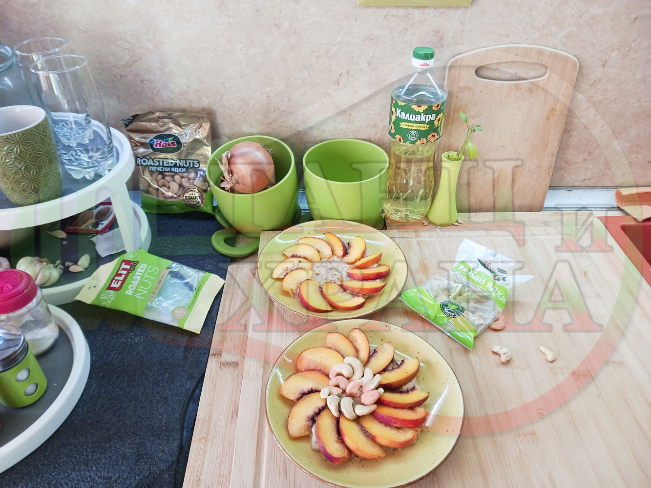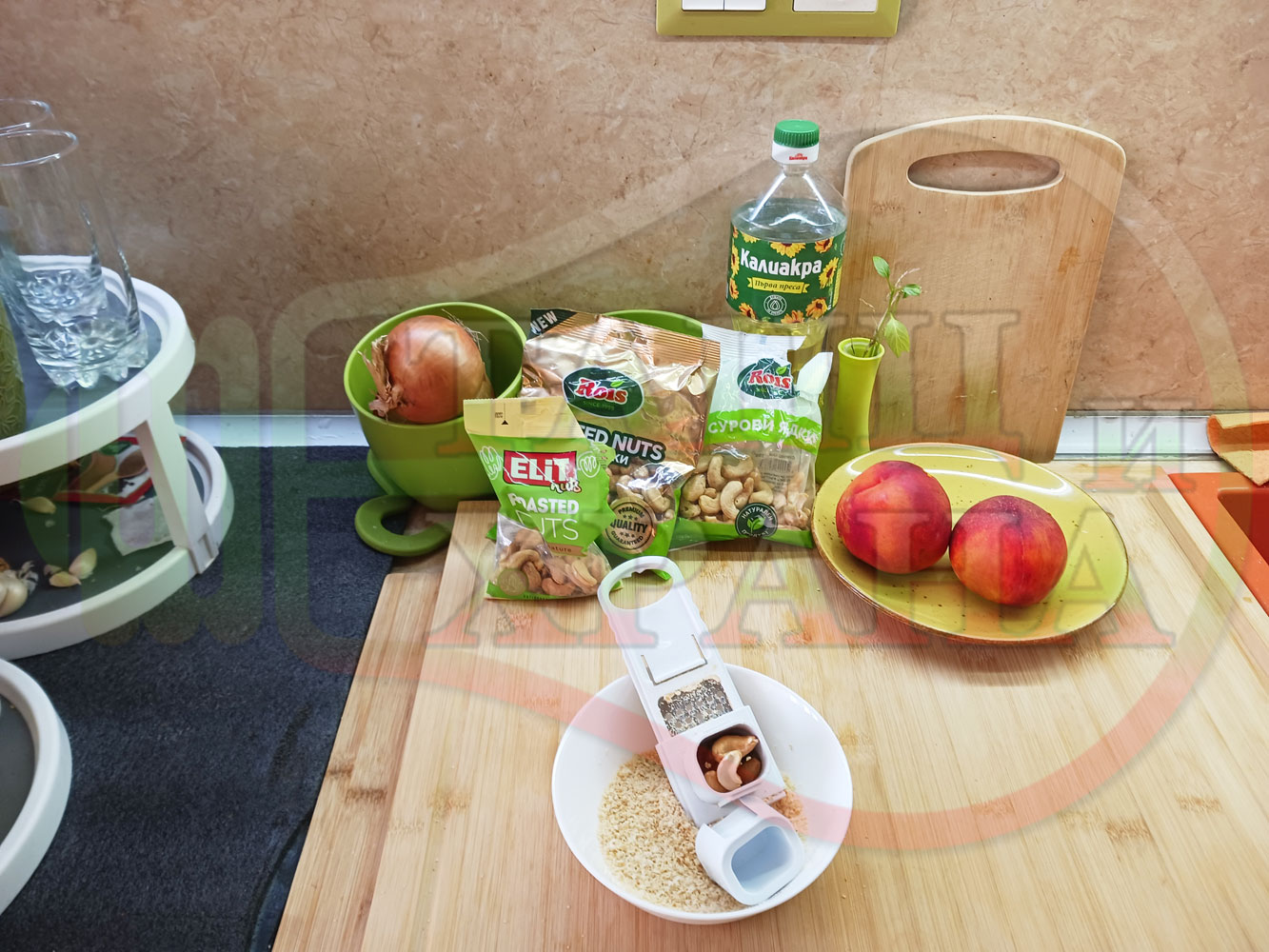 ПРОДУКТИ: Приблизителни количества за плодова сурова салата "Прасковена кашуядкова" приготвена от плодово ядков крем с пресни праскови и настъргано печено и осолено кашу оформен като кладенчета гарнирани с резени от праскова и сурови ядки