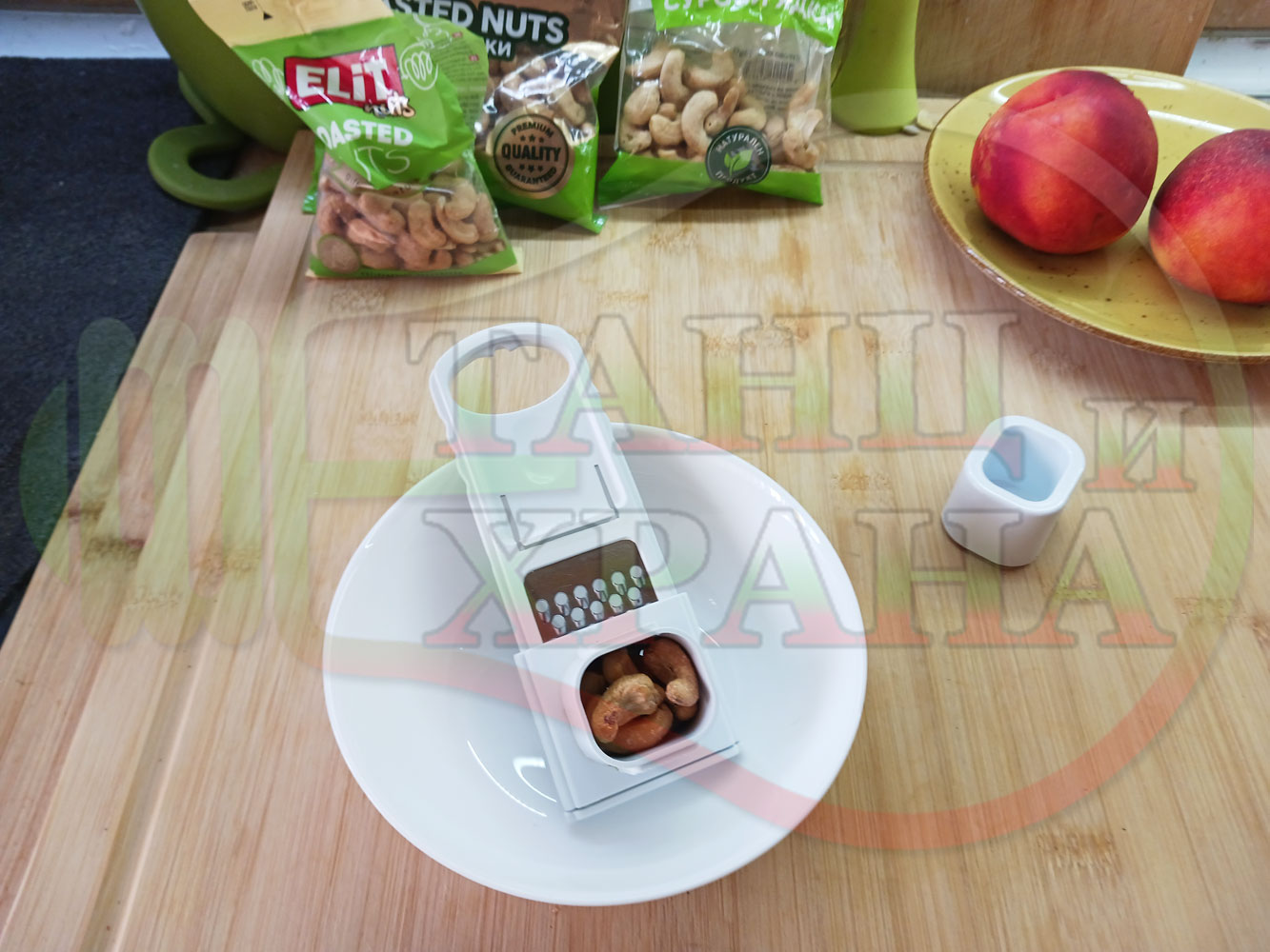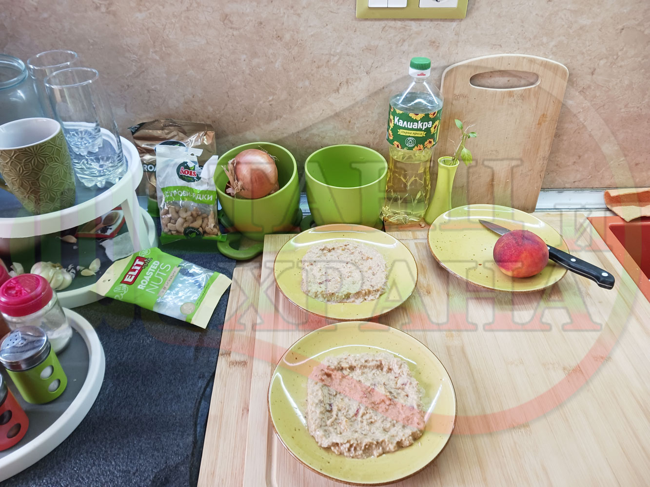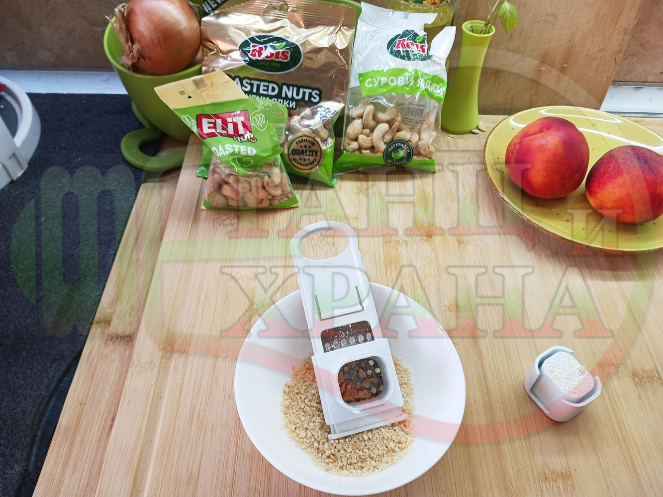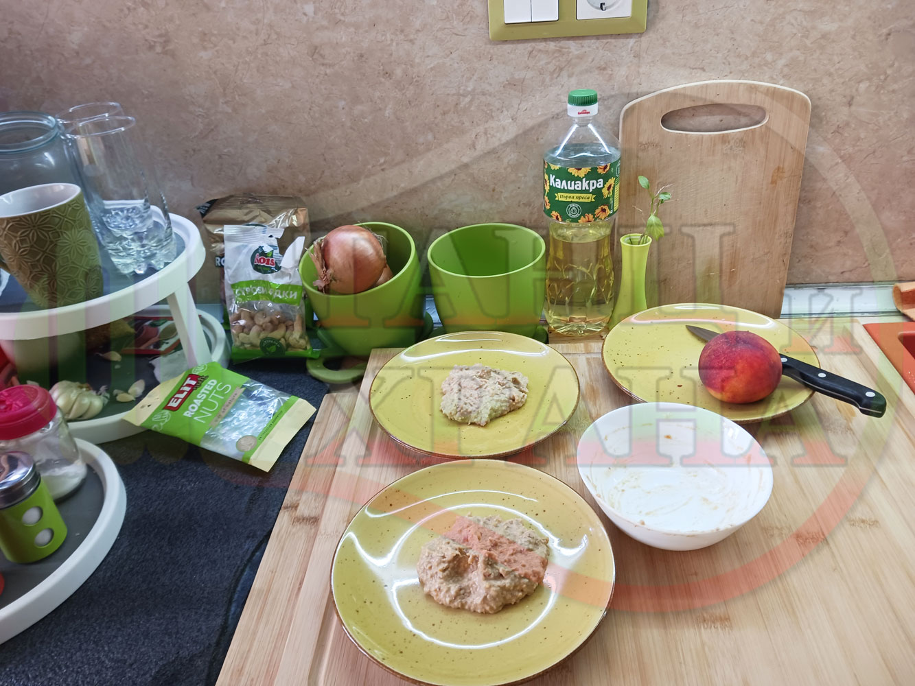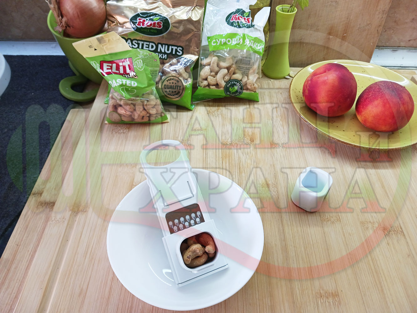ПРОДУКТИ: Приблизителни количества за плодова сурова салата "Прасковена кашуядкова" приготвена от плодово ядков крем с пресни праскови и настъргано печено и осолено кашу оформен като кладенчета гарнирани с резени от праскова и сурови ядки