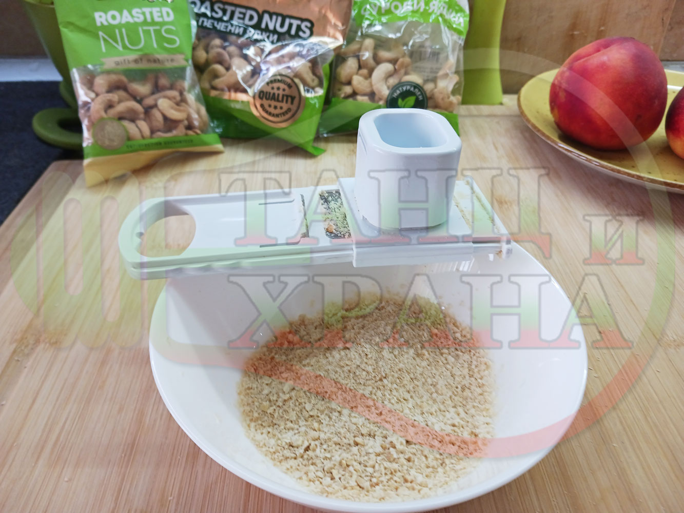 Настържете печеното и осолено кашу на малко кухненско ренде за ядки в широка и средно дълбока купа. Измийте прасковите, отстранете костилките и изрежете малка част от вътрешността около костилките (заделете едната праскова за гарниране). Нарежете 1-та праскова на малки парченца върху настърганото кашу и разбъркайте и намачкайте с вилица продуктите до получаването на средно гъст плодово ядков, хомогенизиран крем (плодов крем).