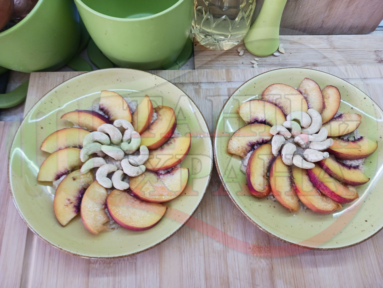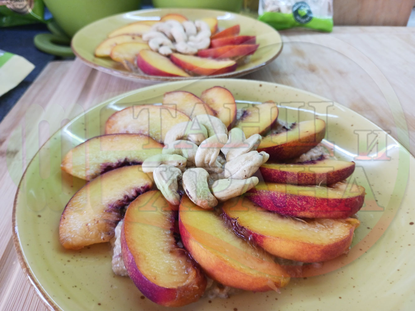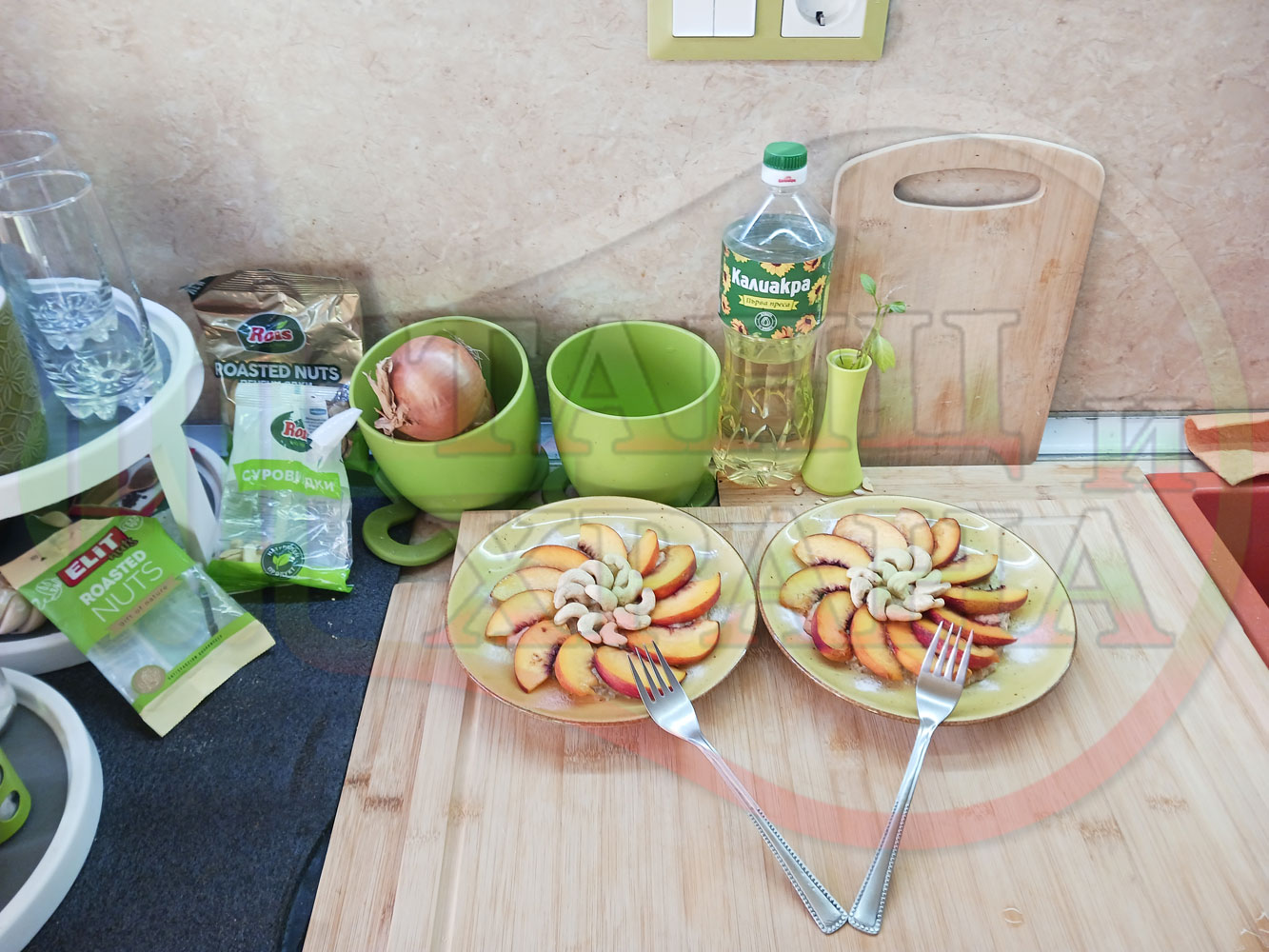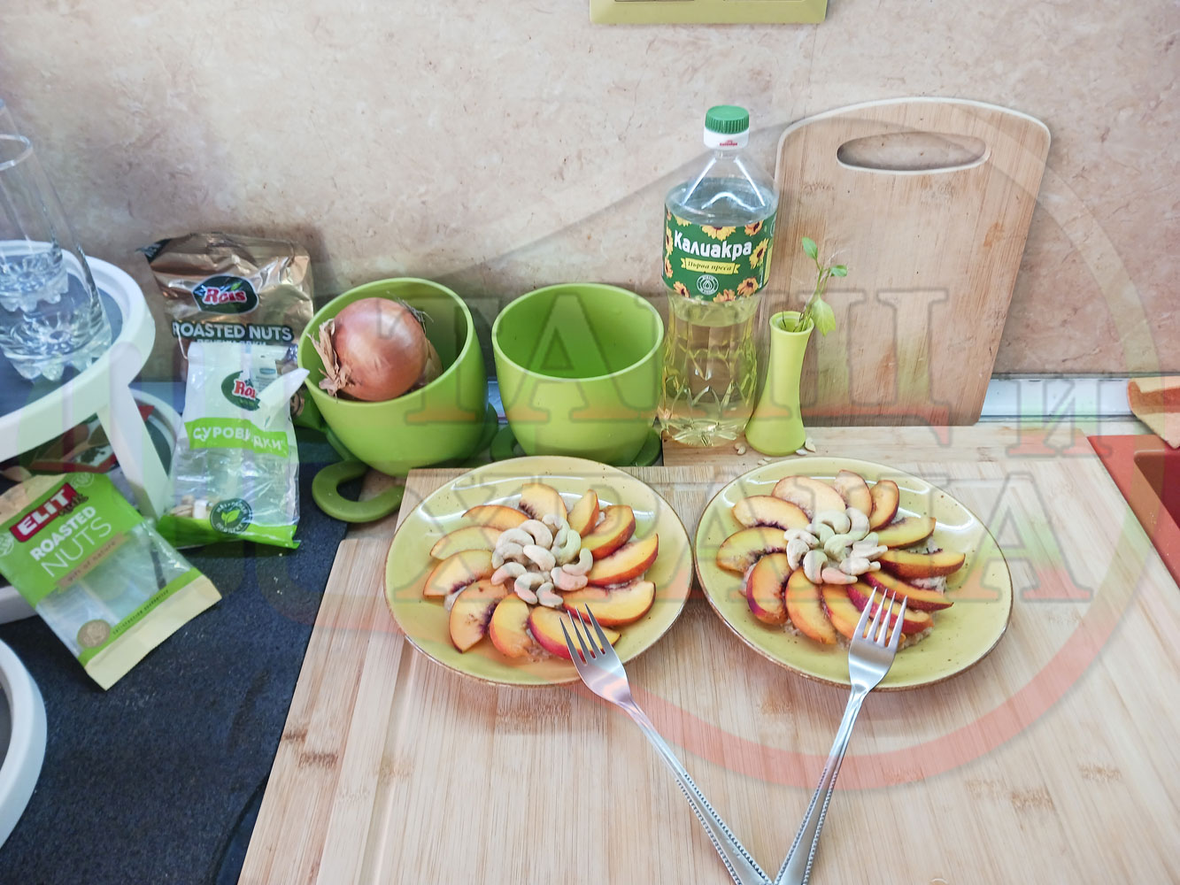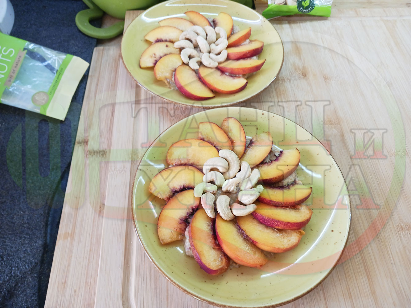 Плодова сурова салата "Прасковена кашуядкова" приготвена от плодово ядков крем с пресни праскови и настъргано печено и осолено кашу оформен като кладенчета гарнирани с резени от праскова и сурови ядки