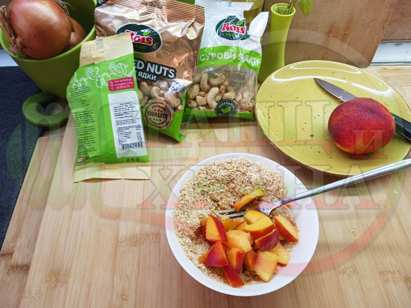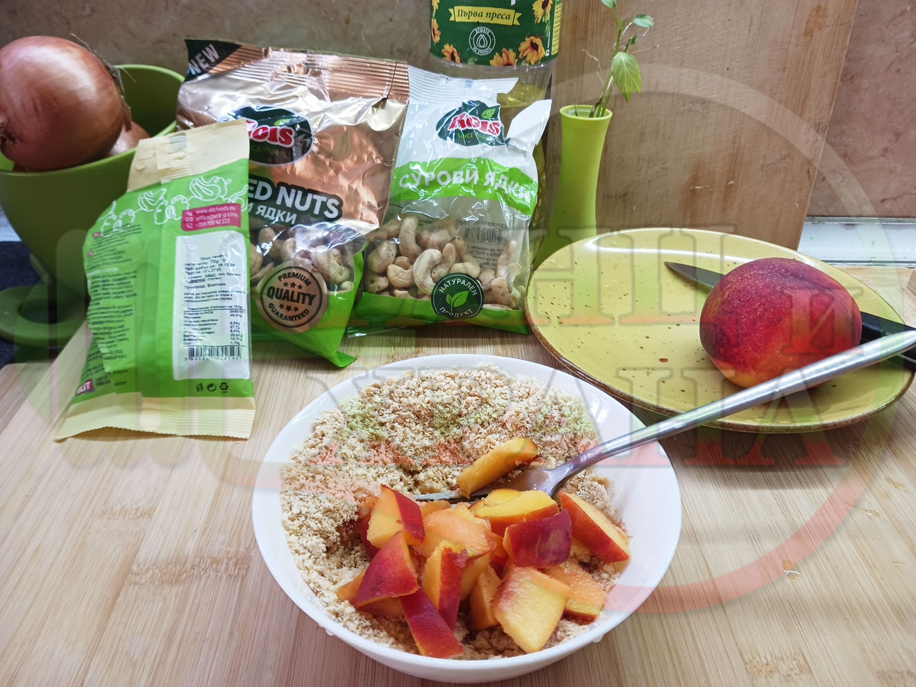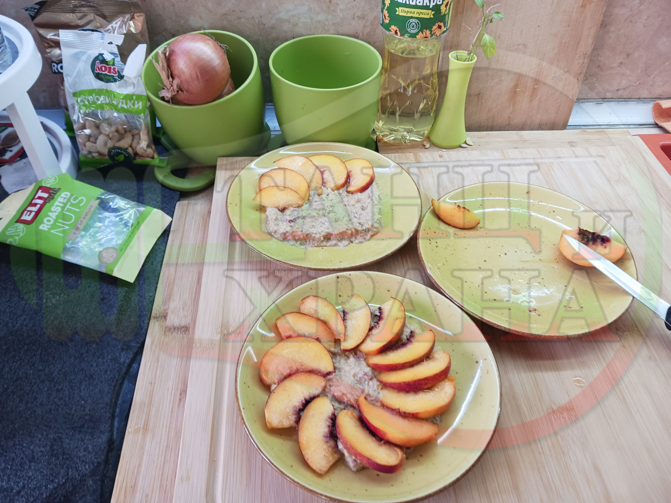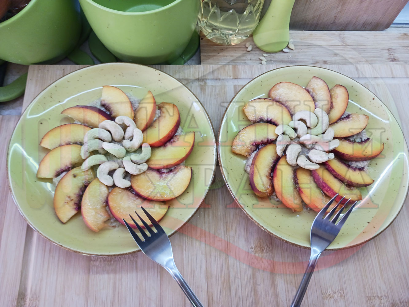 Плодова сурова салата "Прасковена кашуядкова" приготвена от плодово ядков крем с пресни праскови и настъргано печено и осолено кашу оформен като кладенчета гарнирани с резени от праскова и сурови ядки