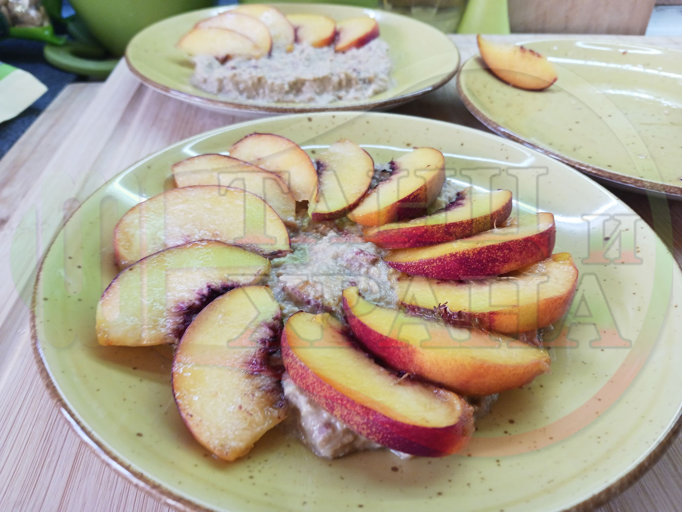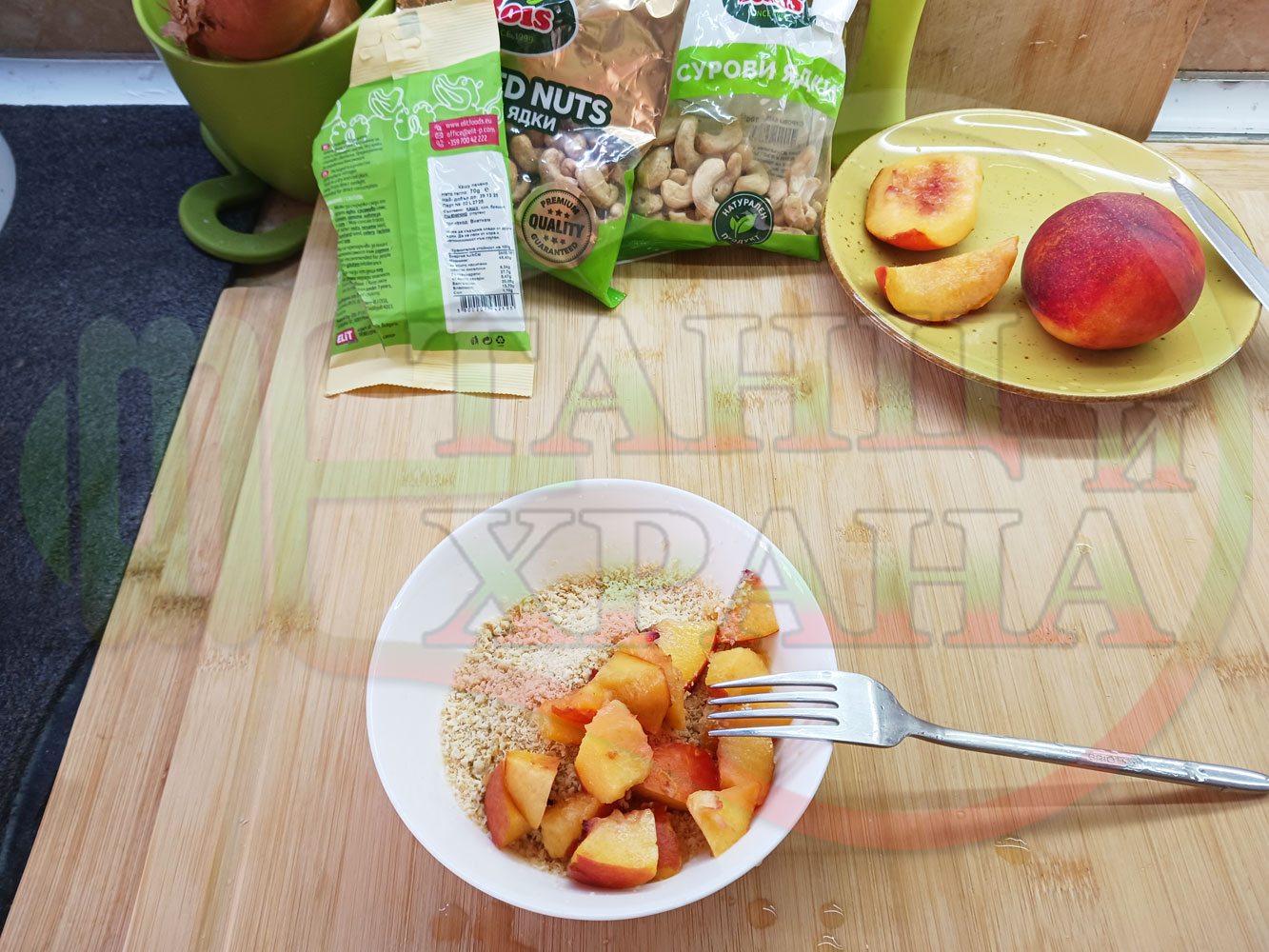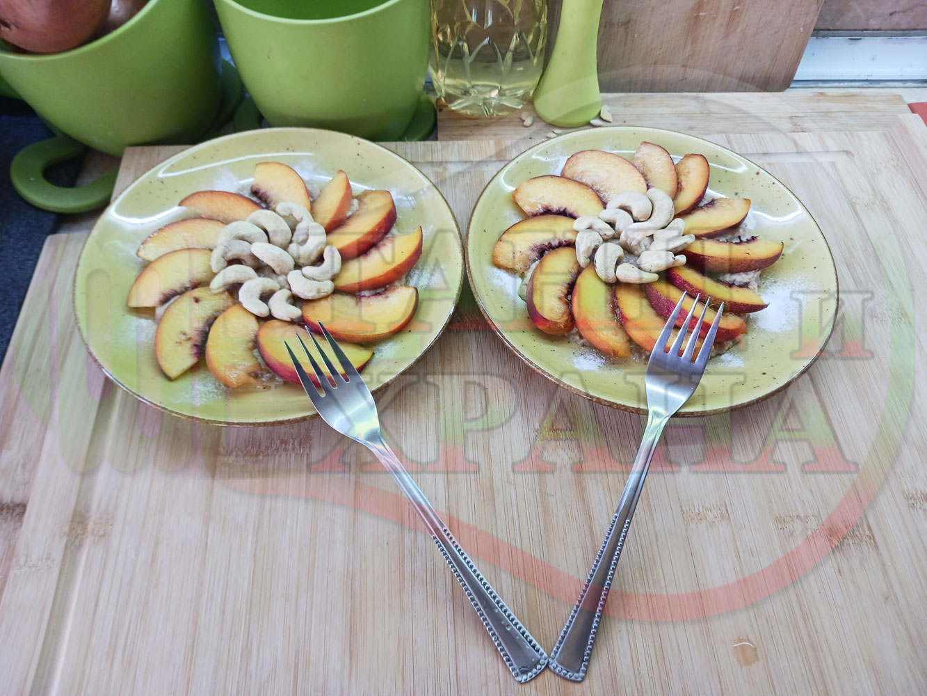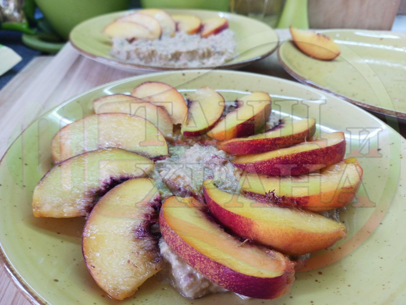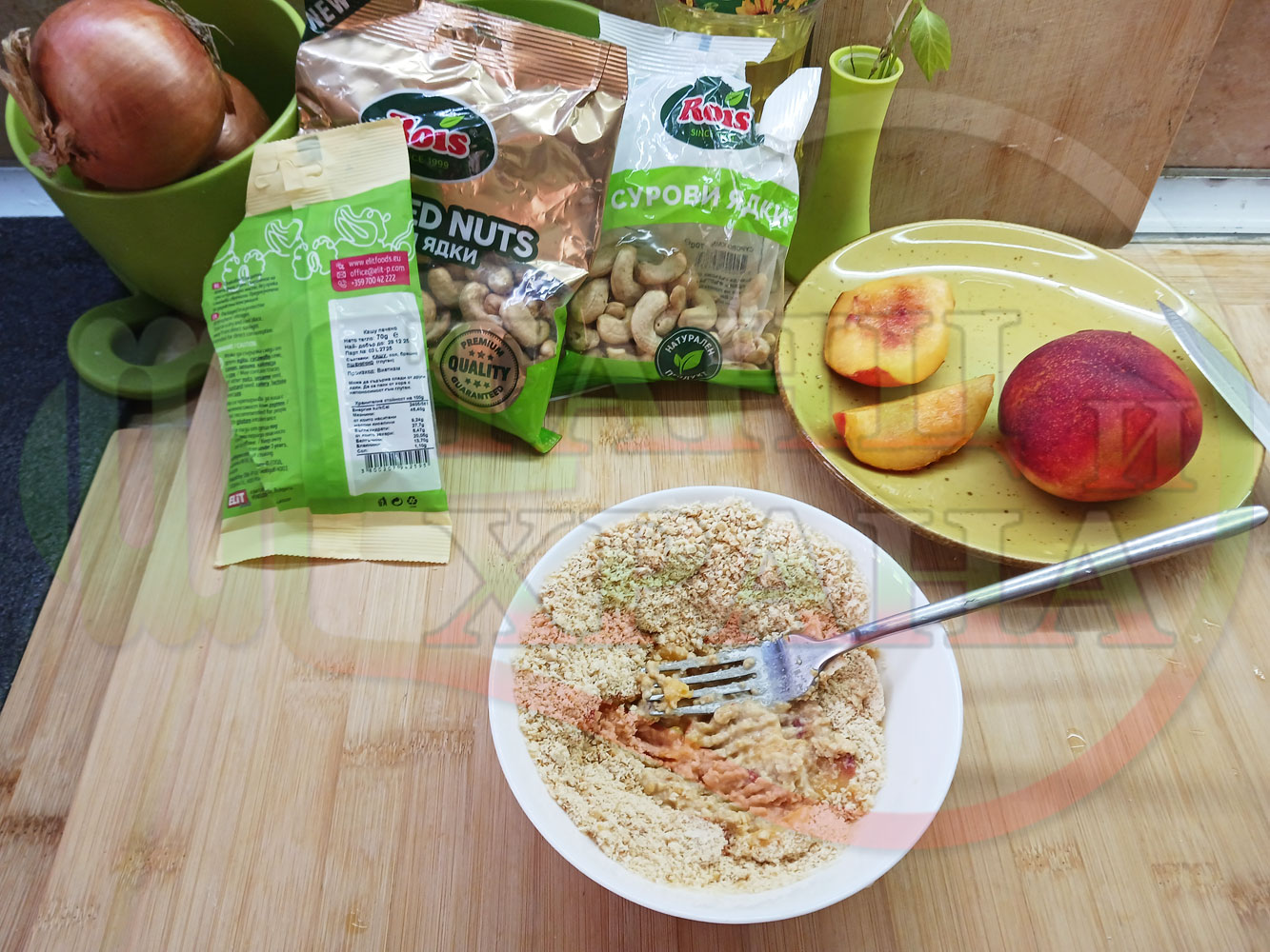 Плодова сурова салата "Прасковена кашуядкова" приготвена от плодово ядков крем с пресни праскови и настъргано печено и осолено кашу оформен като кладенчета гарнирани с резени от праскова и сурови ядки