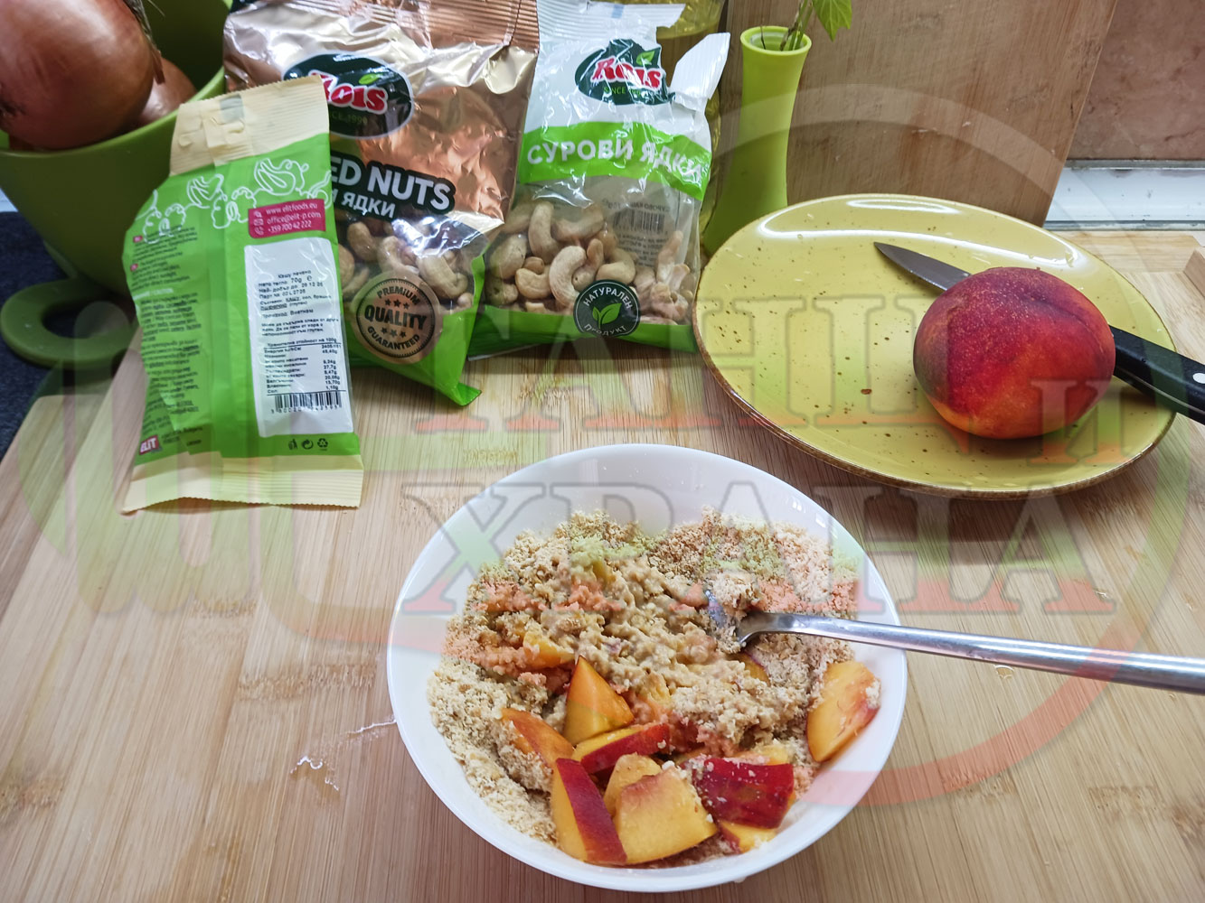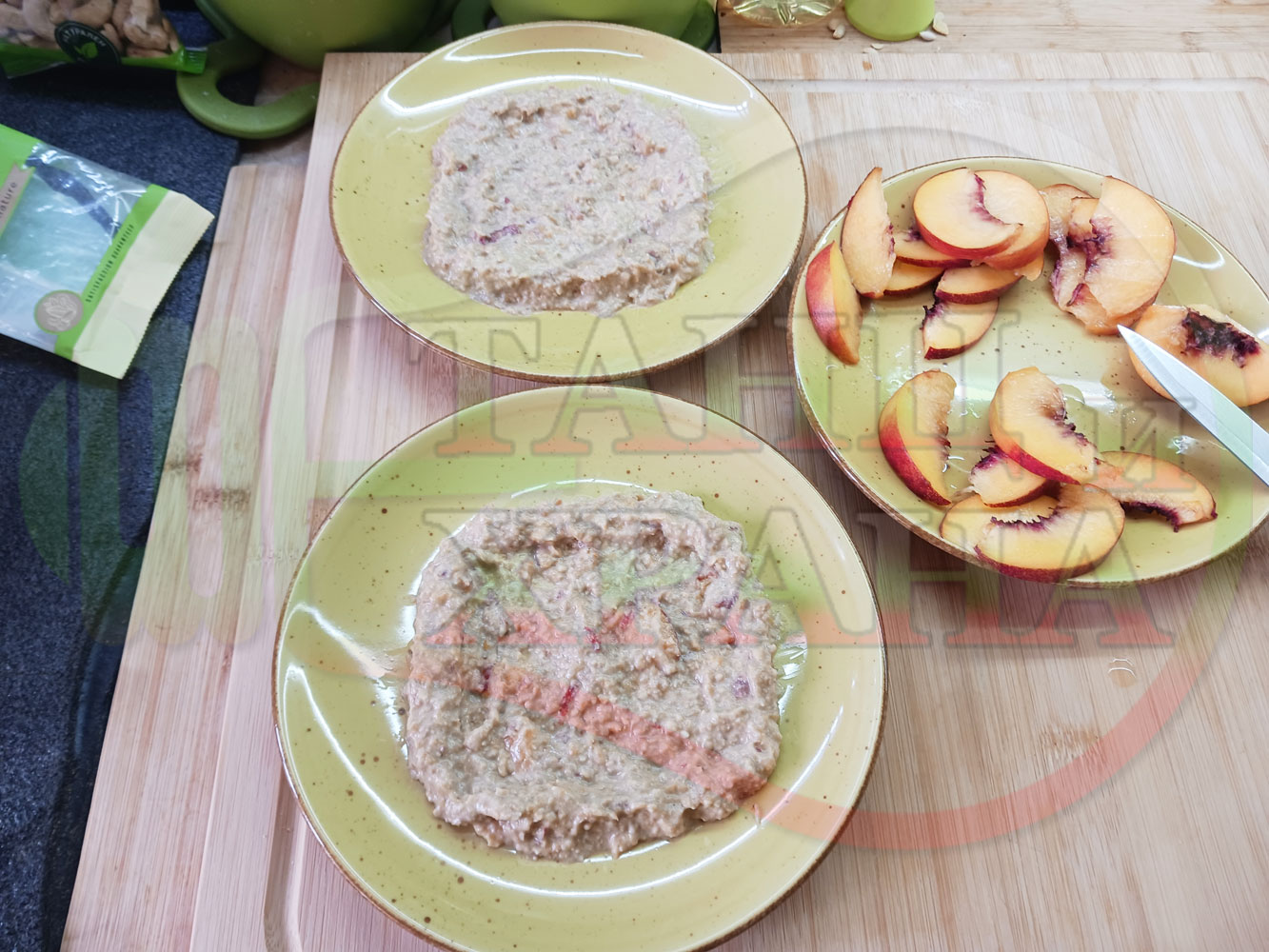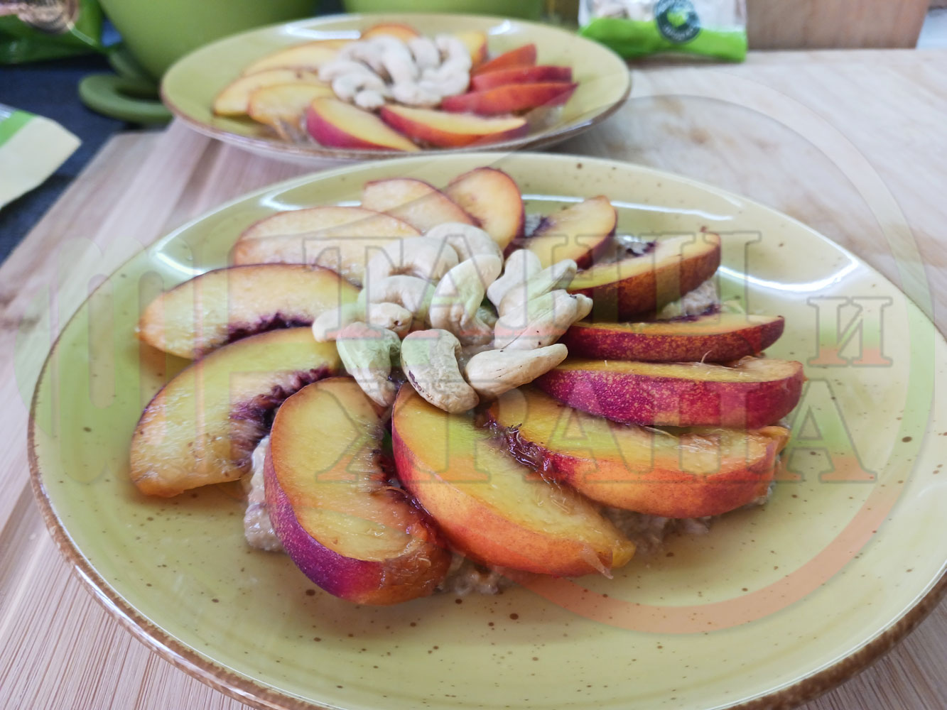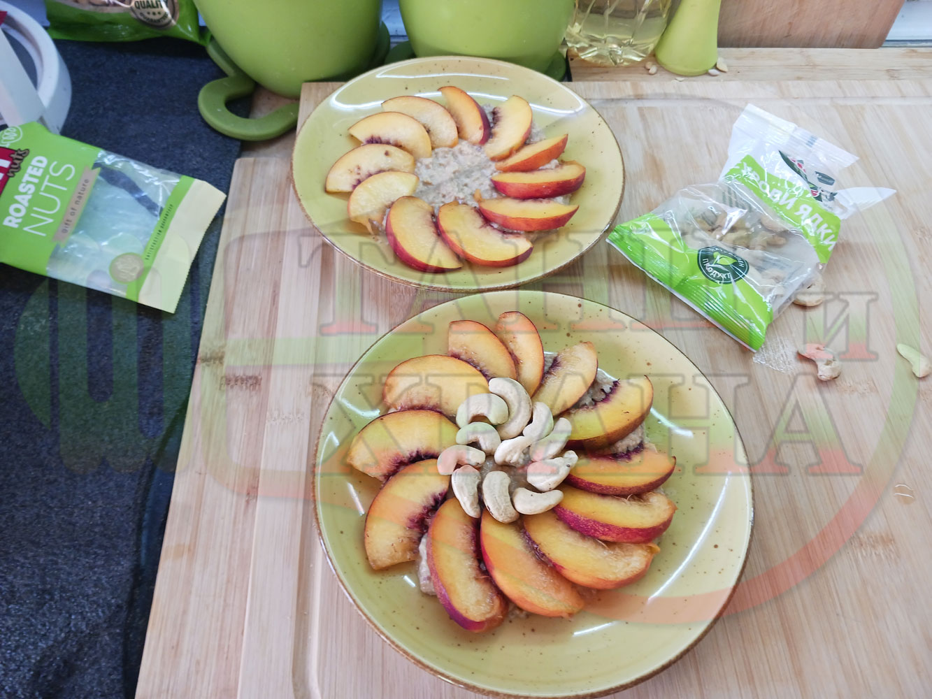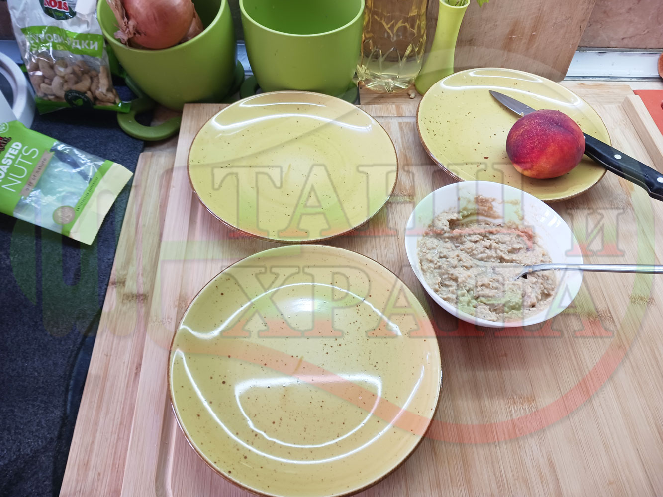 Плодова сурова салата "Прасковена кашуядкова" приготвена от плодово ядков крем с пресни праскови и настъргано печено и осолено кашу оформен като кладенчета гарнирани с резени от праскова и сурови ядки